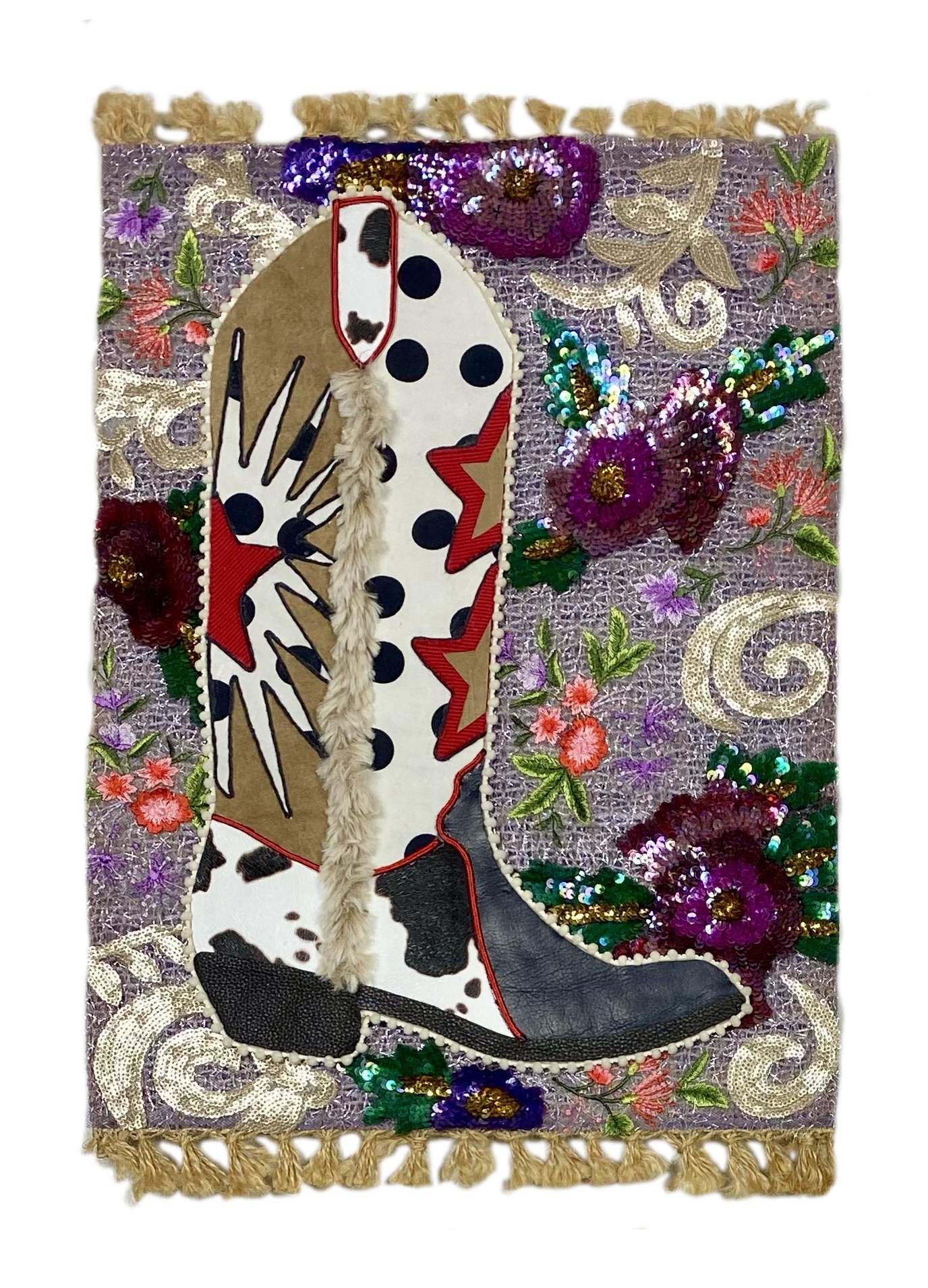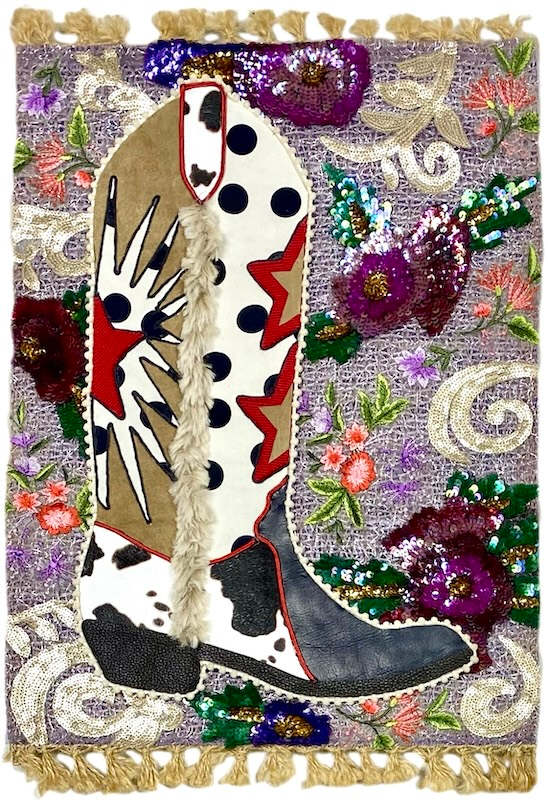 "If I Were a Cowgirl" reimagines the iconic cowboy boot as a portrait of individuality, crafted from reclaimed fabrics, clothing, and found objects on vintage jute placemats. Each boot channels a distinct personality, blending textures, colors, and histories into a playful yet soulful celebration of character. Together, they form a patchwork rodeo of identities—bold, tender, fierce, and free.