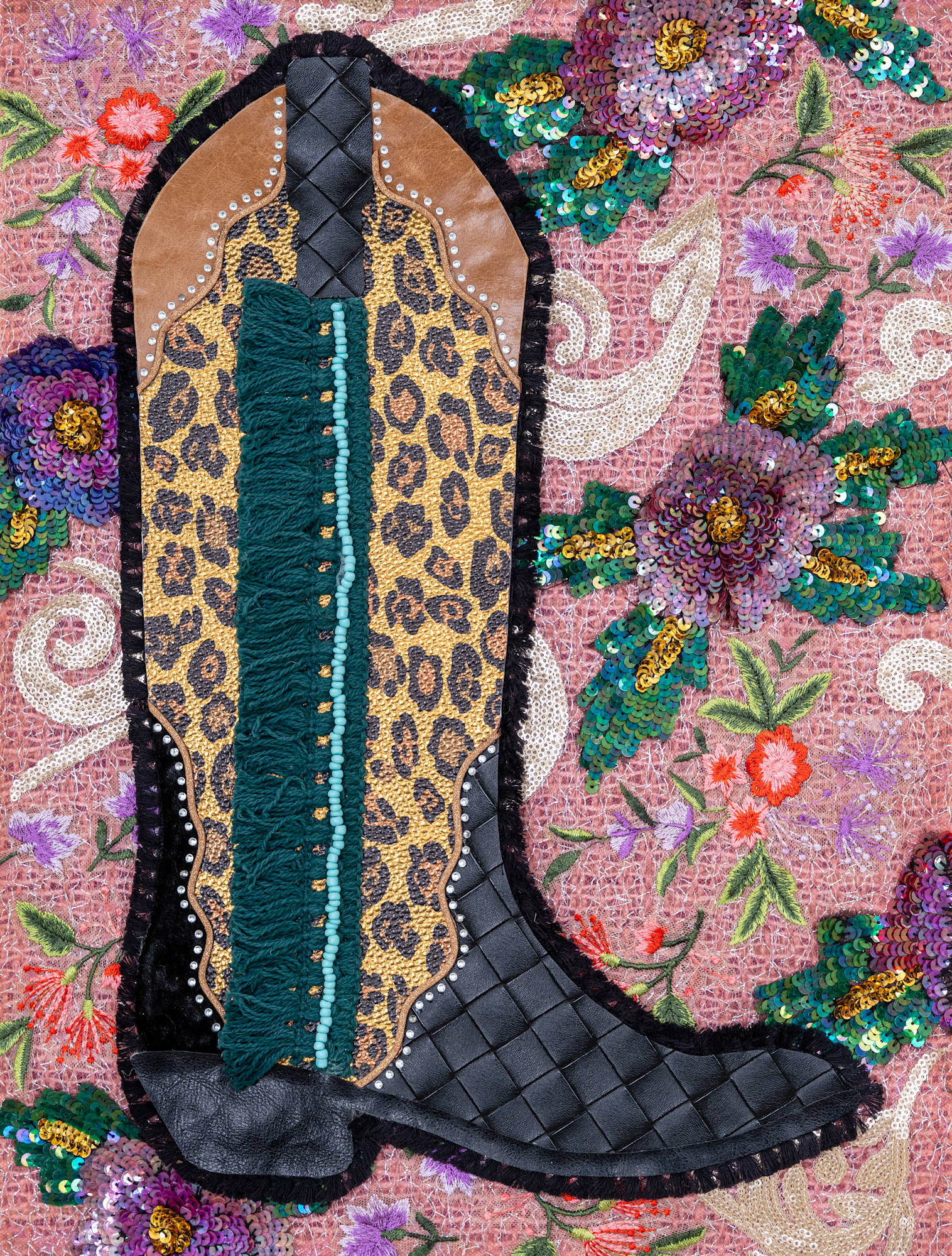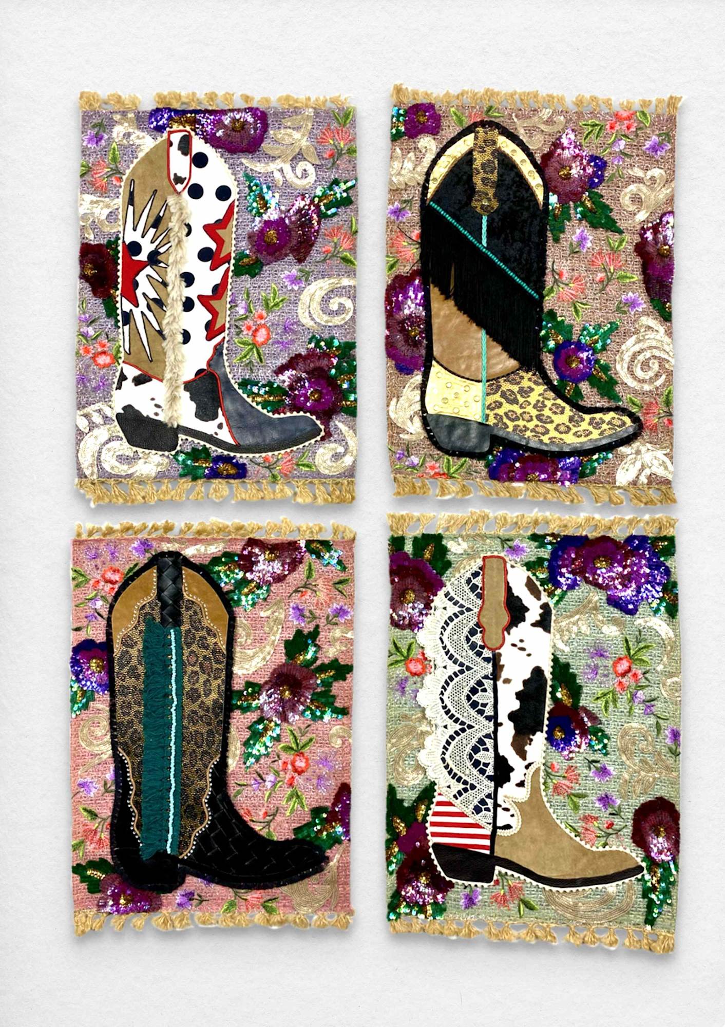 "If I Were a Cowgirl" reimagines the iconic cowboy boot as a portrait of individuality, crafted from reclaimed fabrics, clothing, and found objects on vintage jute placemats. Each boot channels a distinct personality, blending textures, colors, and histories into a playful yet soulful celebration of character. Together, they form a patchwork rodeo of identities—bold, tender, fierce, and free.