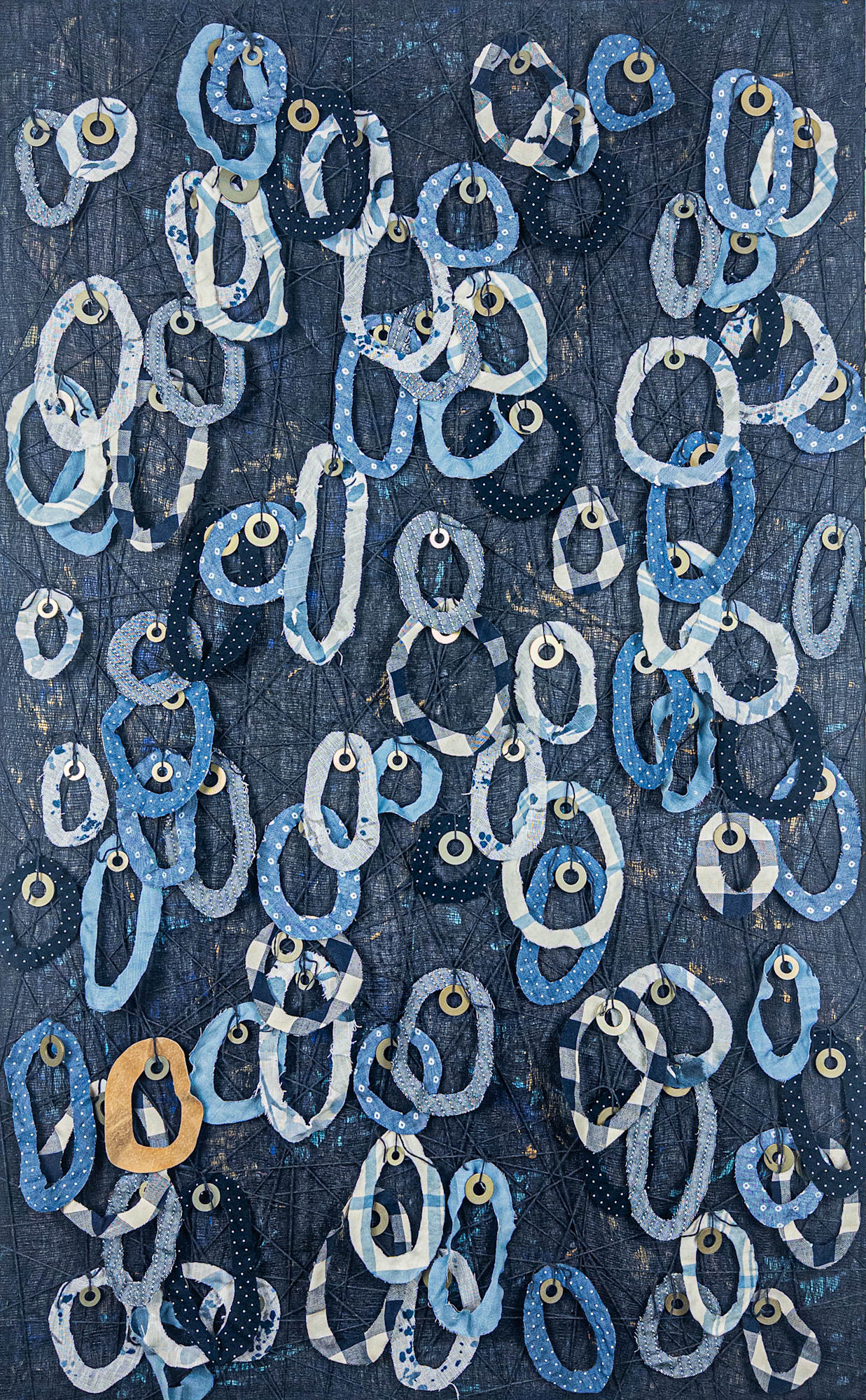Deep indigo and midnight blue settle across the surface like sky after the last light fades. Layers of dyed cheesecloth and acrylic paint create a quiet, atmospheric ground — textured like woven dusk. From this depth, suspended loops of reclaimed fabric rise and drift, each anchored with a metal washer that glimmers like a tiny moon. Together, they form a field of constellations and echoes: a night sky made of memory, fabric, and light.