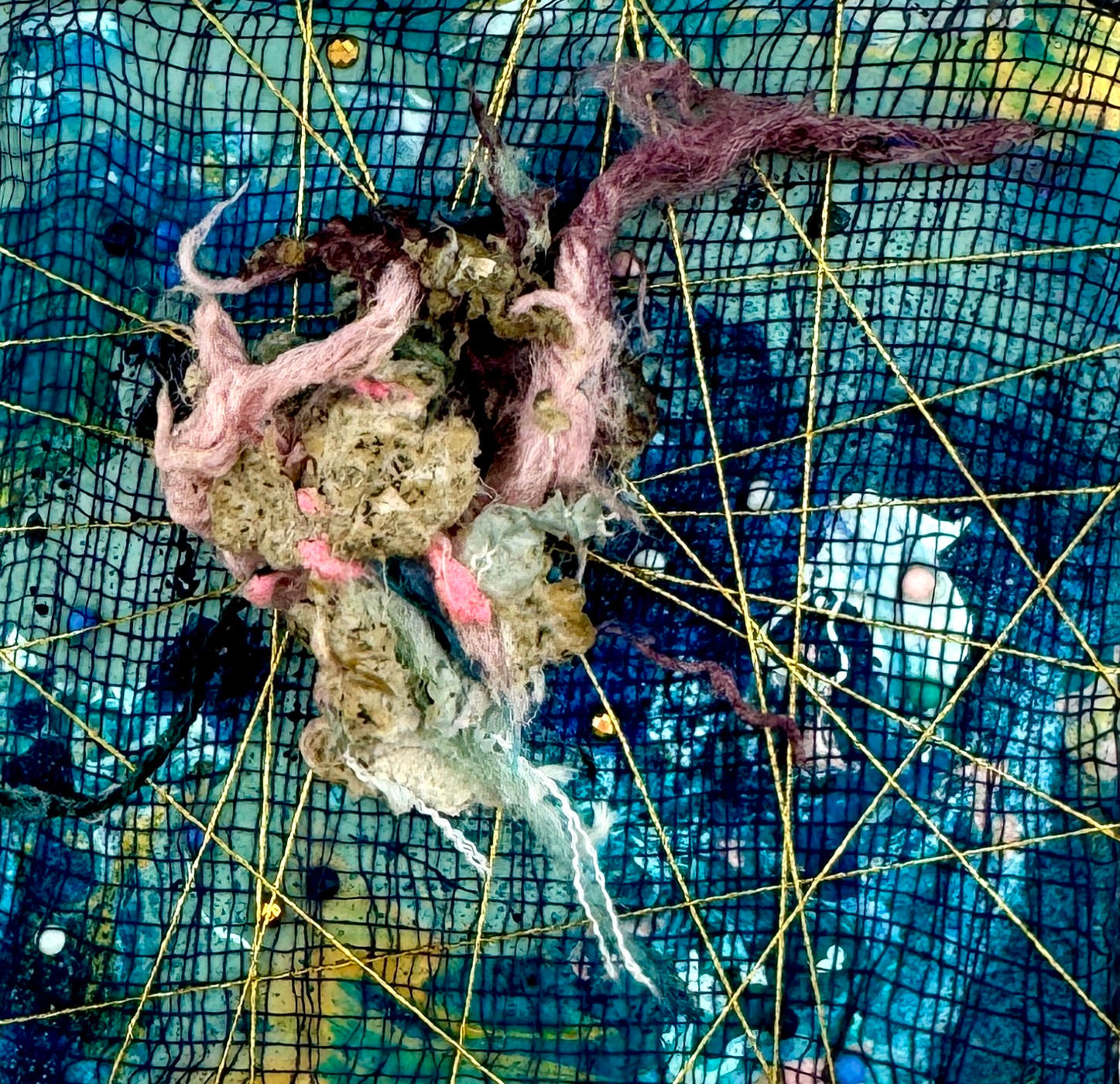 This richly textured mixed-media piece combines acrylic paint, dyed cheesecloth, and hand-formed pulp made from reclaimed books and fabrics, all layered on gallery-wrapped canvas. Bits of found objects and threads are embedded within the composition, creating a tactile surface that feels cosmic and organic. Gold thread intersects the work in sharp, radiant lines, evoking constellations or energetic maps. The result is an abstract landscape that hints at memory, entropy, and the quiet magic of transformation through time and touch.