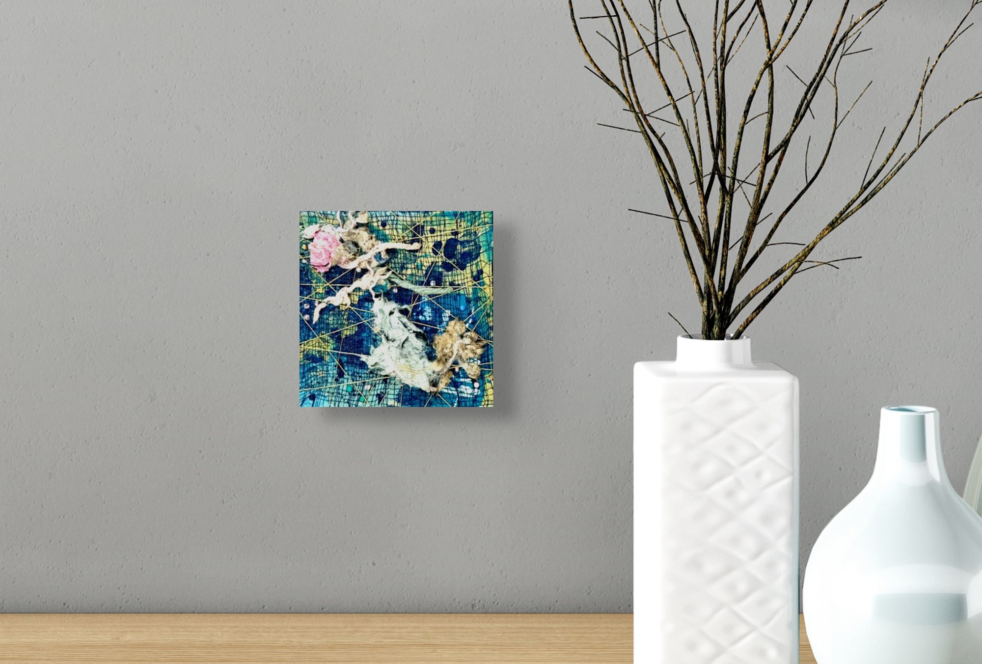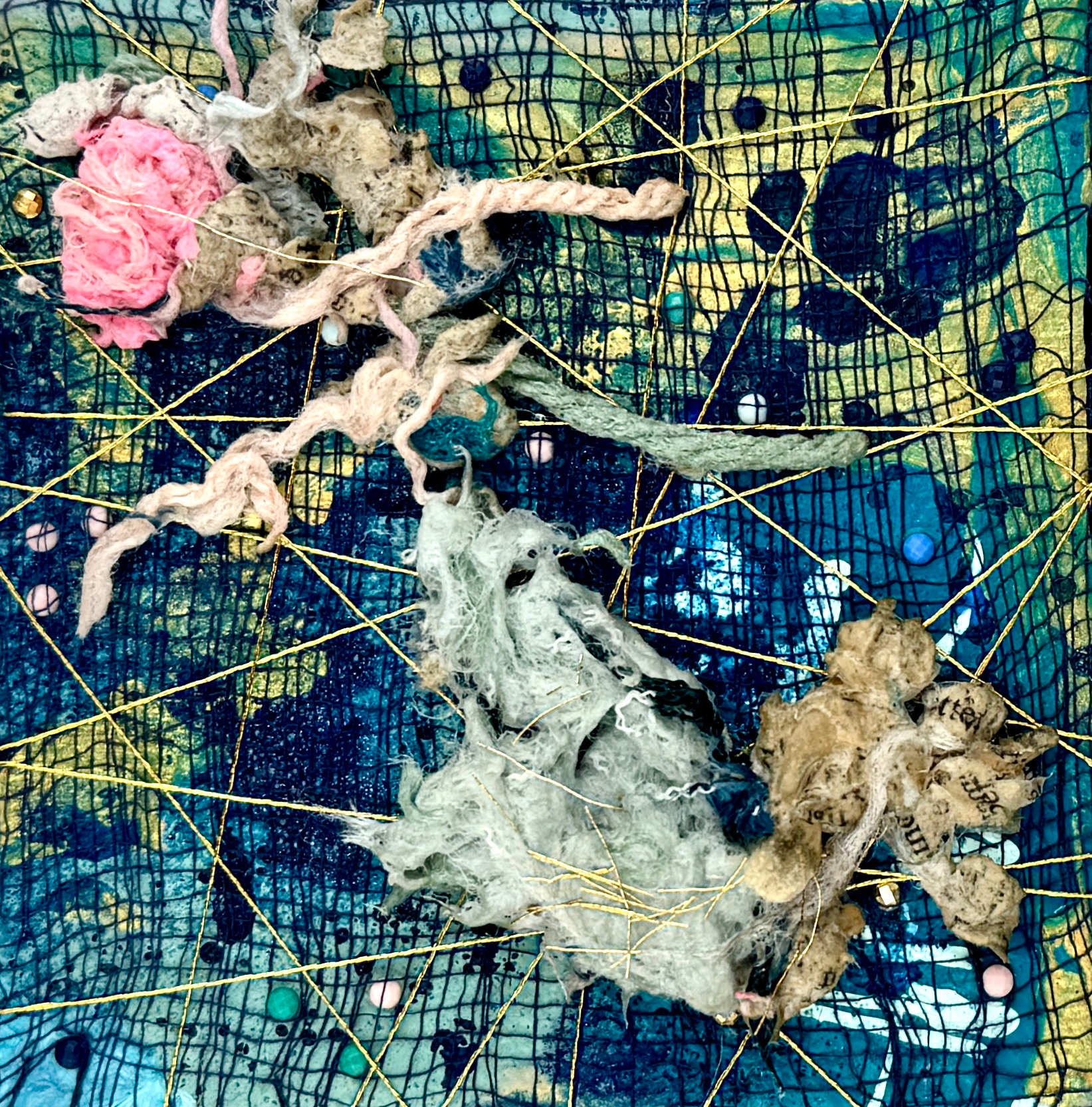This richly textured mixed-media piece combines acrylic paint, dyed cheesecloth, and hand-formed pulp made from reclaimed books and fabrics, all layered on gallery-wrapped canvas. Bits of found objects and threads are embedded within the composition, creating a tactile surface that feels cosmic and organic. Gold thread intersects the work in sharp, radiant lines, evoking constellations or energetic maps. The result is an abstract landscape that hints at memory, entropy, and the quiet magic of transformation through time and touch.