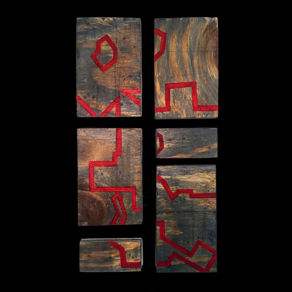 Wood is laid out to give the illusion of a boarded-up house in Baltimore. The red line was incorporated to show the actual redlining map of Baltimore dating back to 1937.