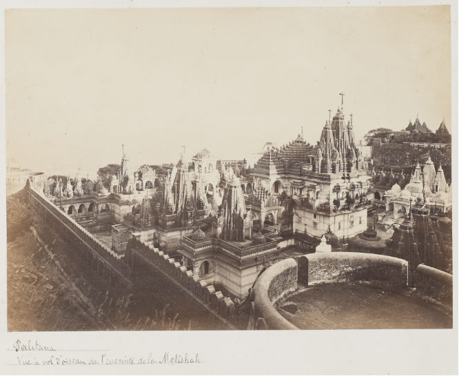 Shatrunjaya, one of the most revered sites for the Jains is mentioned in texts since the 5th century but gained prominence in medieval literature which is also when Jains started to build temples at the twin peaks of Shatrunjaya. This temple city houses more than a thousand shrines, built and rebuilt over time. Shatrunjaya holds a special place for Jains because of its close affinity with the first Jina, Adishvar, popularly called Adibuddhaji (i.e Rishabha). It is believed that he delivered his first sermon at Shatrunjaya followed by many others. Apart from featuring in large scale cloth paintings, Shatrunjaya was avidly photographed and painted by British artists. Marianne North, a Victorian artist well-known for her landscapes and botanical paintings, traveled from southern to northern India from 1877 to 1879. Edmund David Lyon, a British photographer took almost 300 photographs of temples and other sites for the Madras and Bombay presidencies of the British Raj.