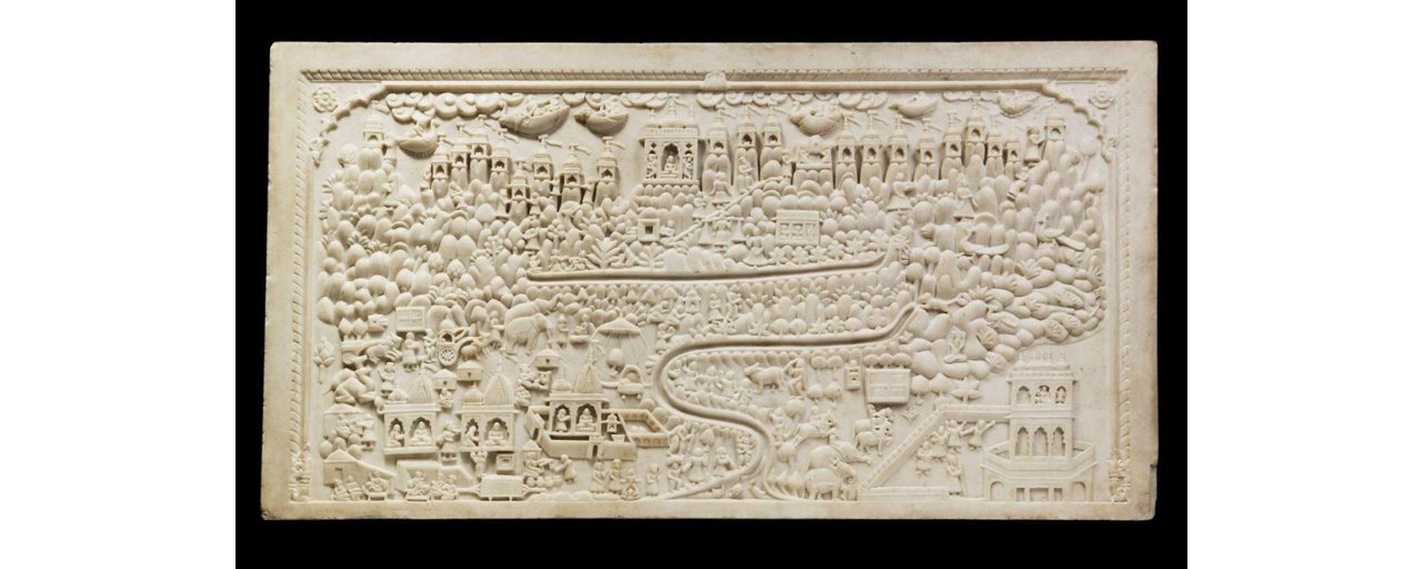 This relief depicts yet another representation of Sammeta Shikhara. A winding path leads the pilgrims to hill shrines from the base of the mountain that itself is dotted with palanquins and carriages. The temples depicted on the lower left of the panel were sponsored by Shvetambaras and date to the reign of the Mughal emperor Akbar (r. 1556-1605).