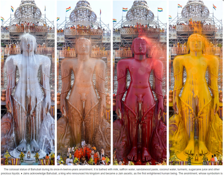 The Jain site of Shravanabelagola is renowned for its 58.8-foot tall monolithic statue of Bahubali, a warrior turned ascetic who renounced the world and performed austerities in the kayotsarga position and achieved liberation. The statue, erected in 983, is anointed every twelve years in a ceremony attended by scores of Jain pilgrims from throughout India. These photos from the most recent “Grand Consecration” in 2018 show the statue being anointed with various colored liquids (milk, saffron watered, sandalwood paste, coconut water, turmeric etc) poured from a scaffolding erected for the occasion.