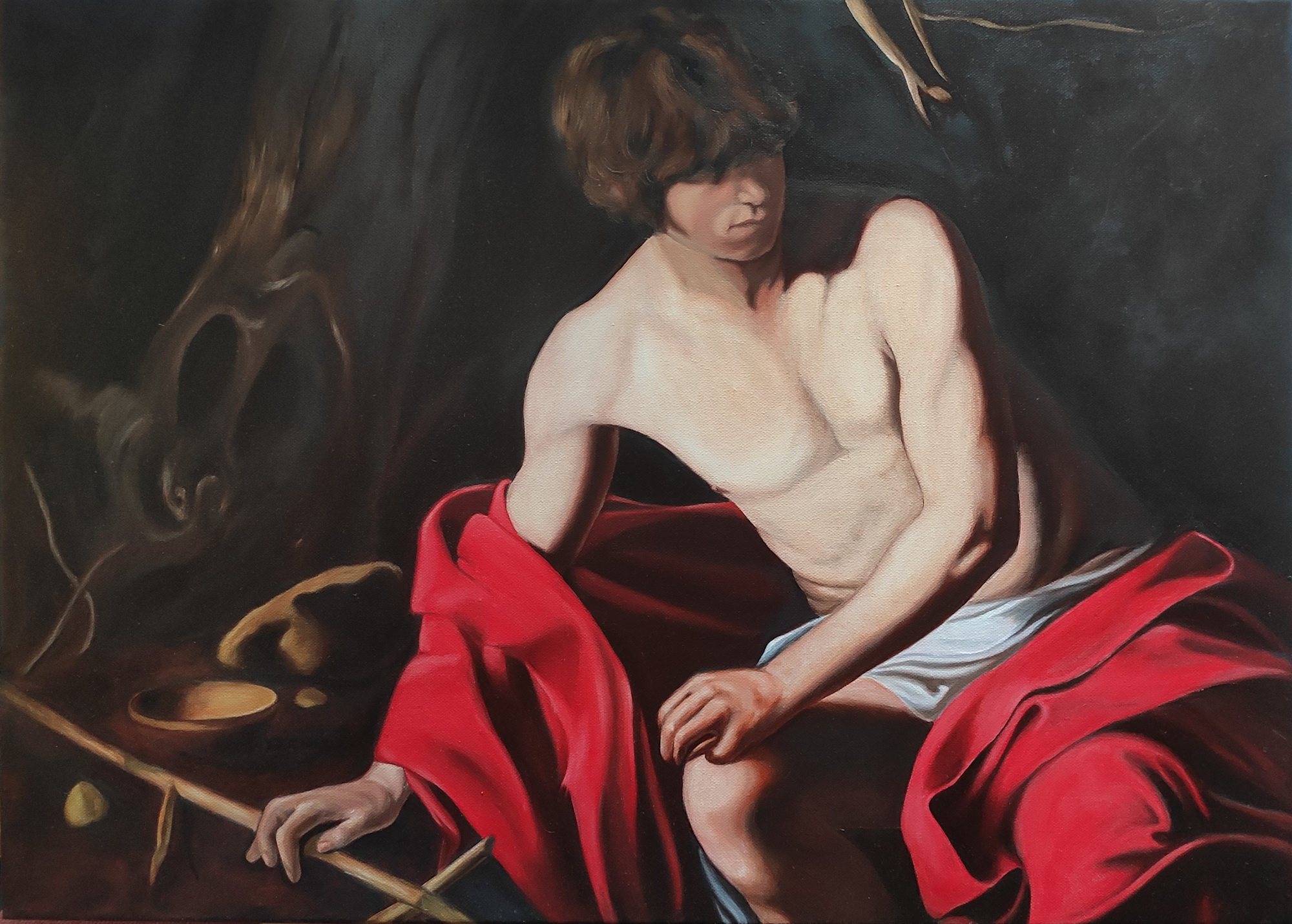 This copy engages with Caravaggio’s striking depiction of John the Baptist, seated in shadow and wrapped in a vivid red drapery. The painting highlights Caravaggio’s dramatic chiaroscuro, his naturalistic rendering of the human body, and the psychological tension between light and darkness. Through this study, I explored the intensity and immediacy that define Caravaggio’s approach to religious subjects.