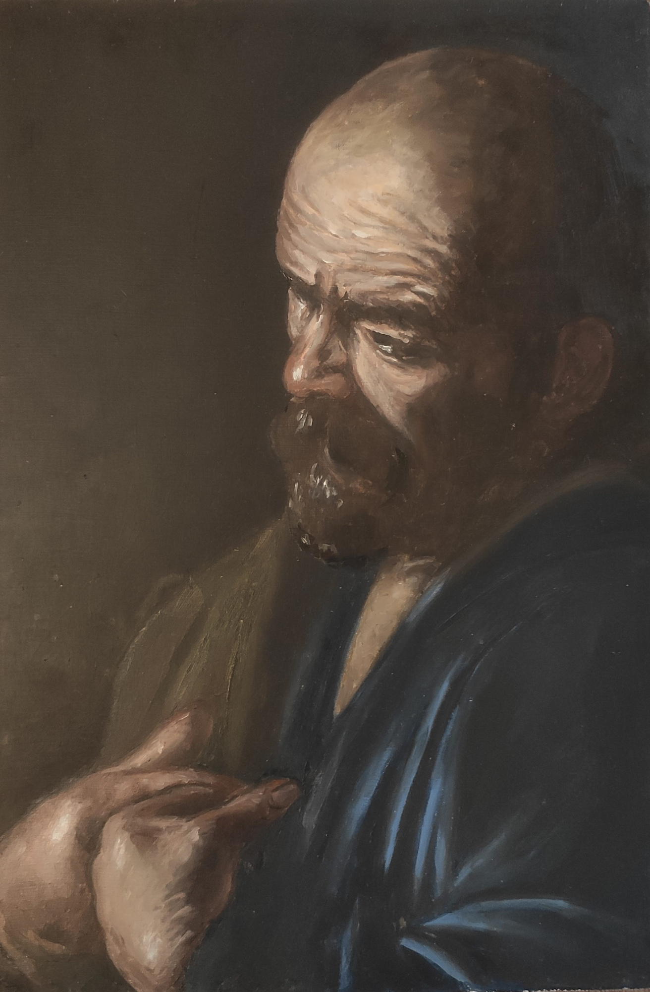 This study focuses on a single figure from Caravaggio’s dramatic composition, isolating the expressive head and hand. By copying this section, I examined Caravaggio’s mastery of chiaroscuro, his rendering of age and character through light, and the intensity of gesture that conveys inner conflict.