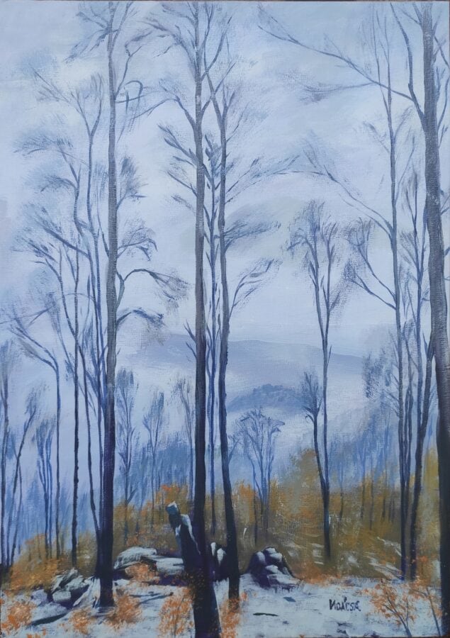 Painted after a family excursion on December 2022, this work captures the quiet, misty atmosphere of a winter day just before Christmas. The tall, bare trees rise into a foggy sky, their silhouettes softened by the cold haze. The muted blues and greys contrast with hints of earthy tones on the ground, evoking both stillness and solitude in the forest at Dobogókő.