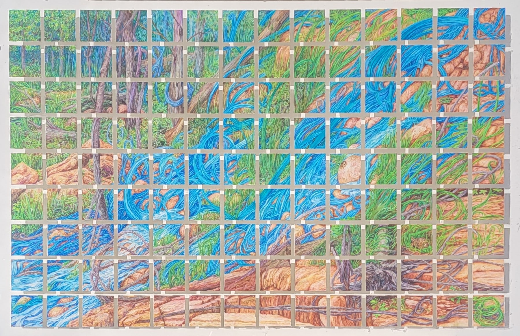 Audra translates familiar landscapes into mind bending abstract experiences with layers of movement, details, illusions, fragmentation and complexity.