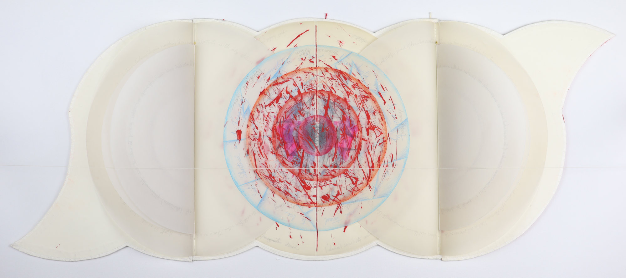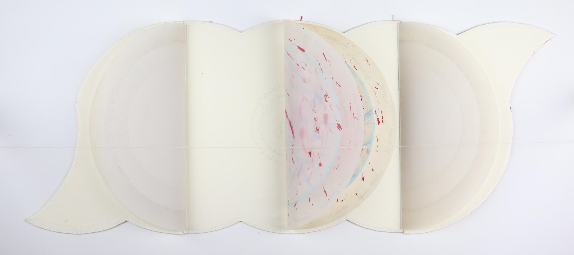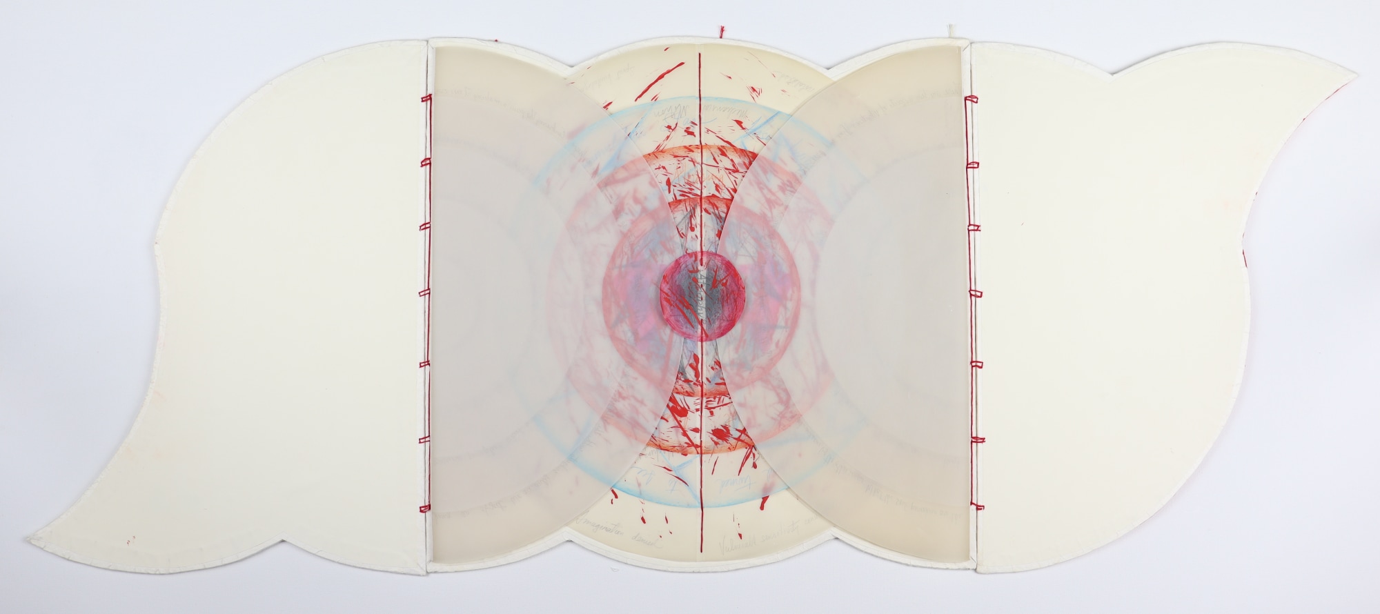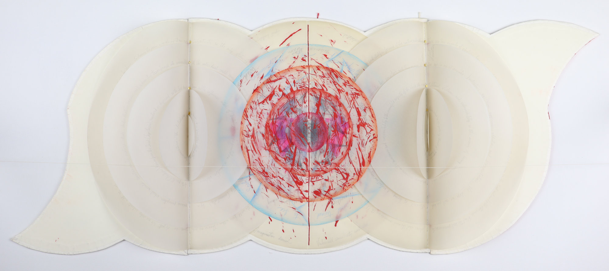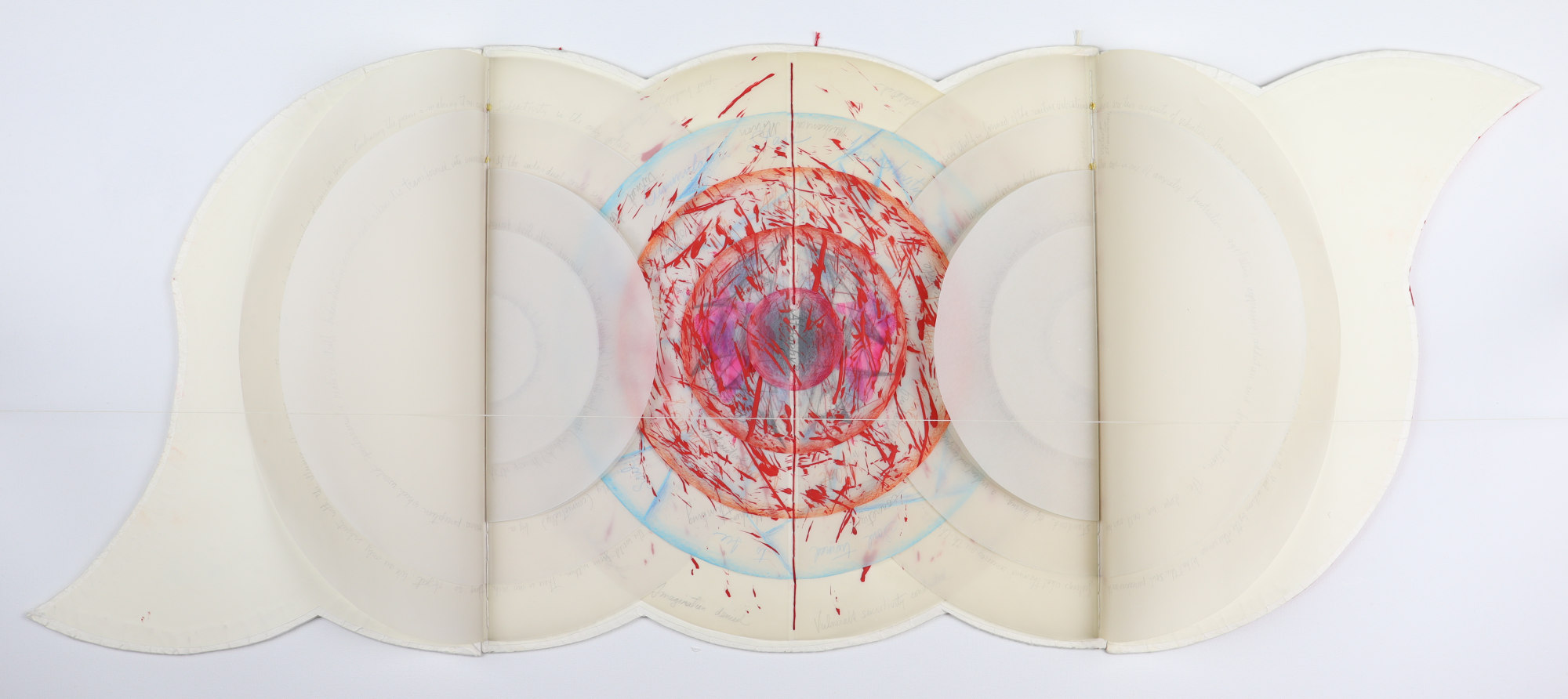 Hand made and bound artist book with unfolding vellum pages of text and abstract image combined.