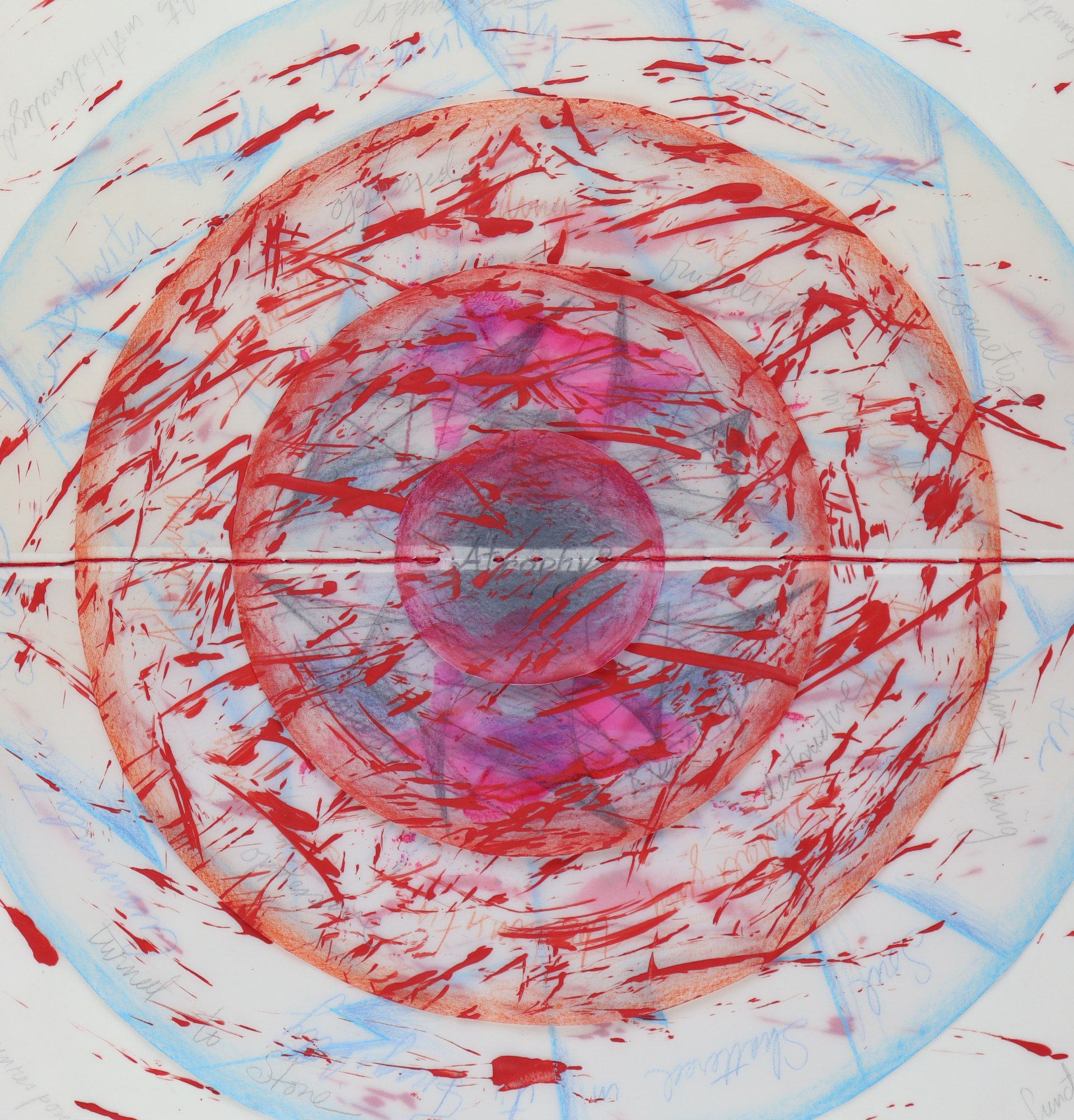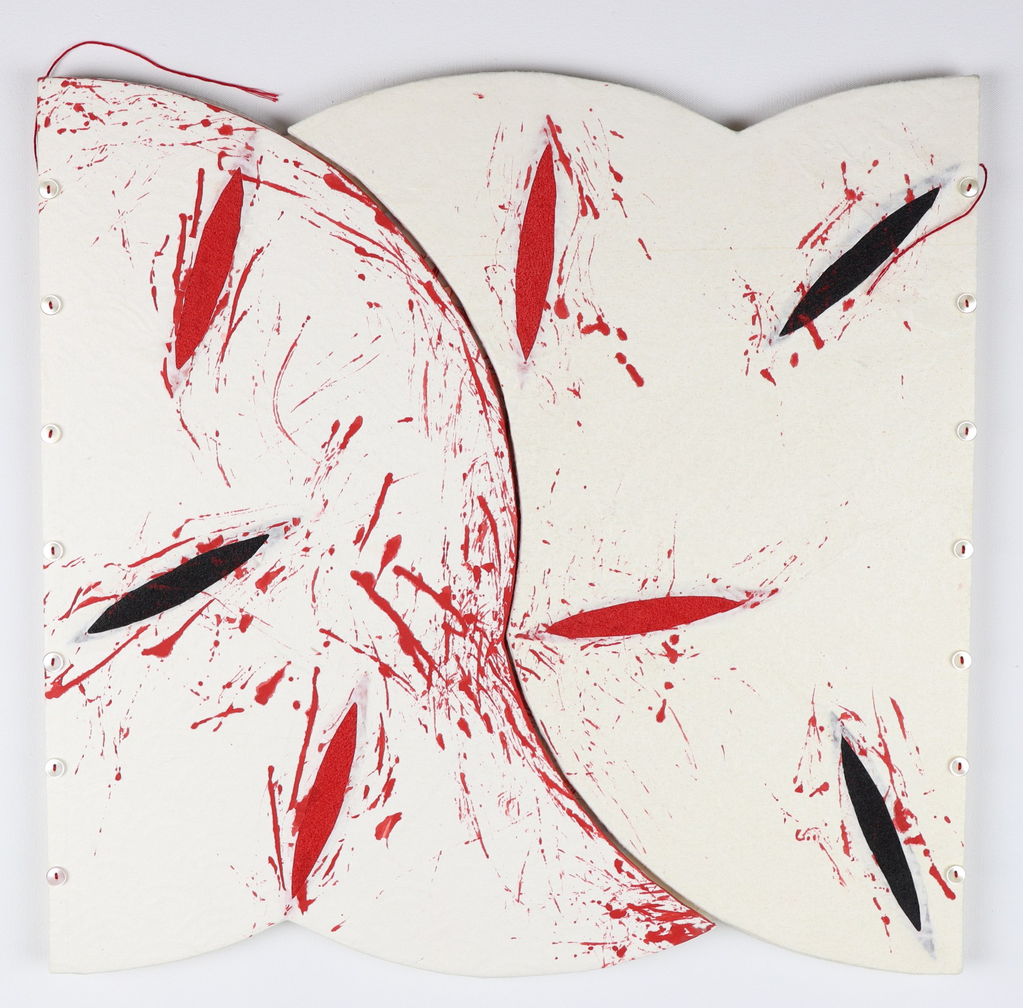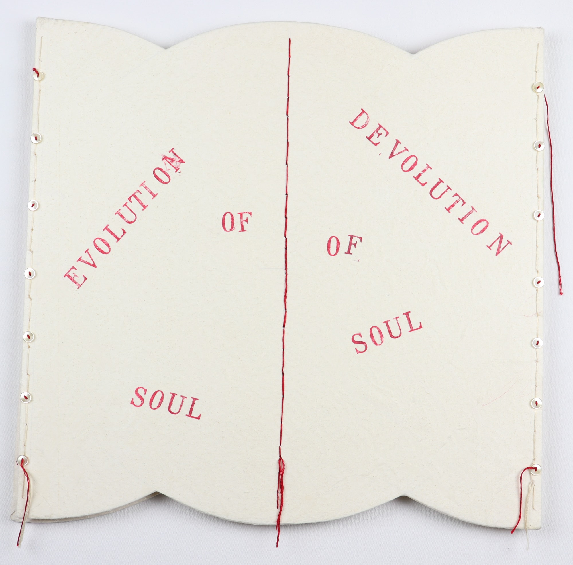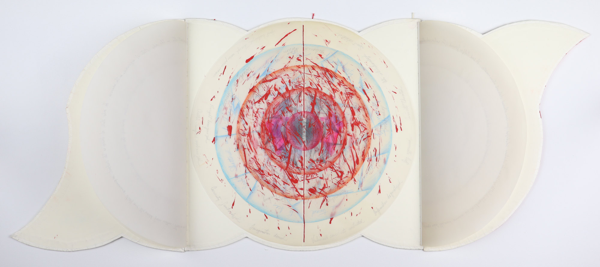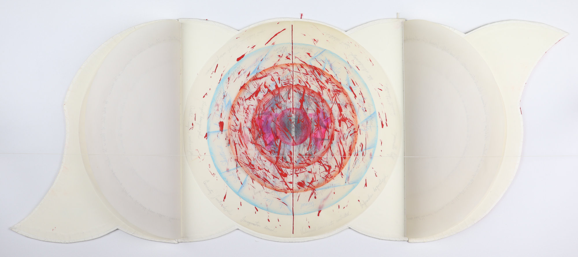 Hand made and bound artist book with unfolding vellum pages of text and abstract image combined.
