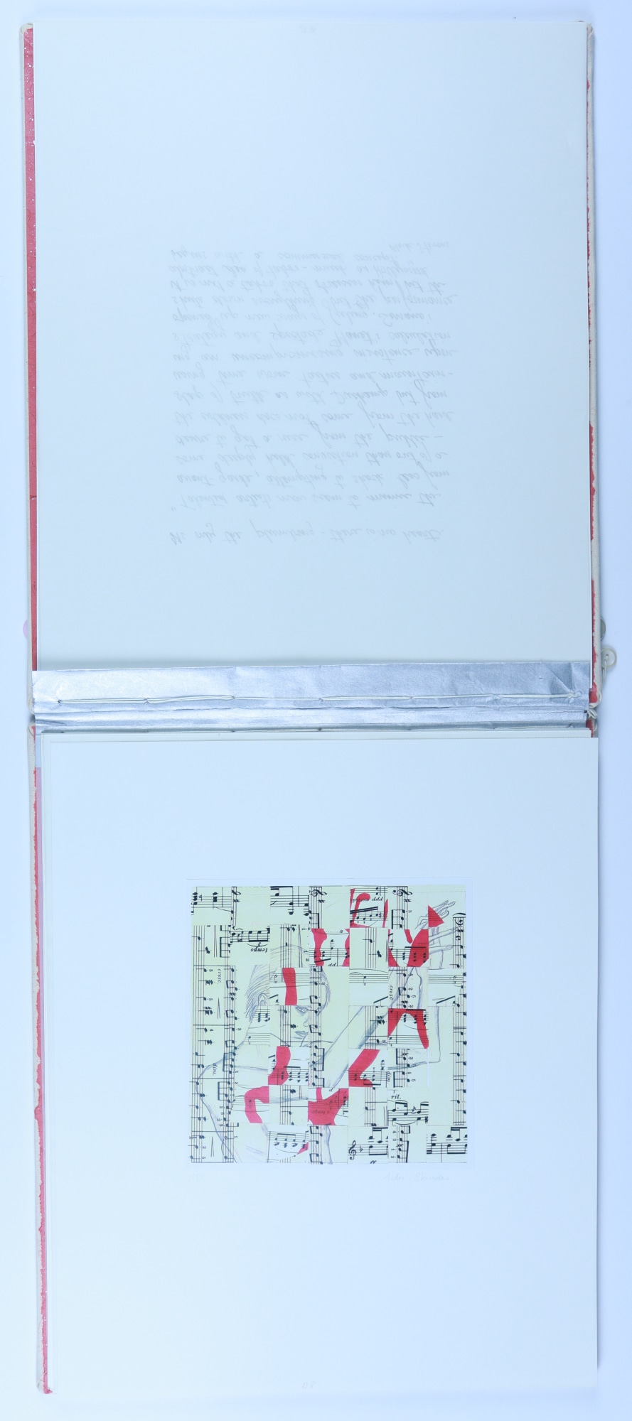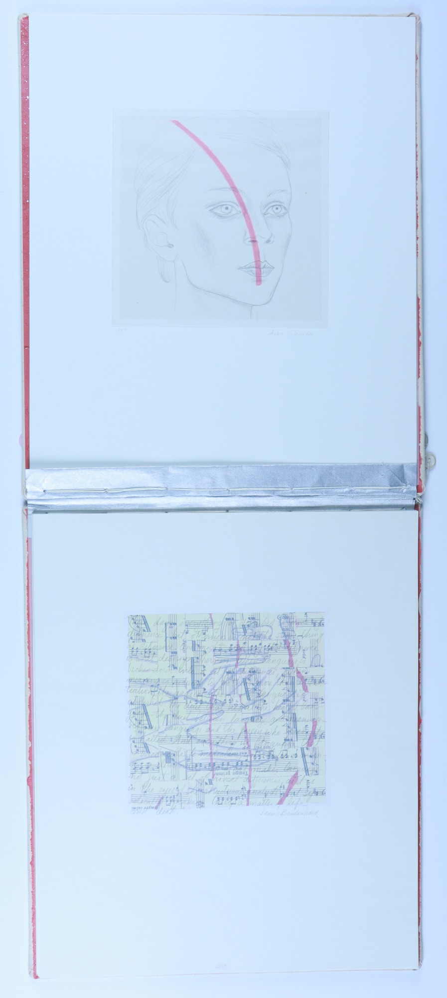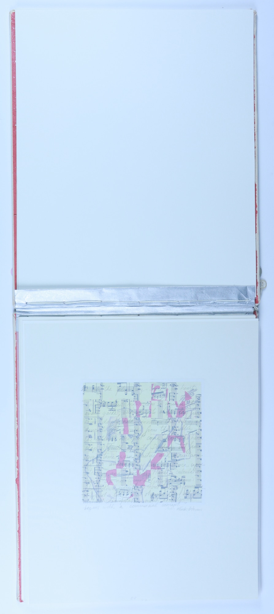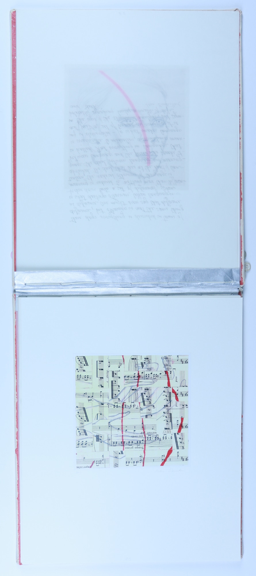Archival paper, vellum, ink, graphite pencil, acrylic paint, fabric, thread, buttons, musical score
