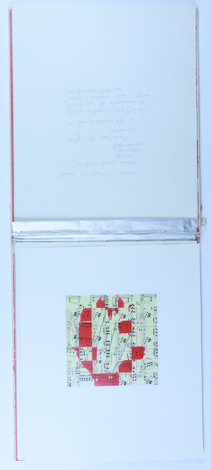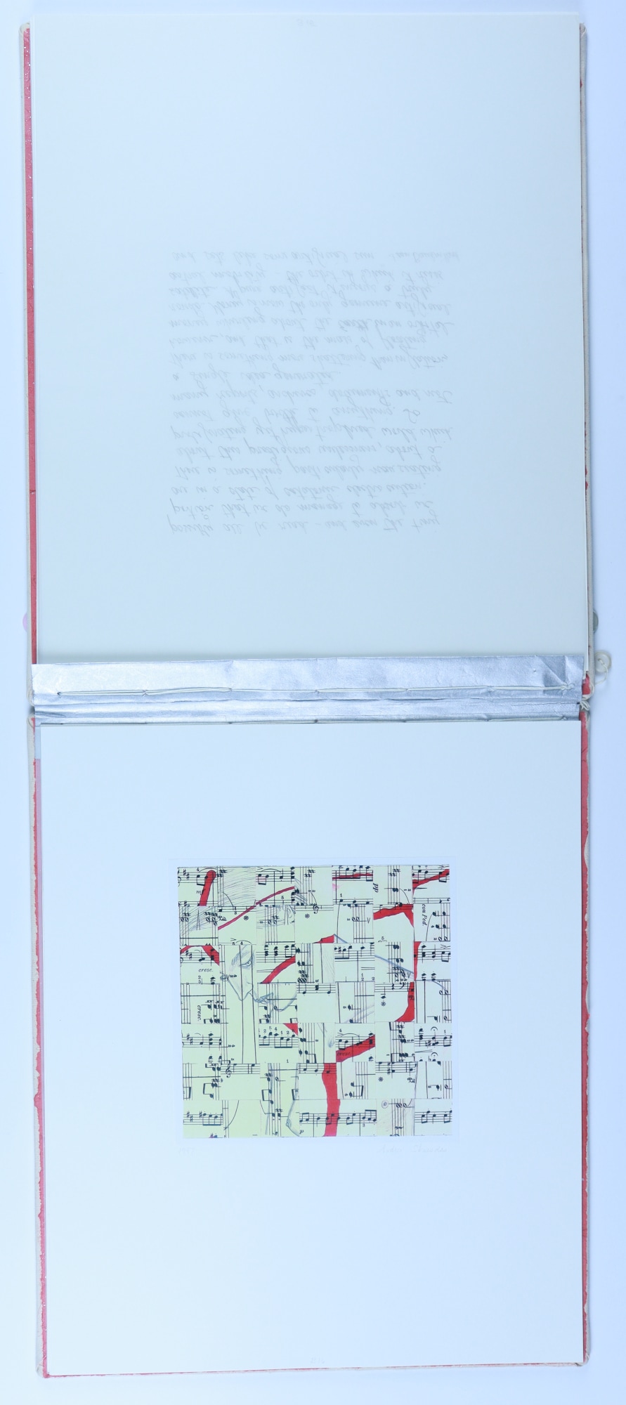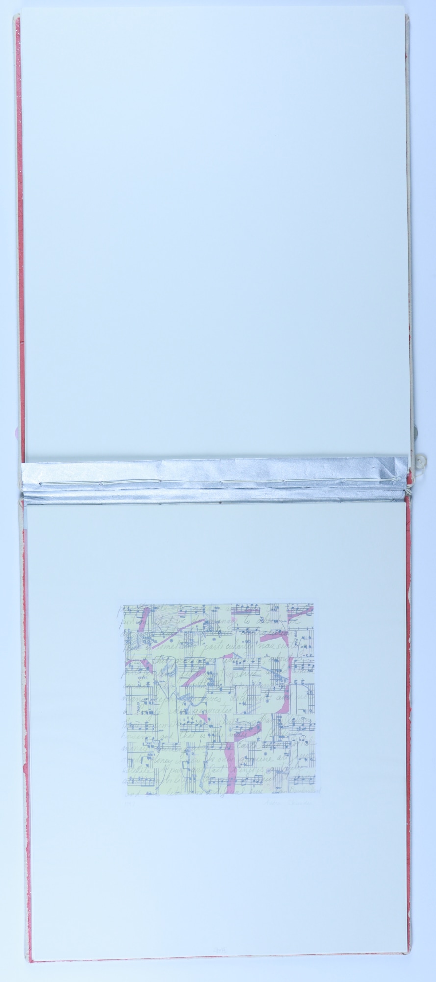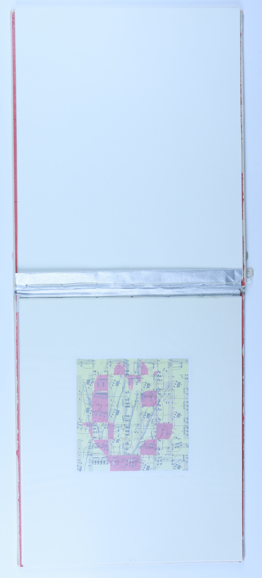 Archival paper, vellum, ink, graphite pencil, acrylic paint, fabric, thread, buttons, musical score