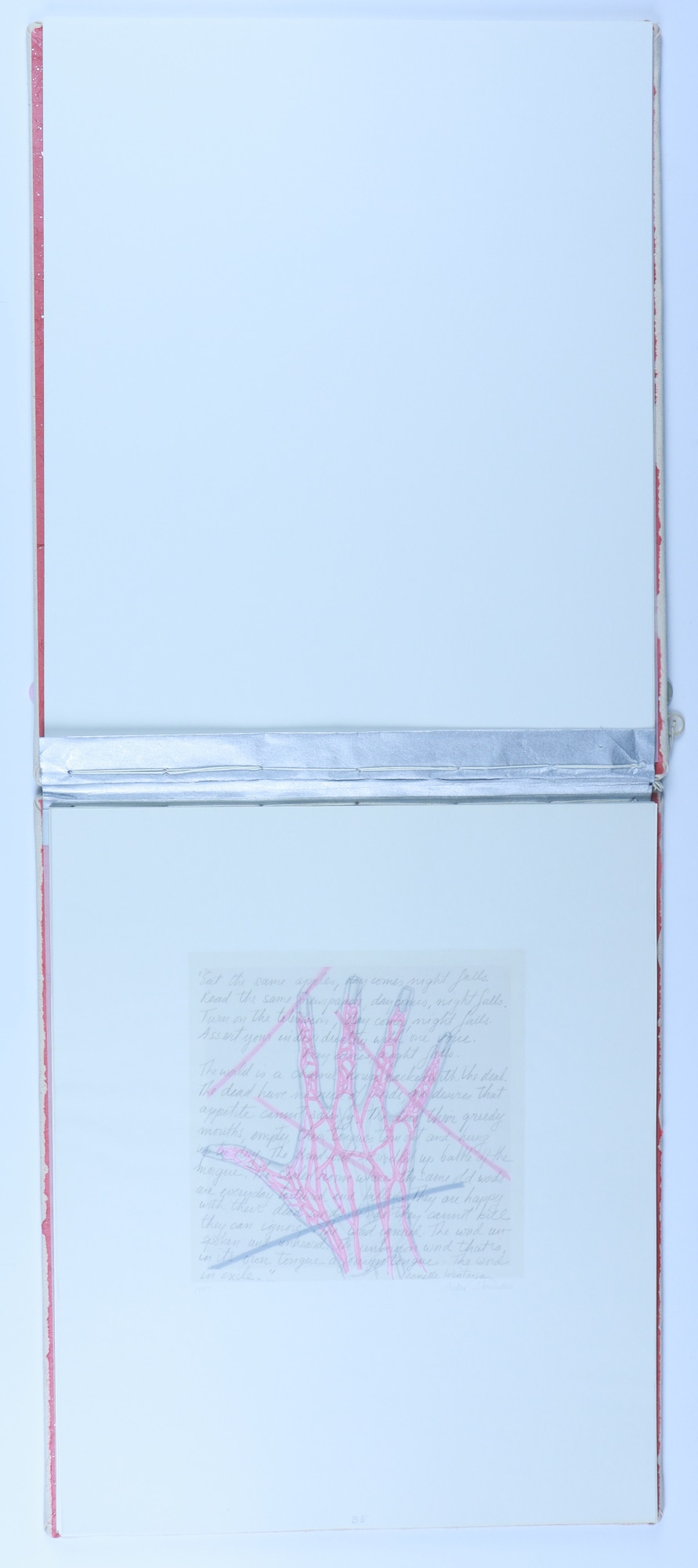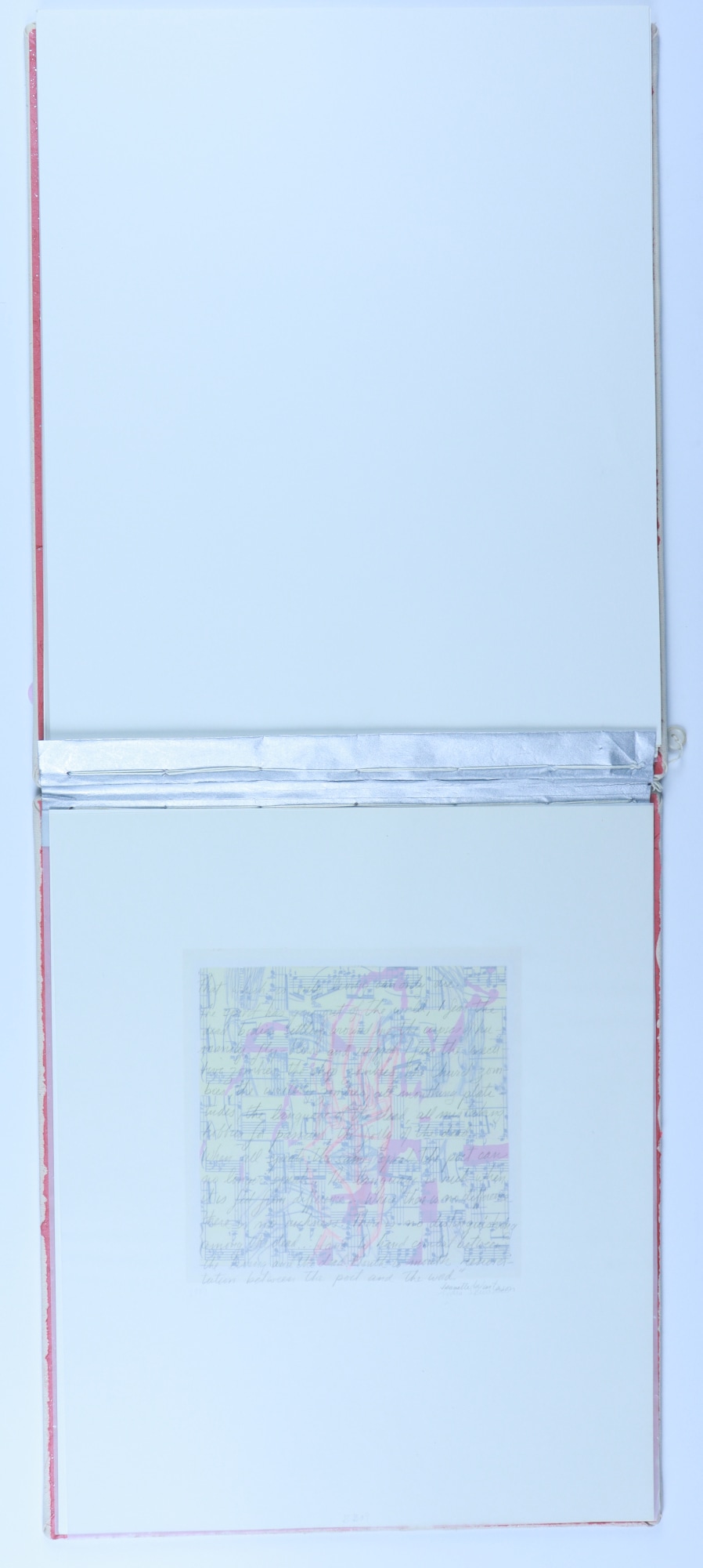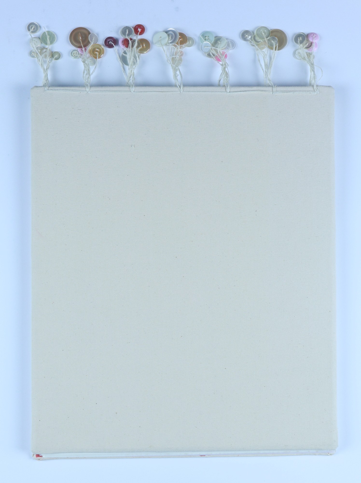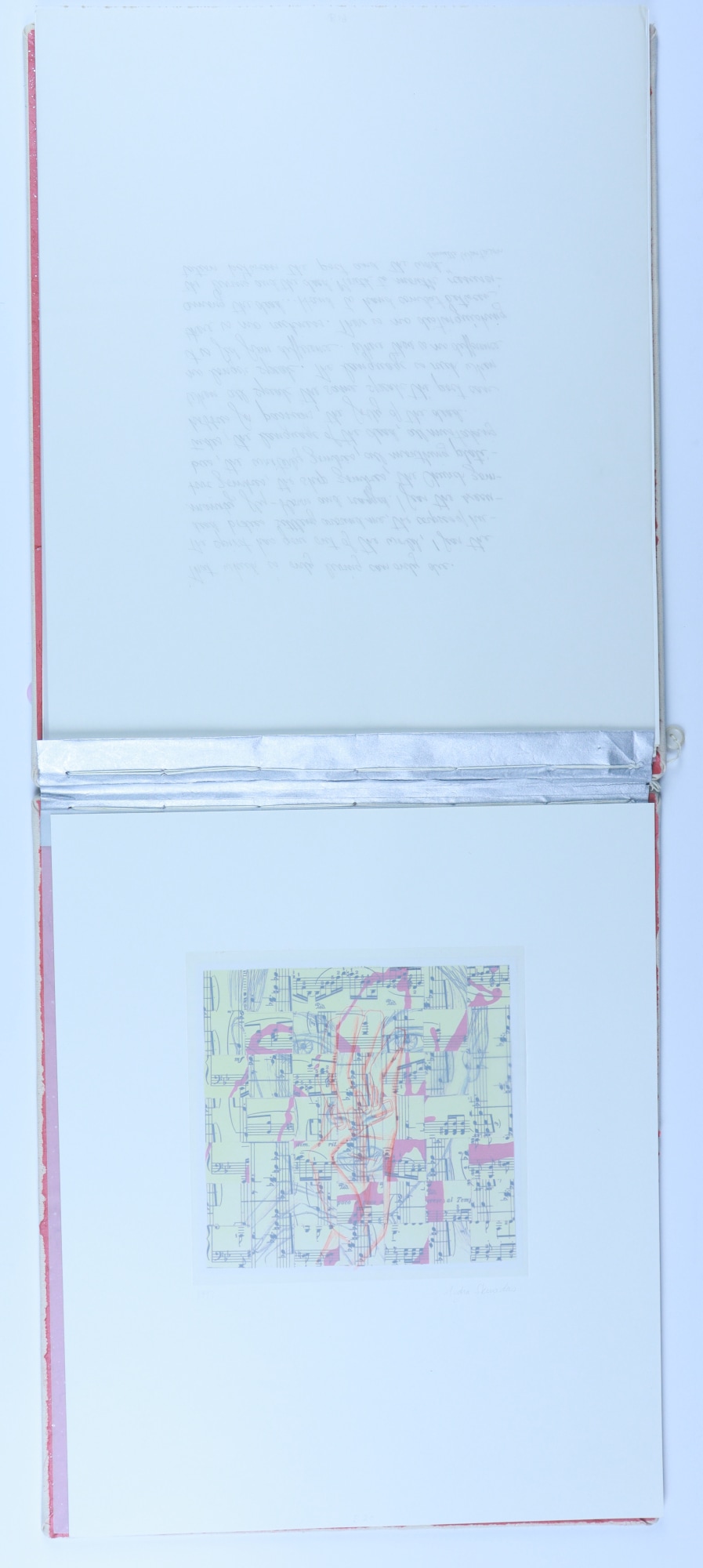 Archival paper, vellum, ink, graphite pencil, acrylic paint, fabric, thread, buttons, musical score