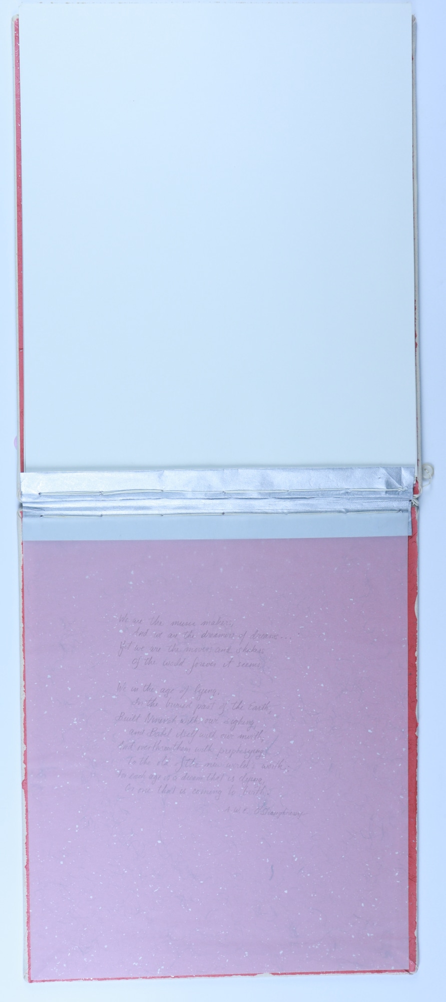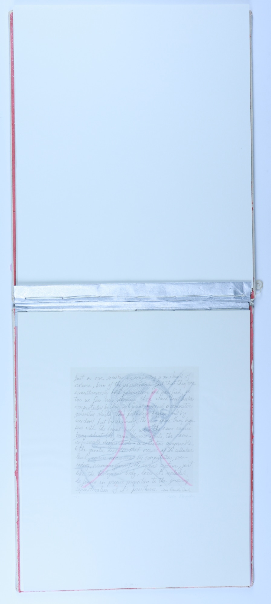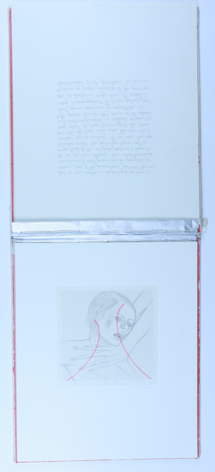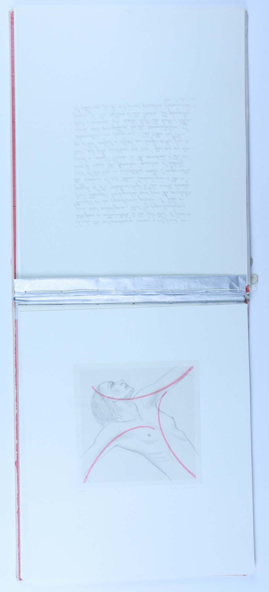 Archival paper, vellum, ink, graphite pencil, acrylic paint, fabric, thread, buttons, musical score