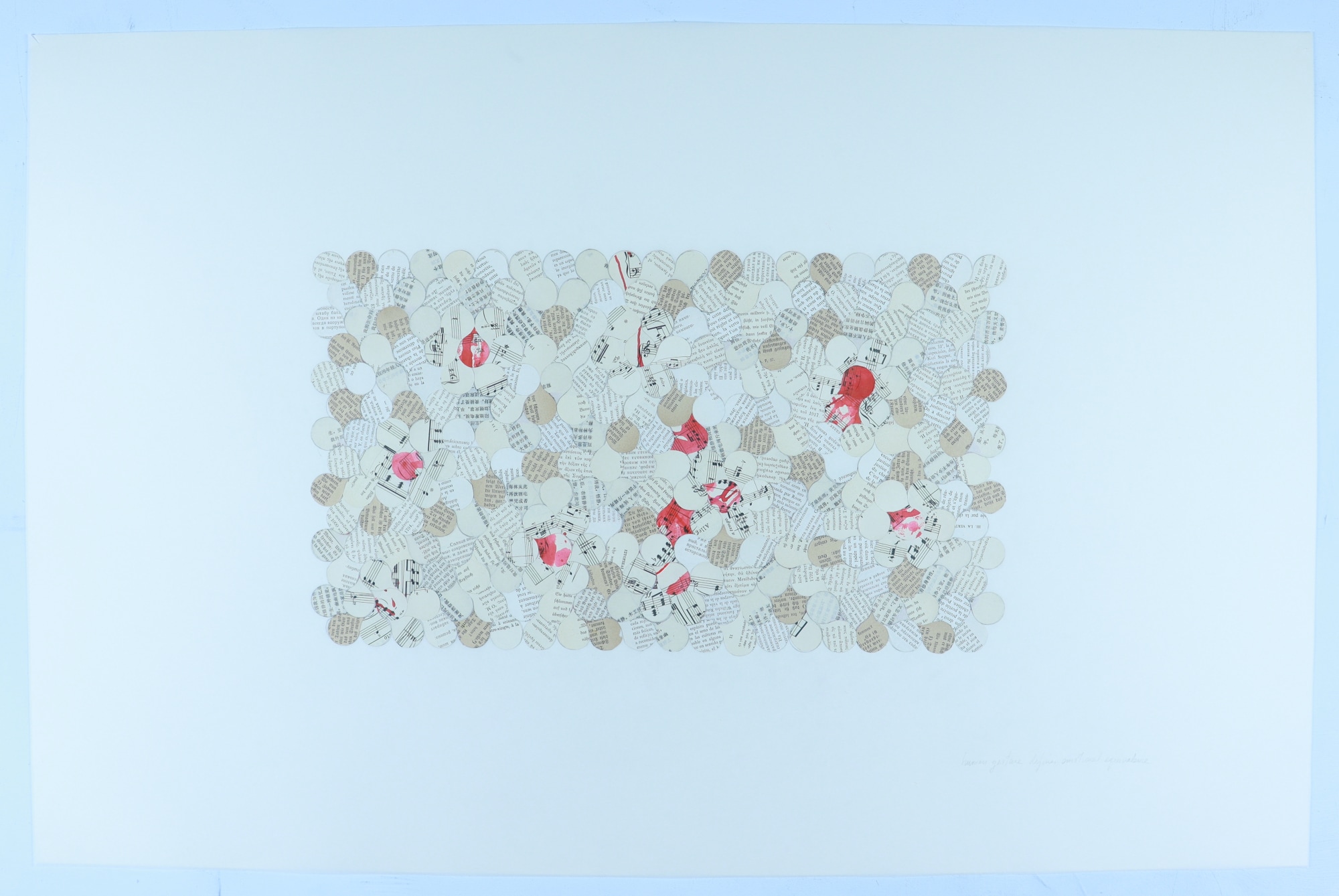 Translucent vellum, musical score, red ink, book pages