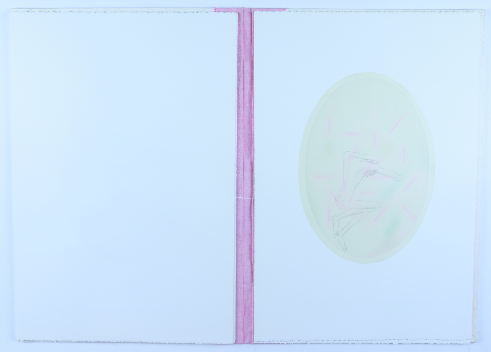 Fabric, vellum, rag paper, graphite pencil, irridescent acrylic paint, color pencil, foam core, textured paper