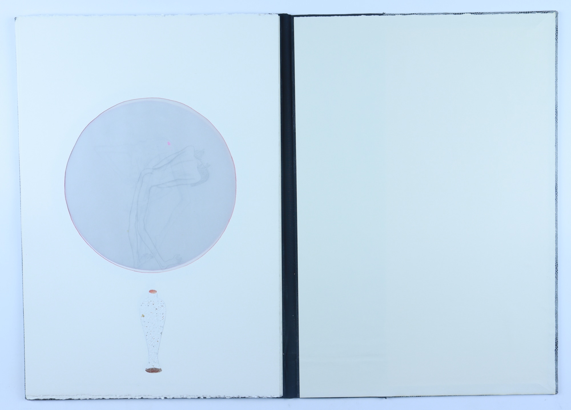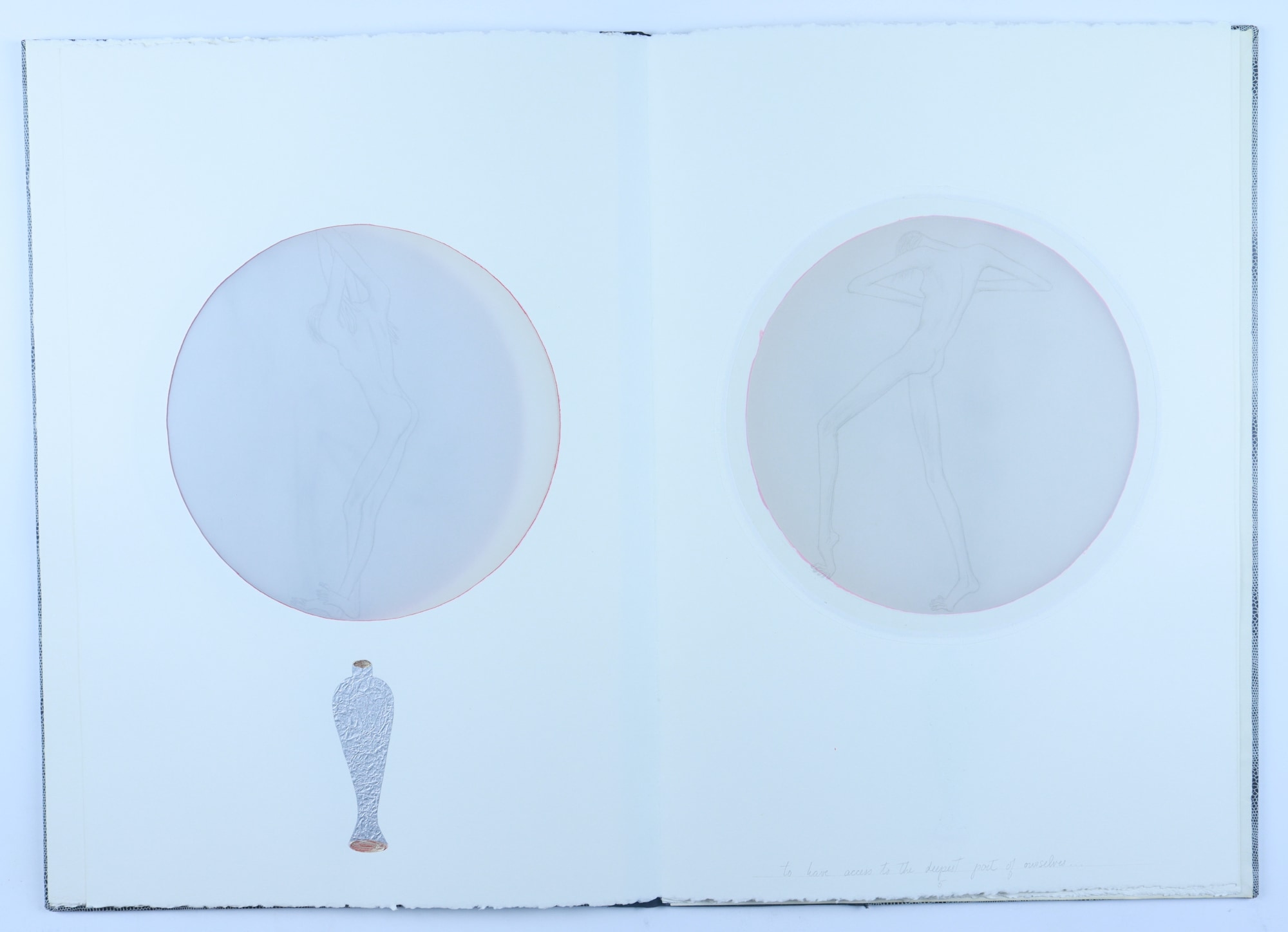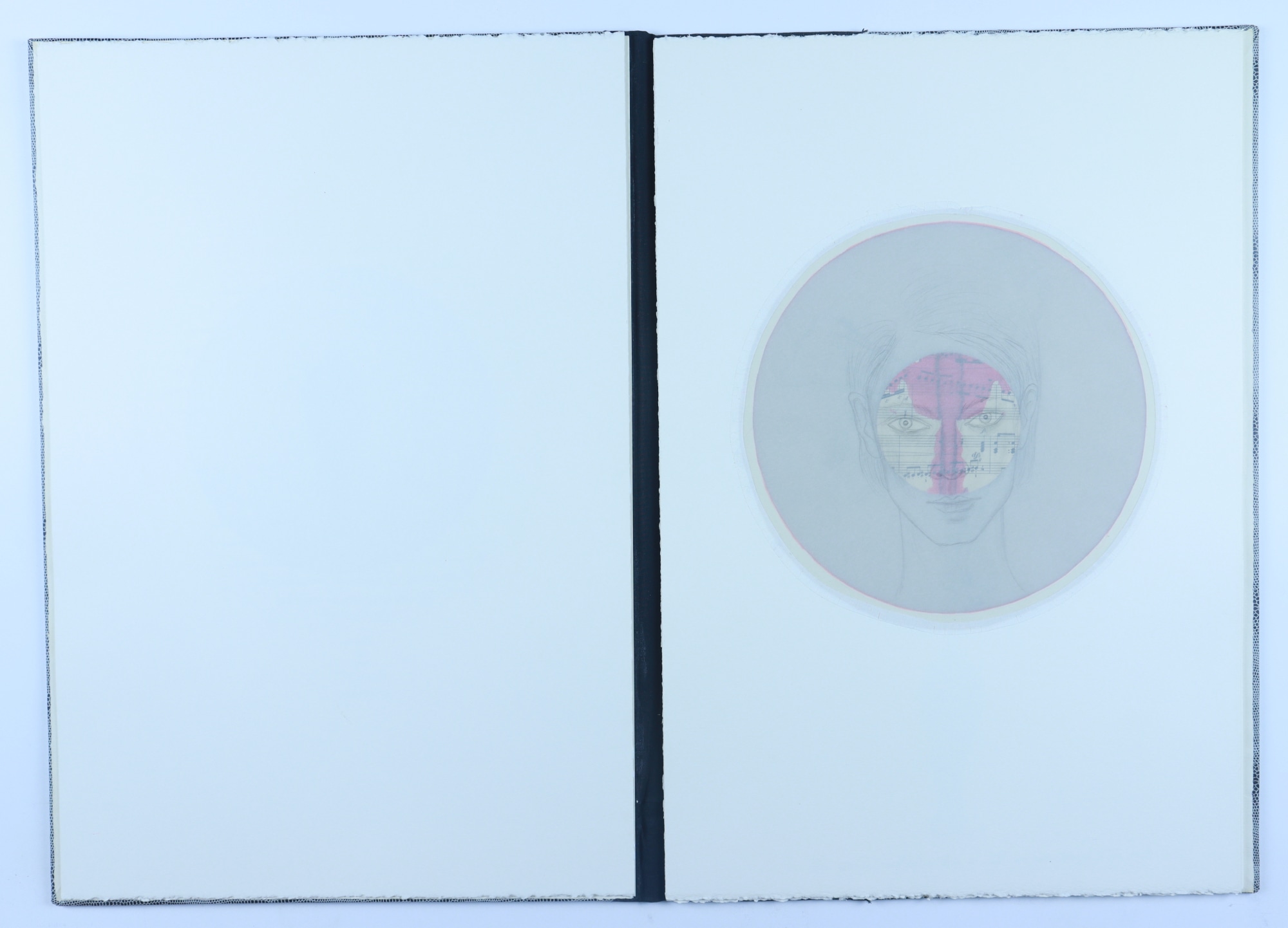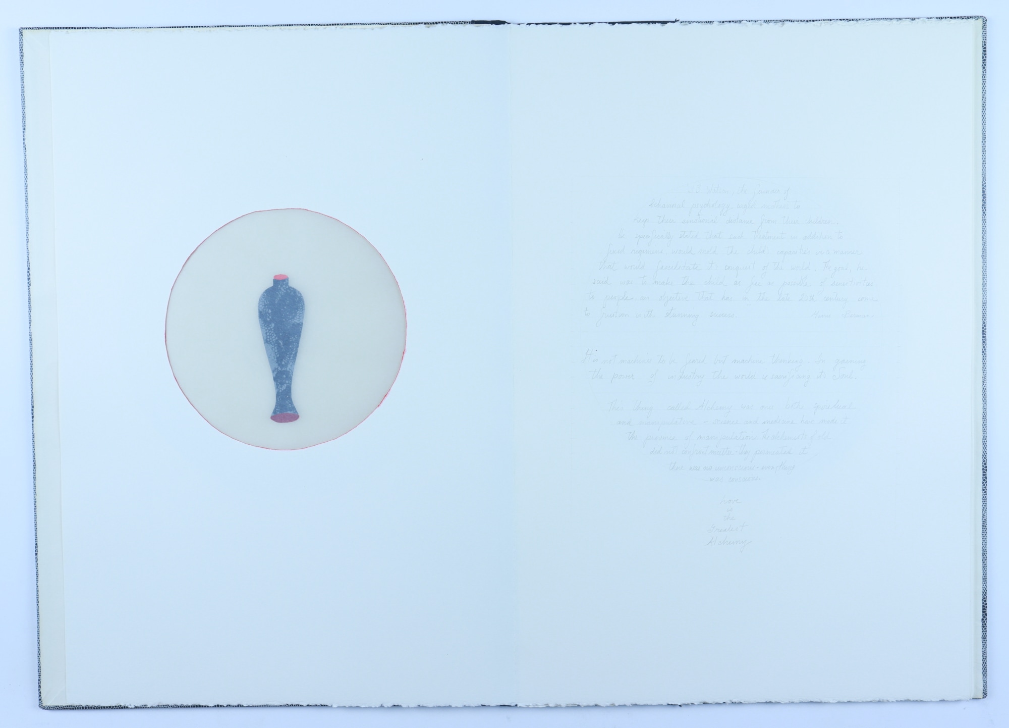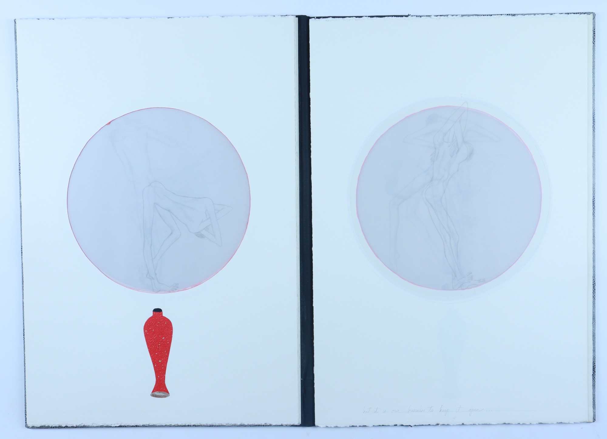 Patterened paper, red ink, graphite pencil, foam core, glass beads, fake pearls, old book pages, fabric