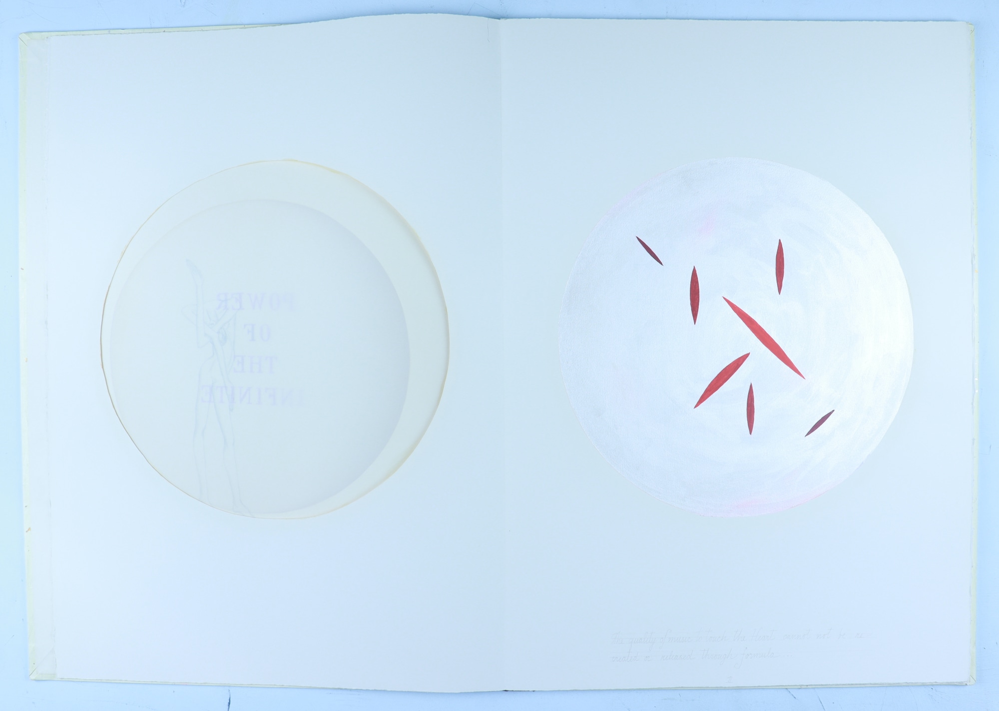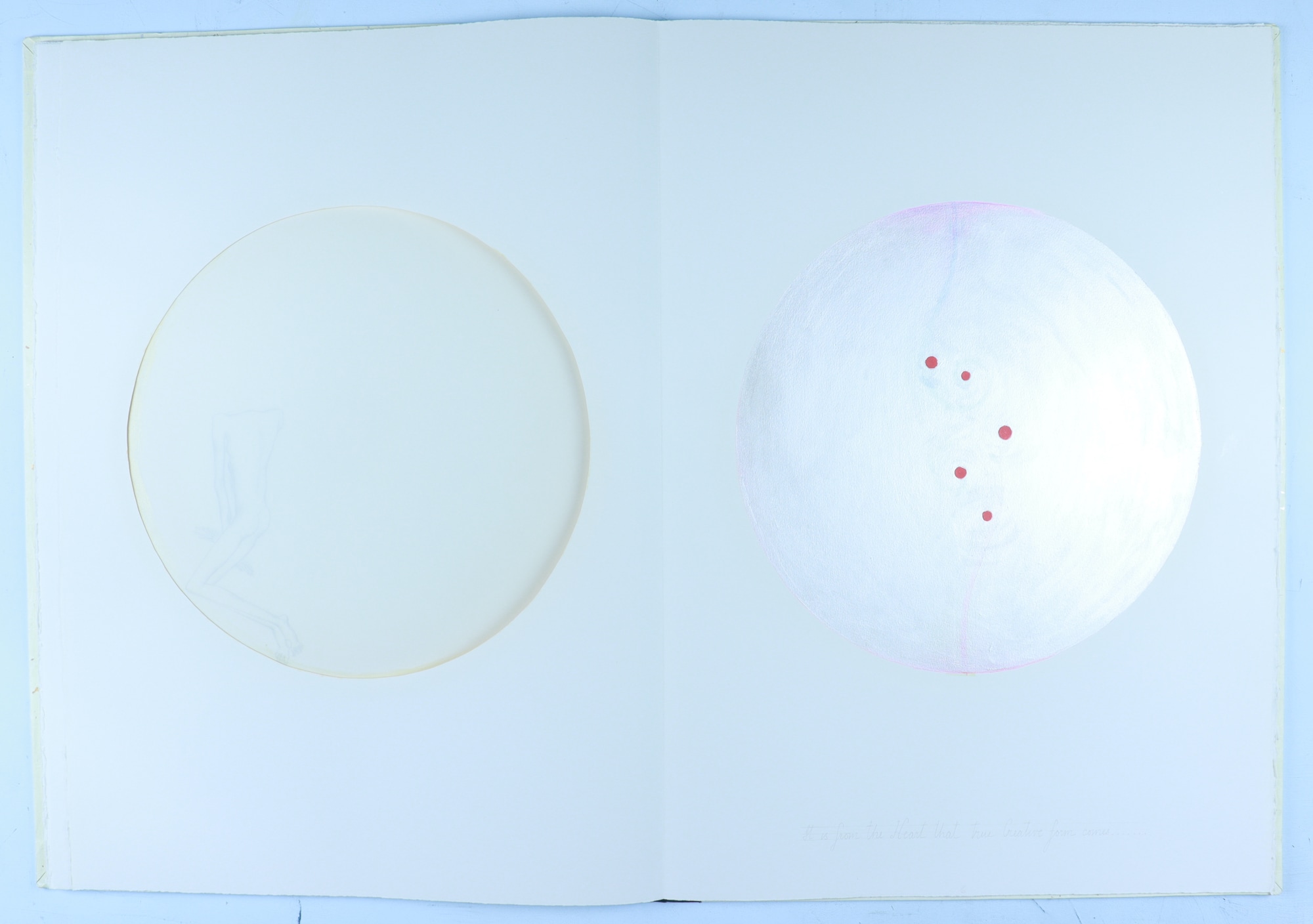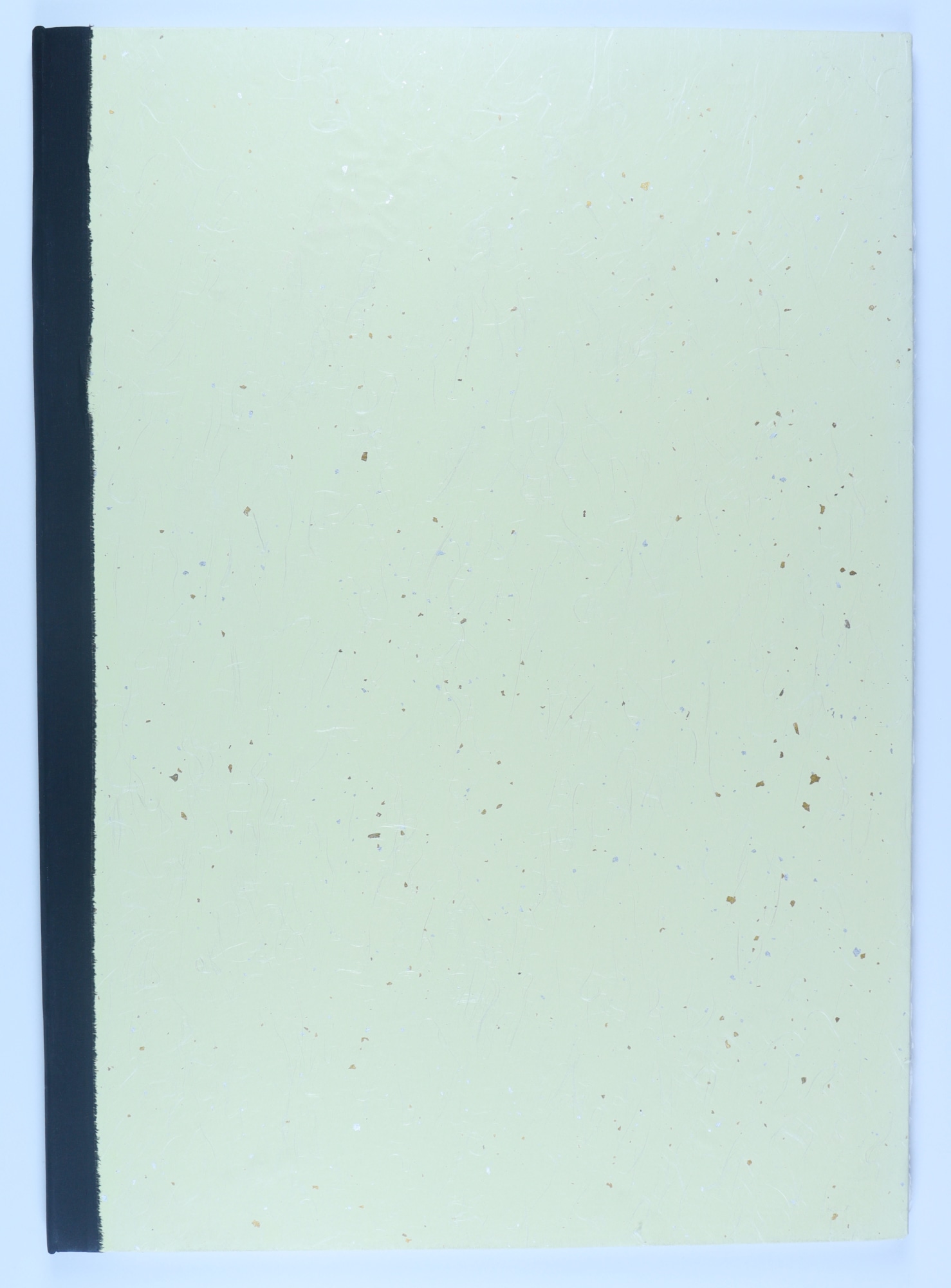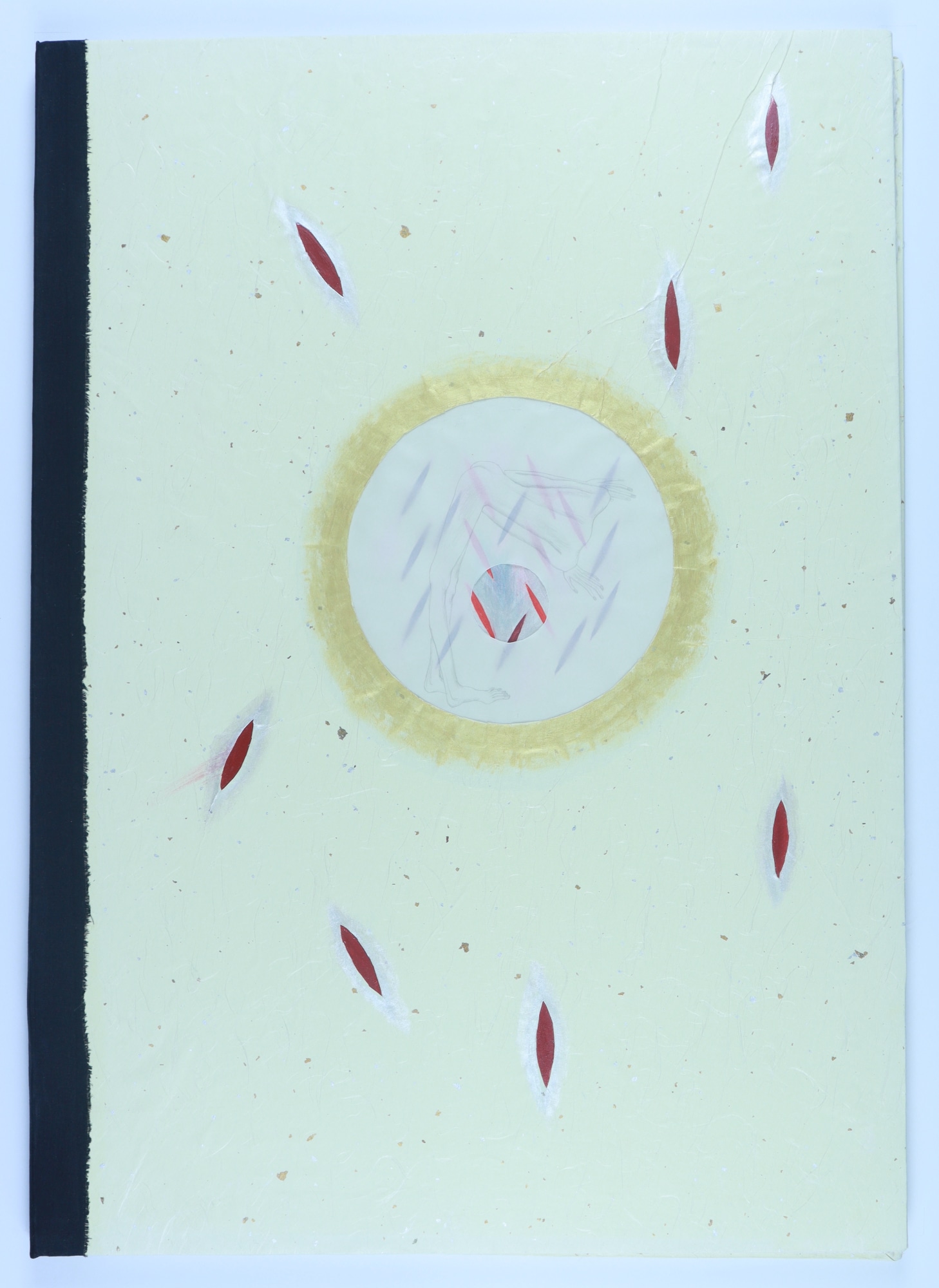 Acrylic paint, irridescent acrylic paint, vellum, archival paper, handmade paper, red ink, graphite pencil