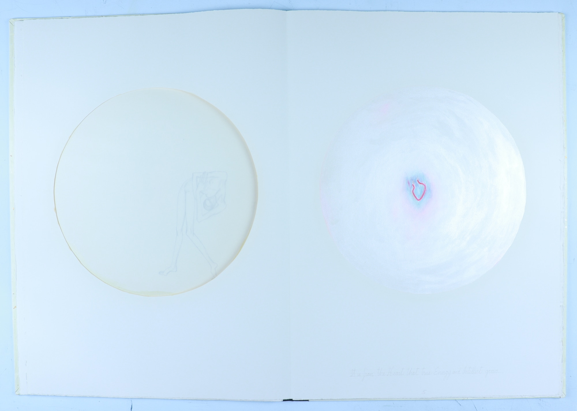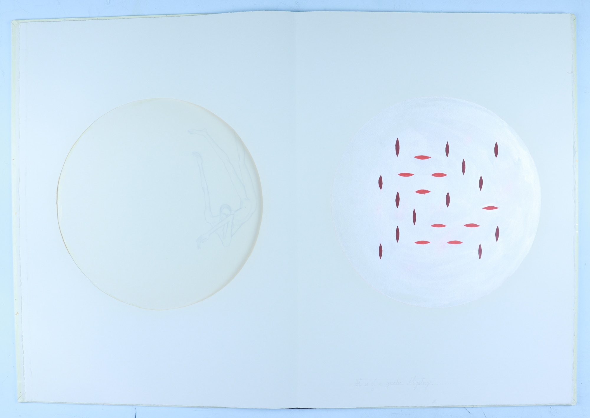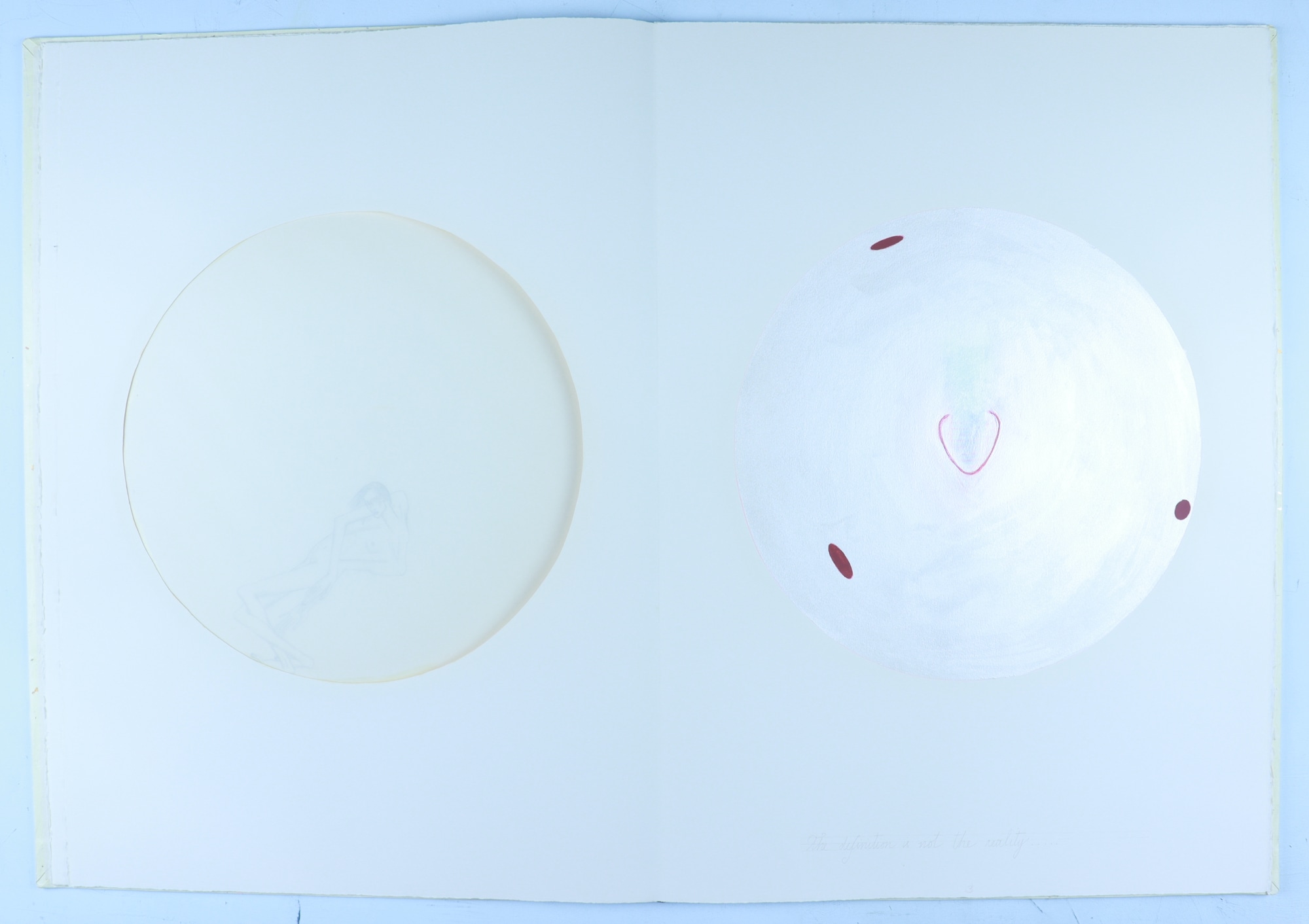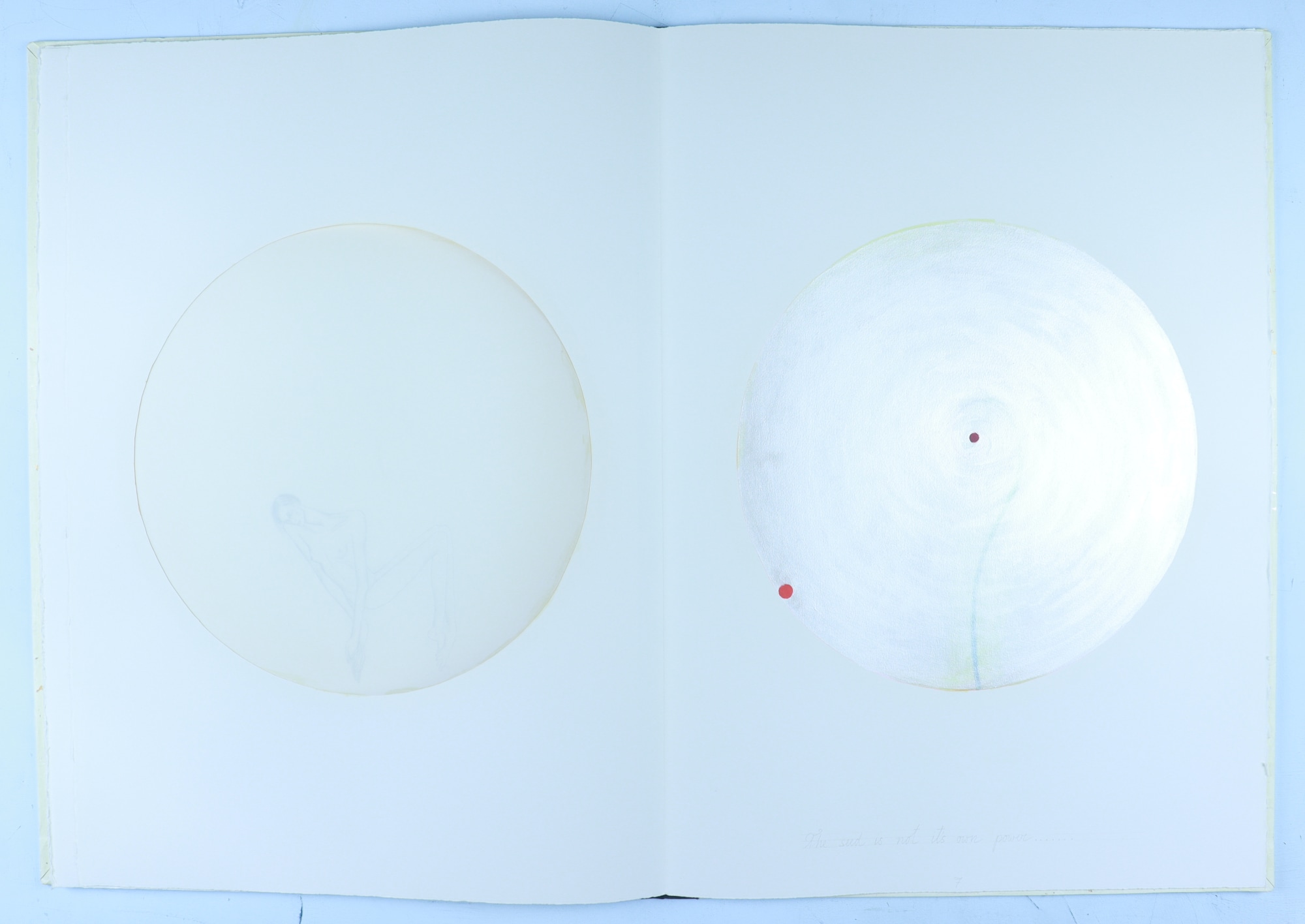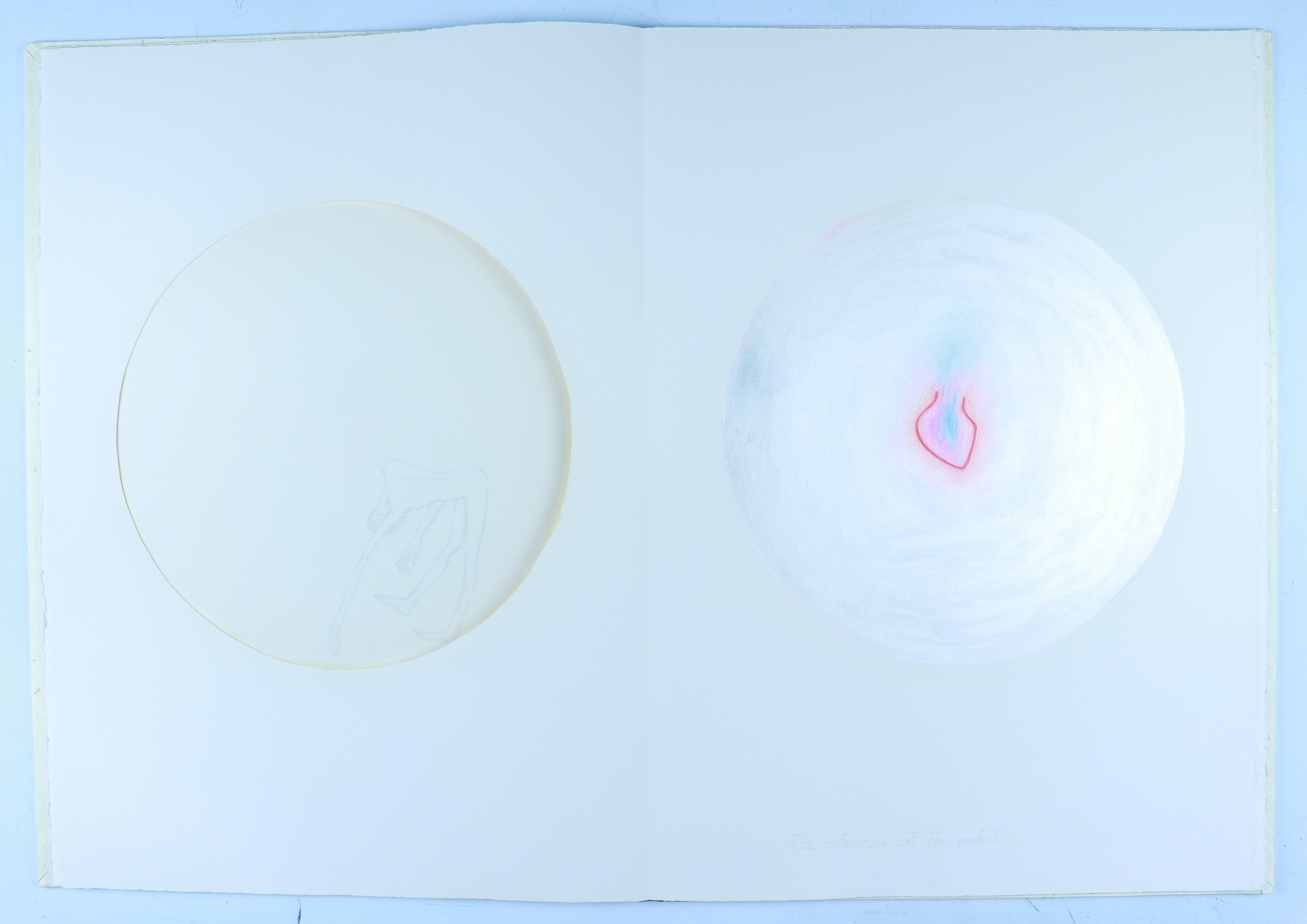 Acrylic paint, irridescent acrylic paint, vellum, archival paper, handmade paper, red ink, graphite pencil