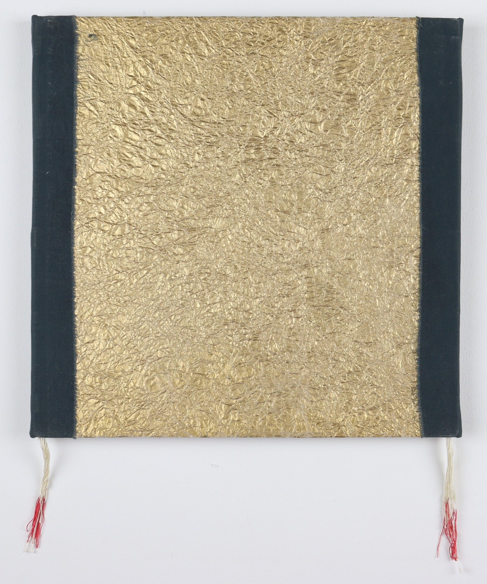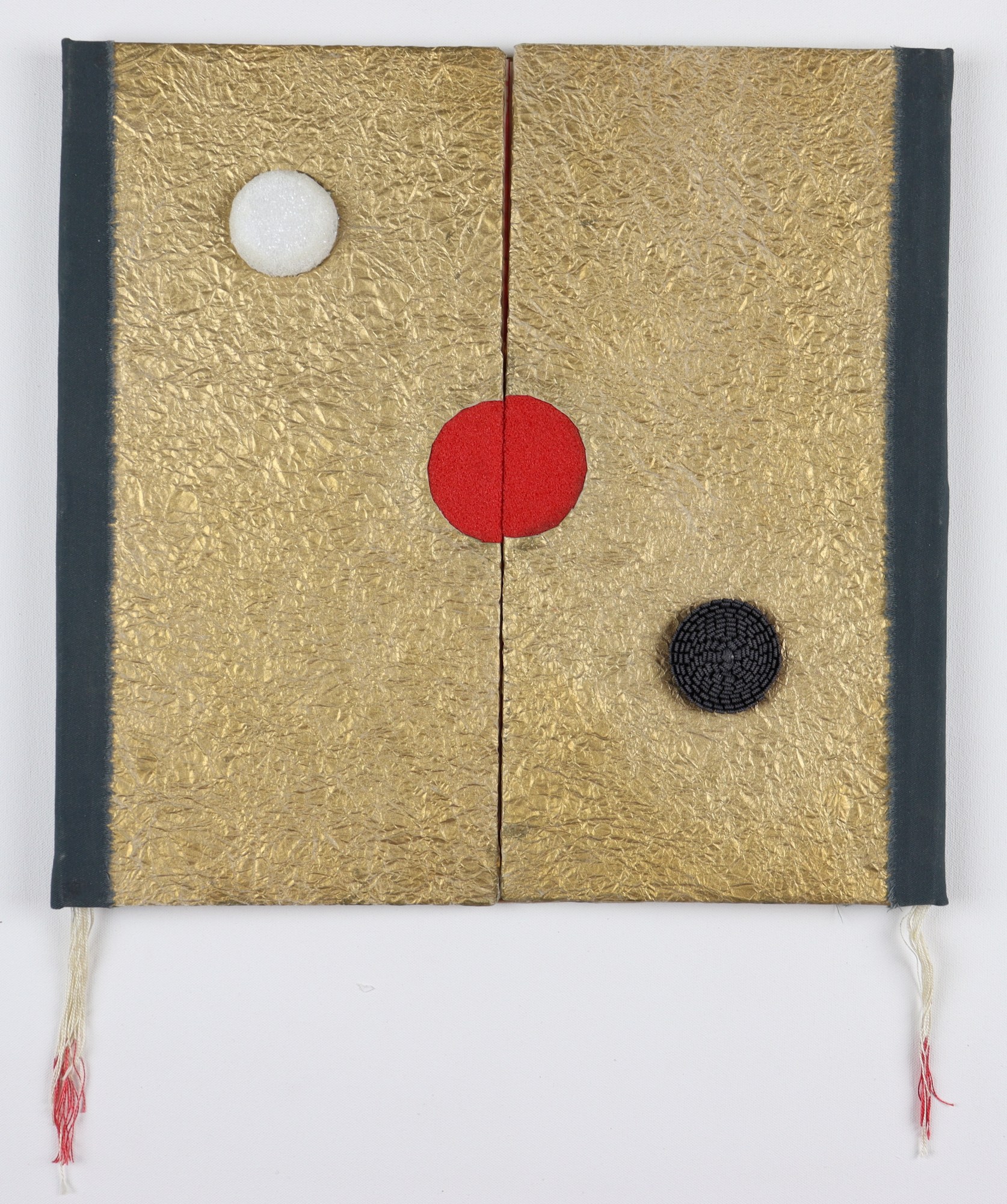 Foam core, vellum, gold paper, fabric, colored pencil, acrylic paint, string, styrofoam ball