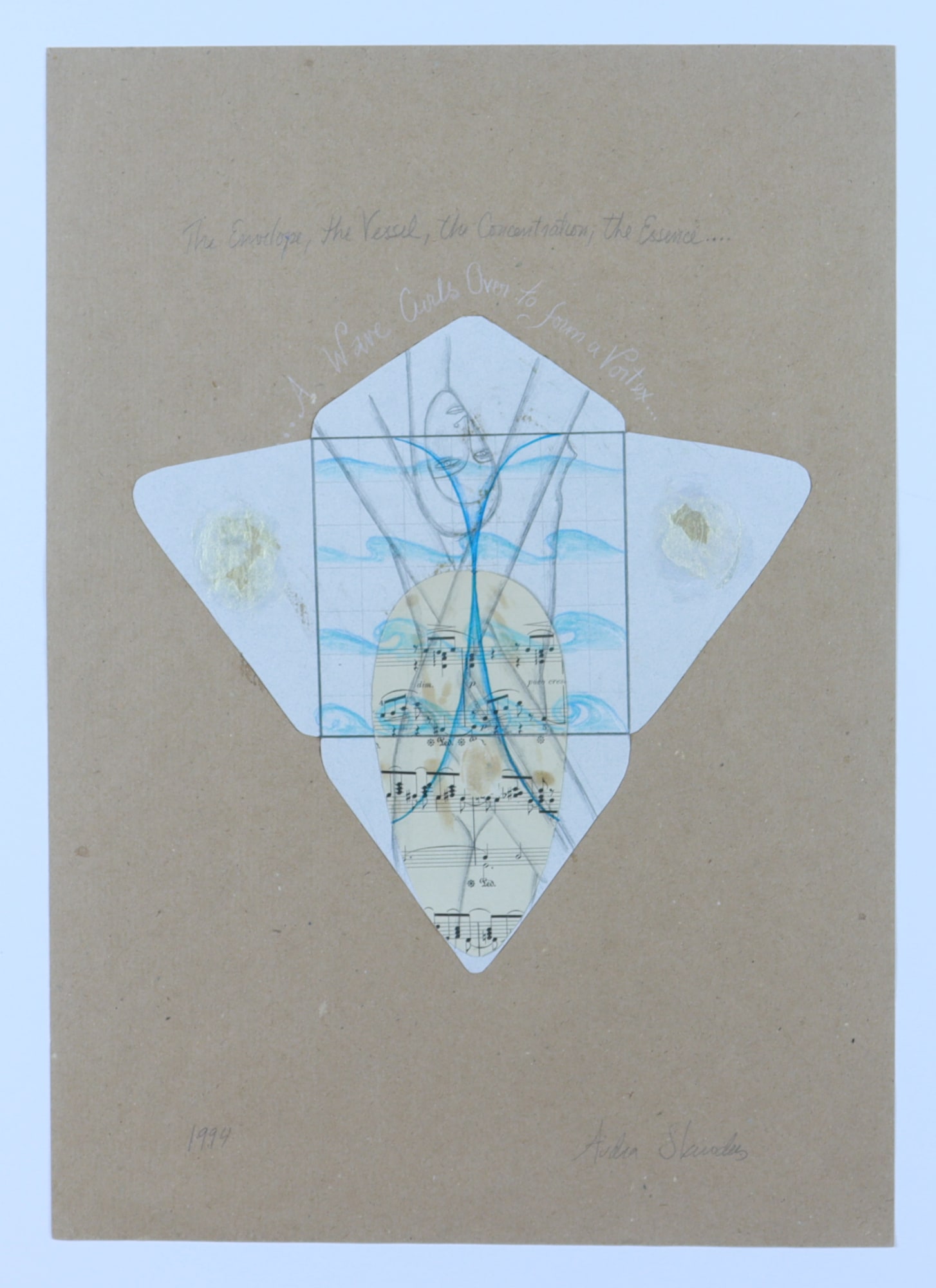 Construction paper, graphite, color pencil, acrylic paint, musical score