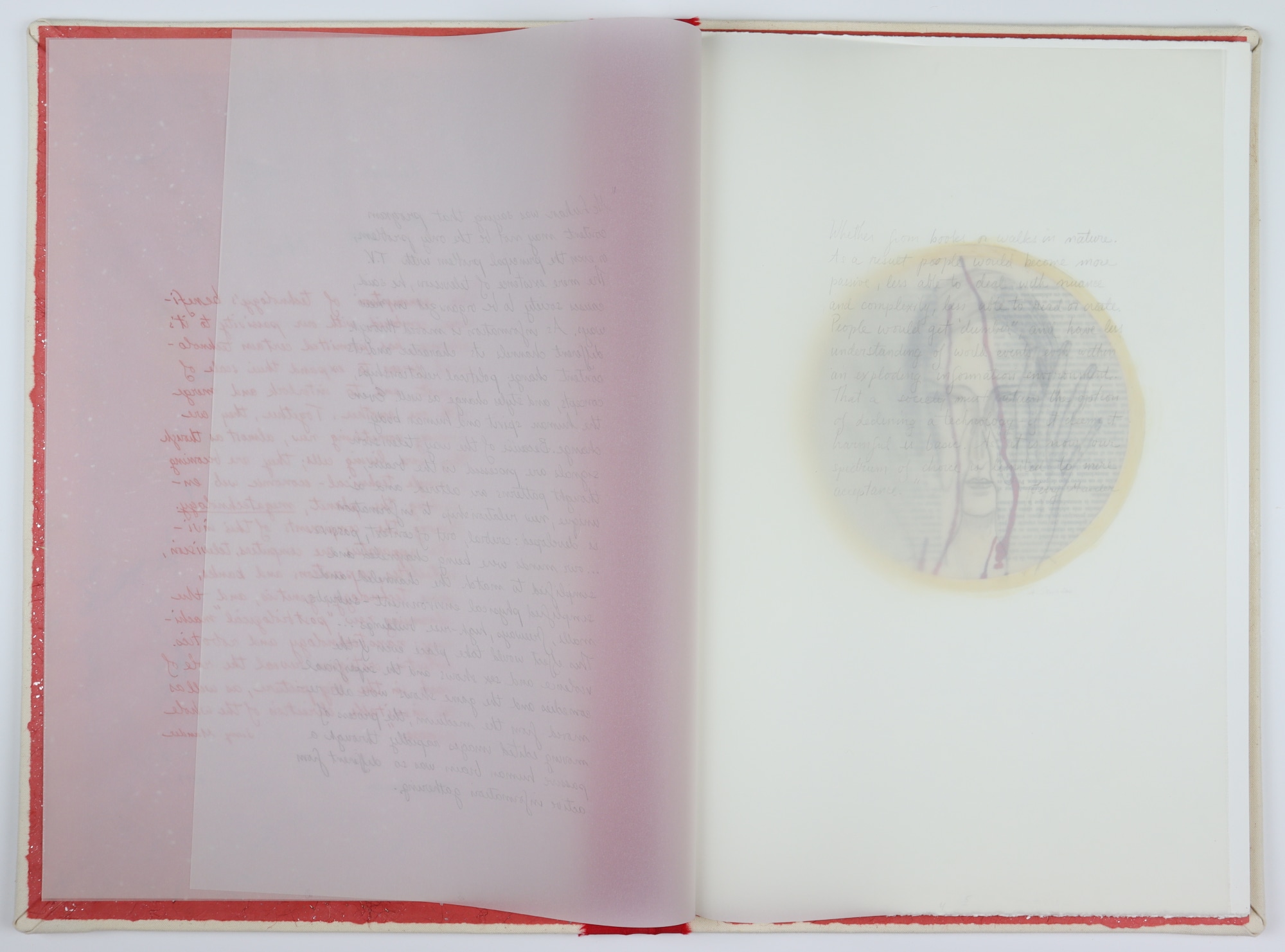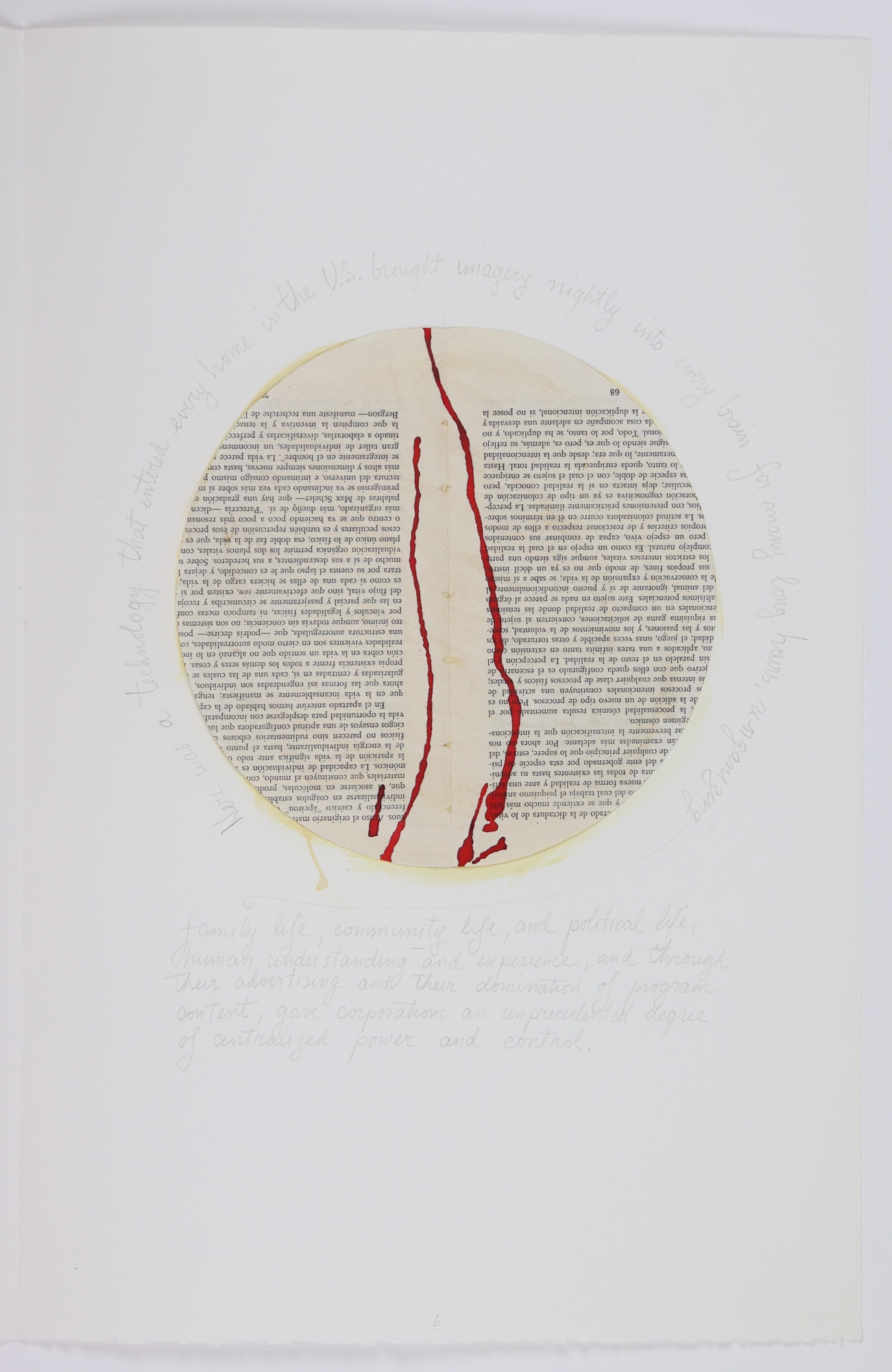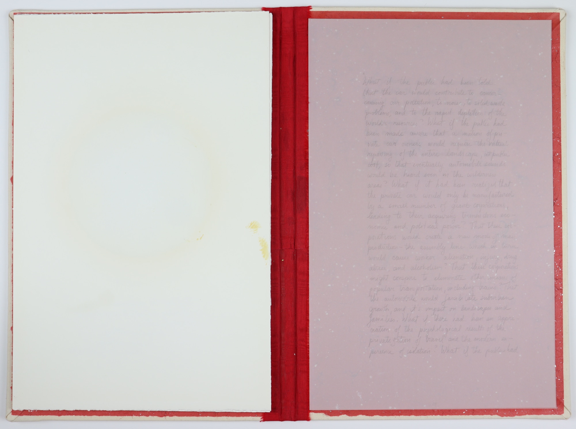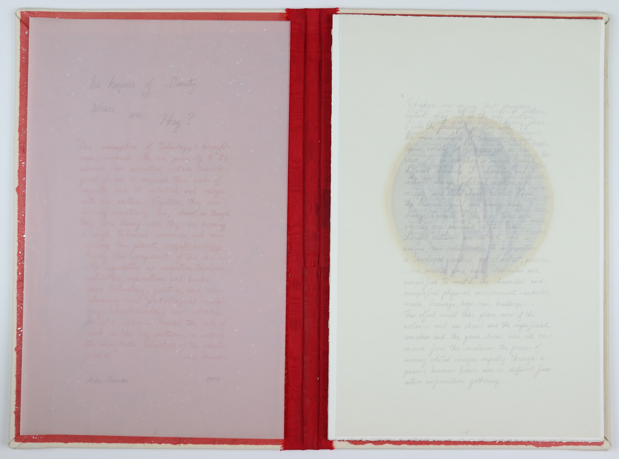 Handbound and illustrated artist book with vellum image overlay and copmpilation of artist text and quotations from Jerry Mander.