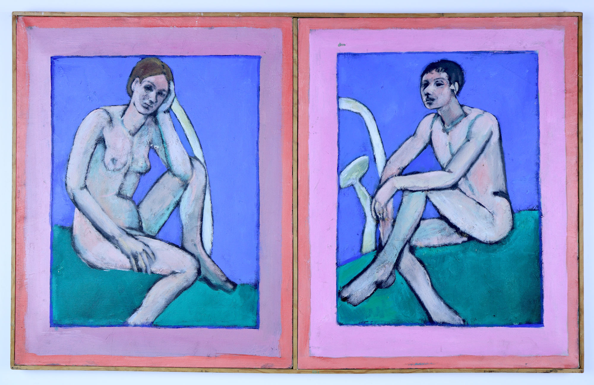 two paintings framed together in wood frame, with central divider