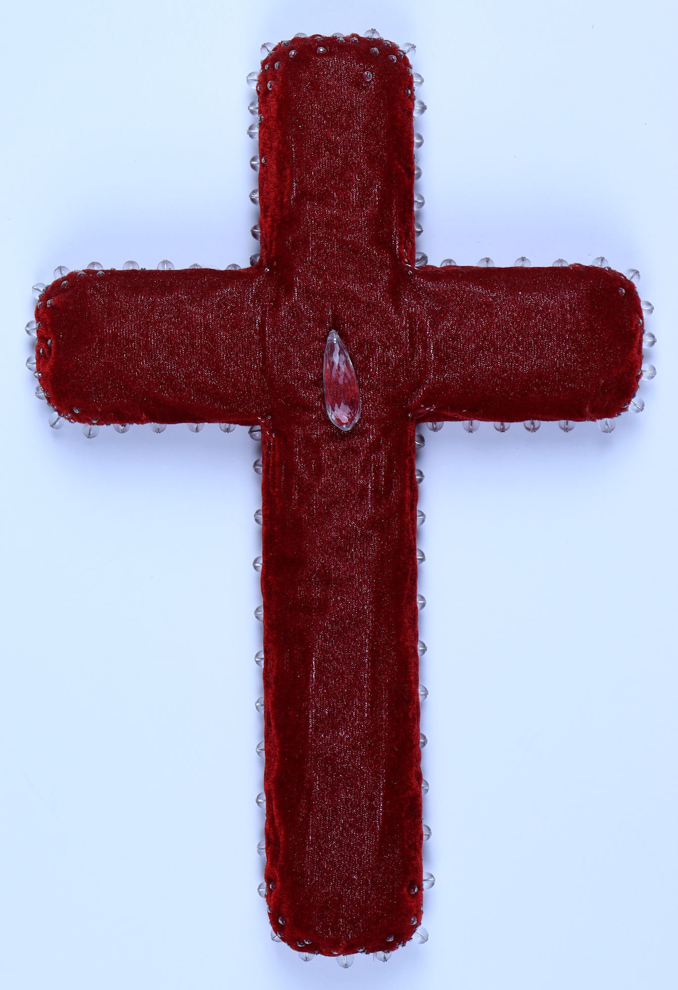 Fabric, glass seed beads, plastic beaads, pearl beads, stick pins, paper