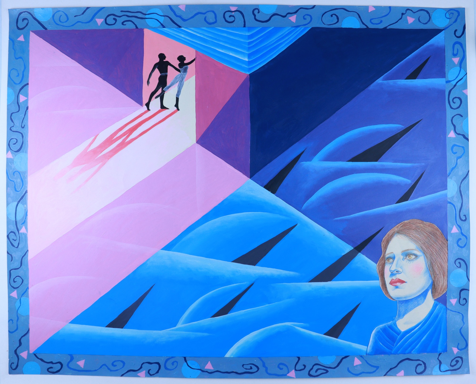 Collage -- color pencil drawing of torso/face overlaid over painting background
