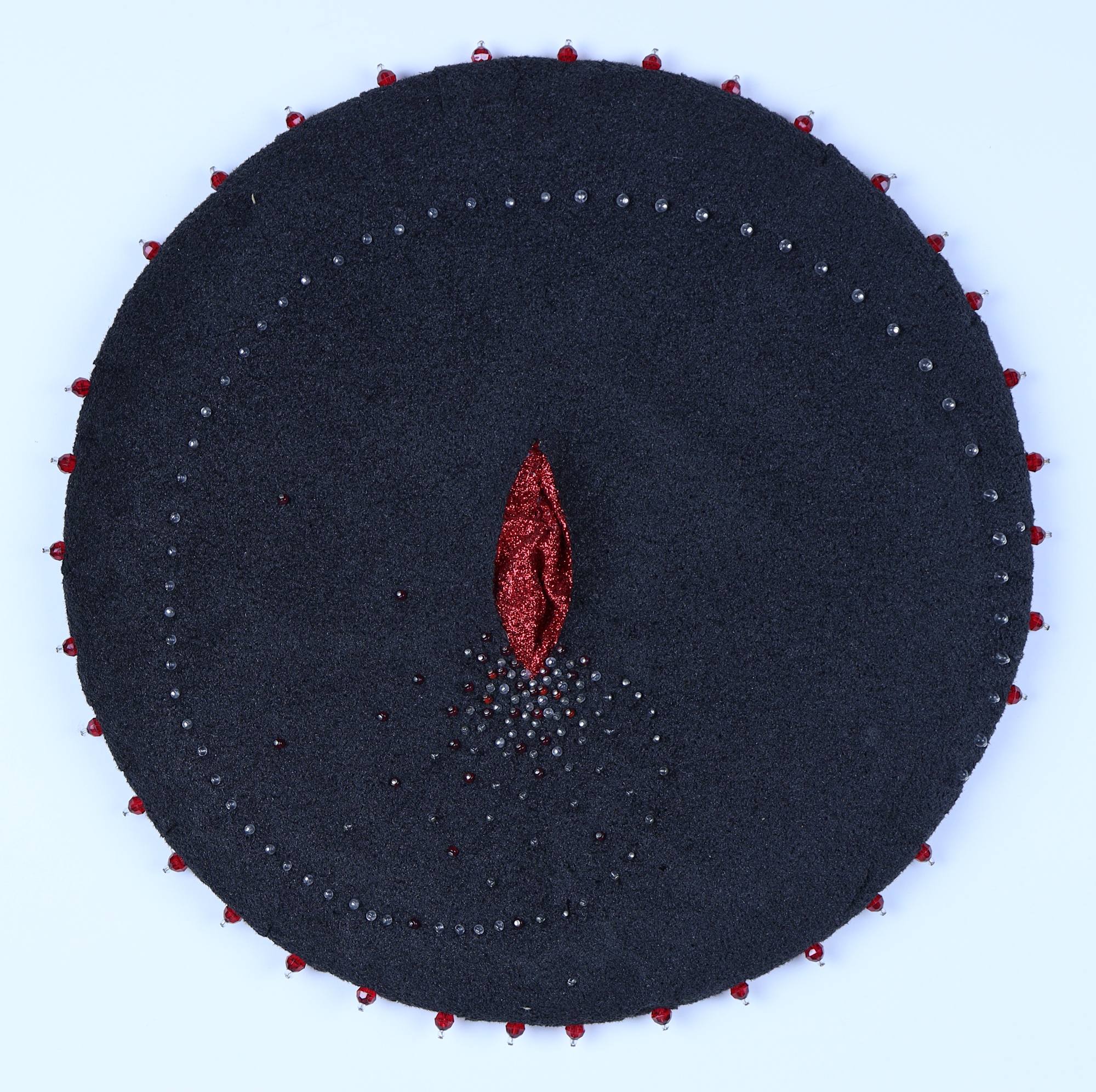 fabric, plastic beads, glass seed beads, pins, mounted on styrofoam
