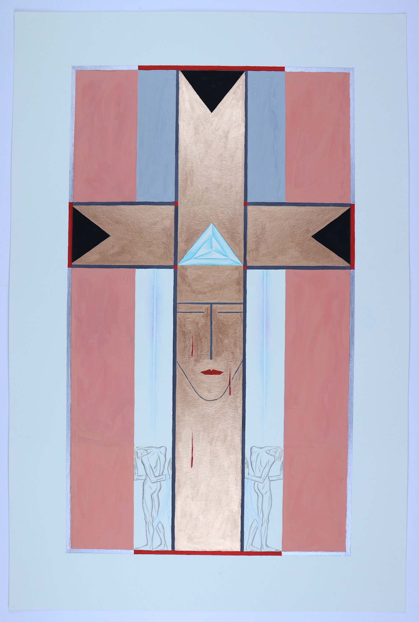 acrylic paint, metallic paint, red ink, color pencil, graphite pencil