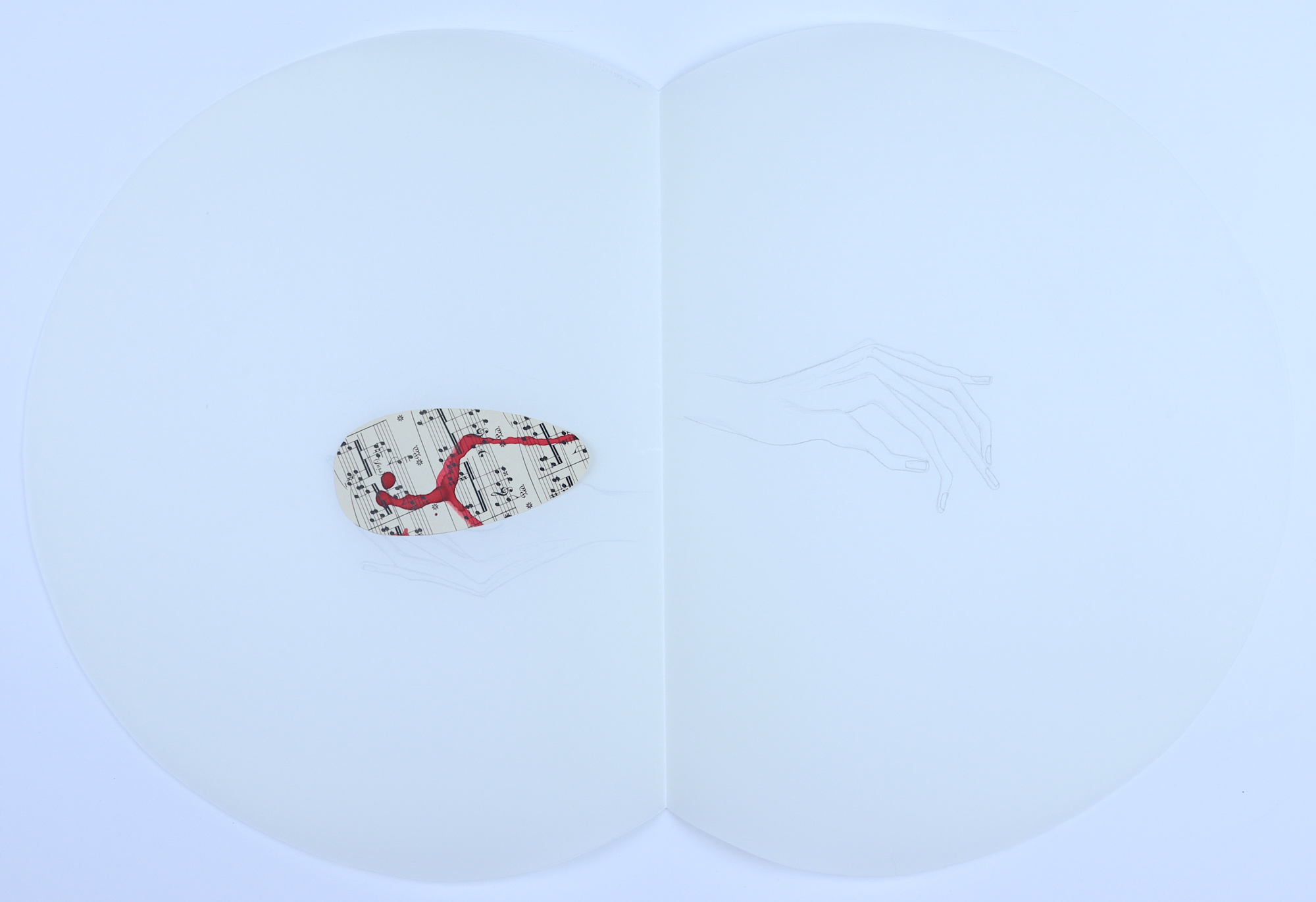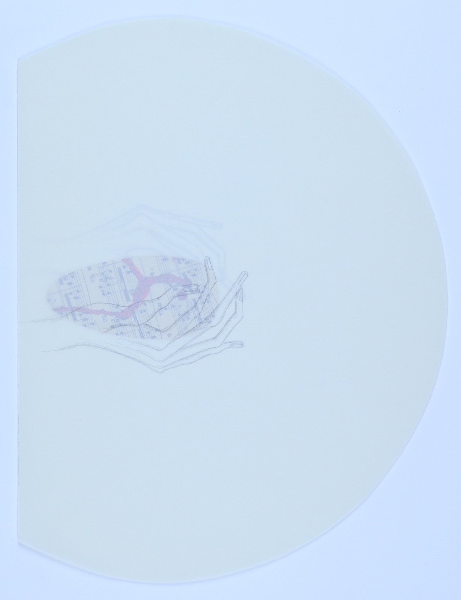 vellum, graphite pencil, vintage musical score, red ink
