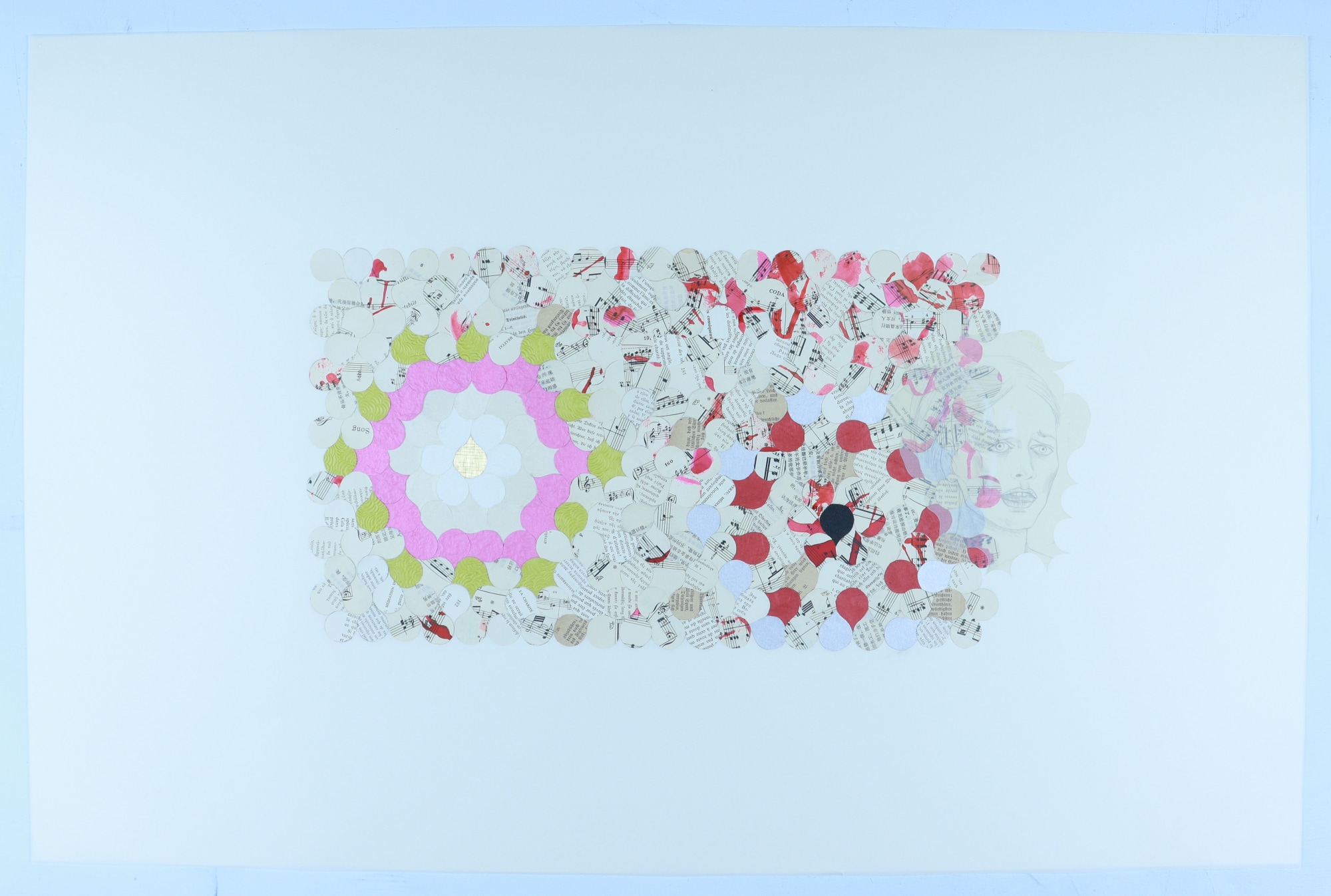 translucent vellum, graphite pencil, musical score, red ink, textured paper