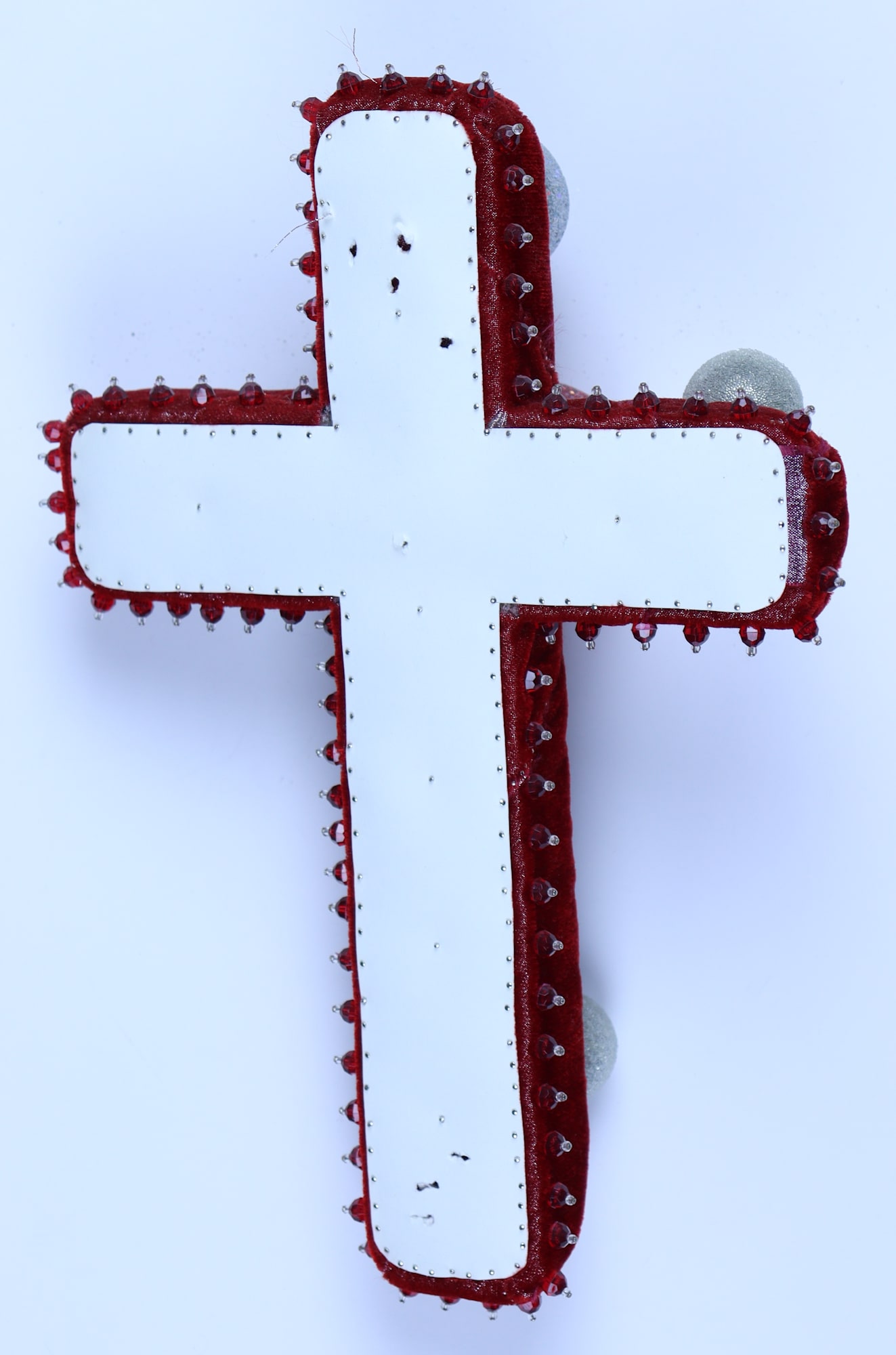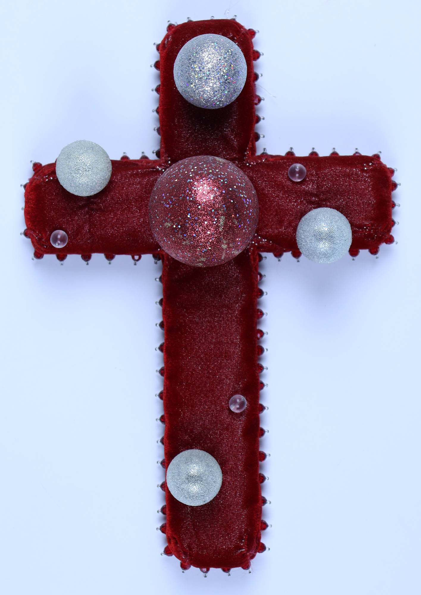 fabric, glass seed beads, pearl beads, plastic balls, stick pins, paper