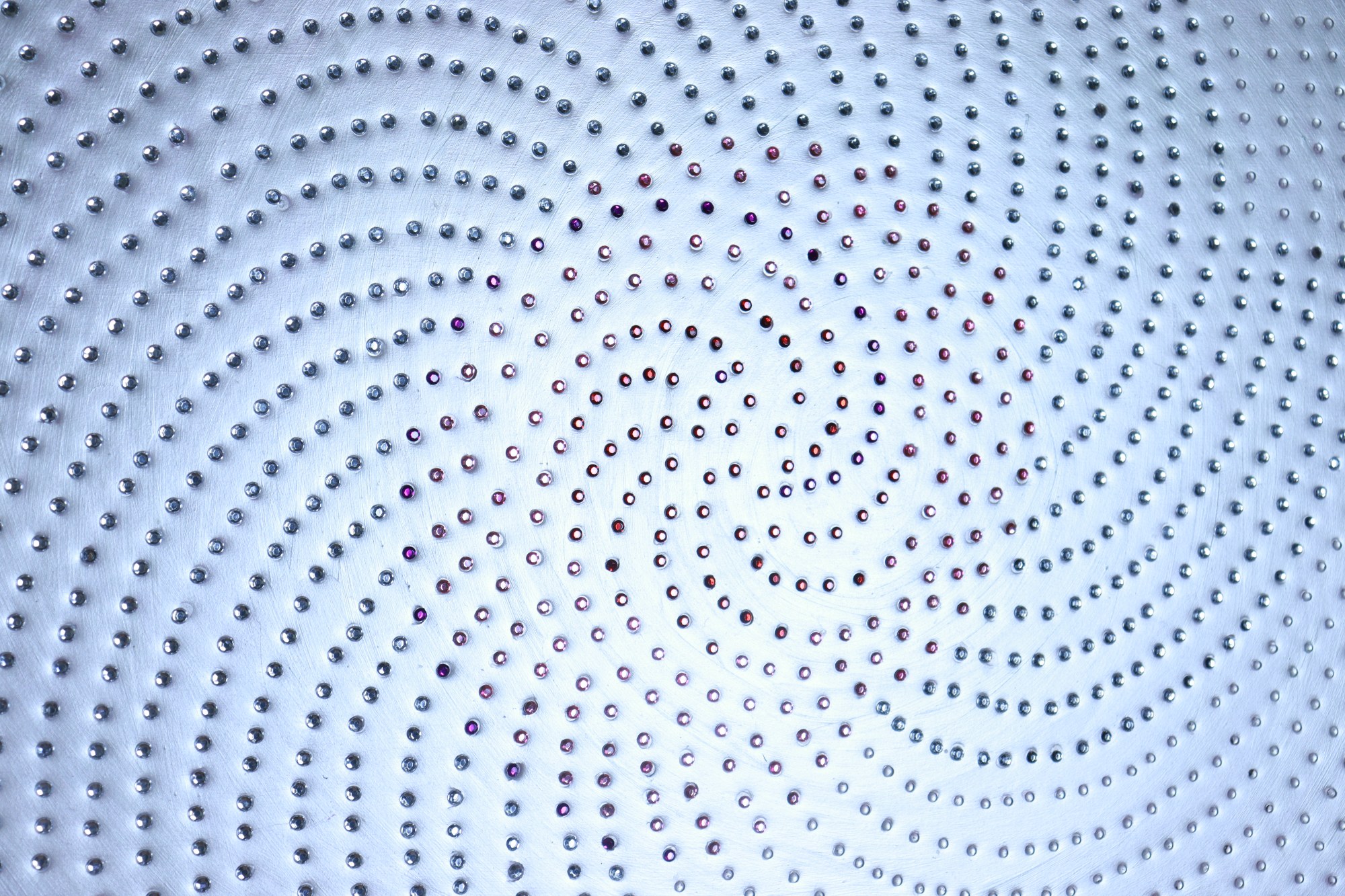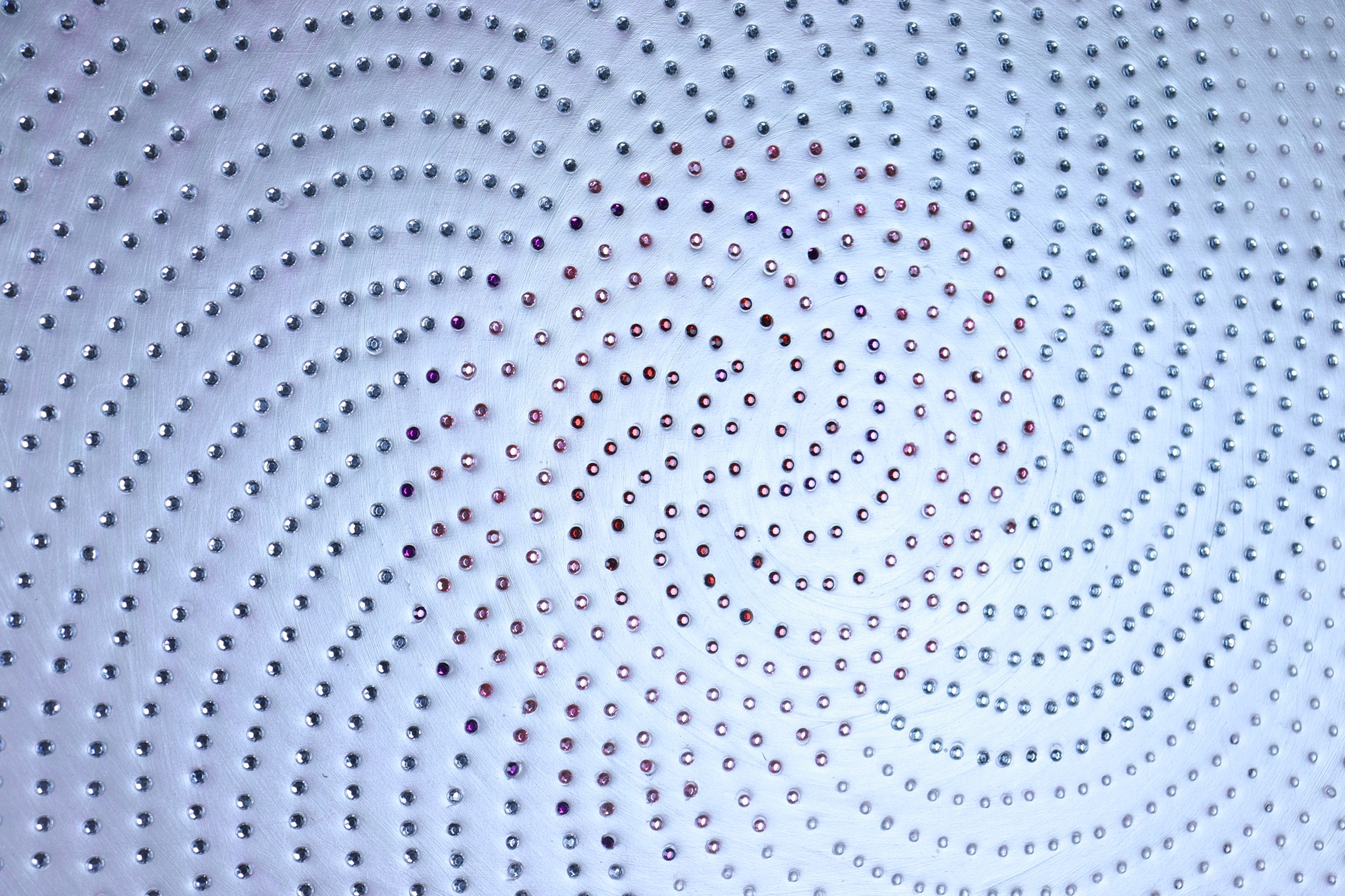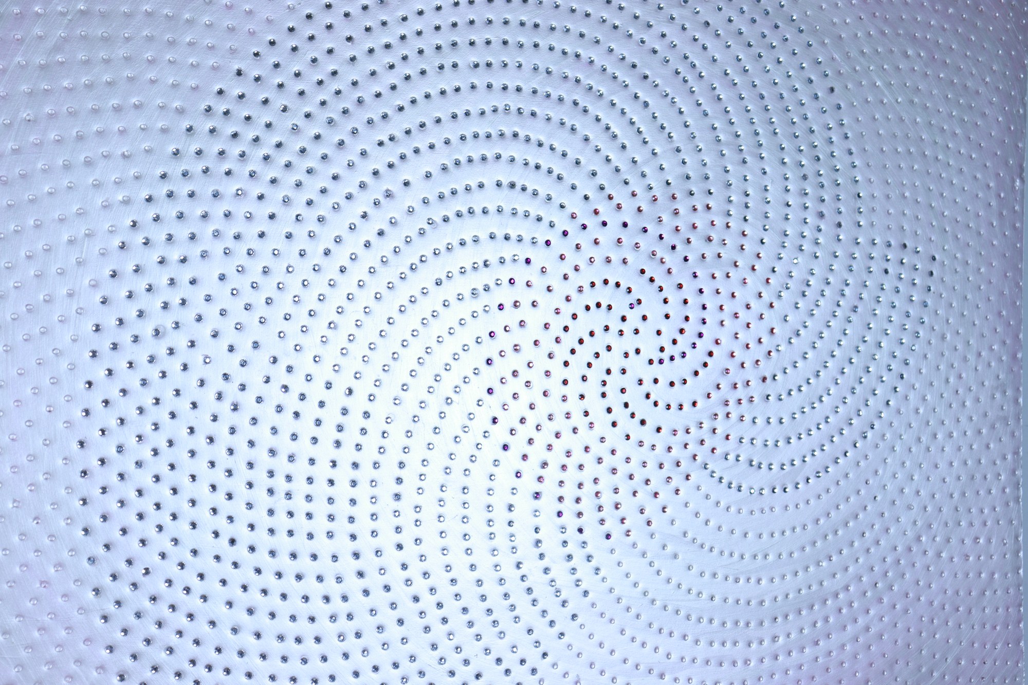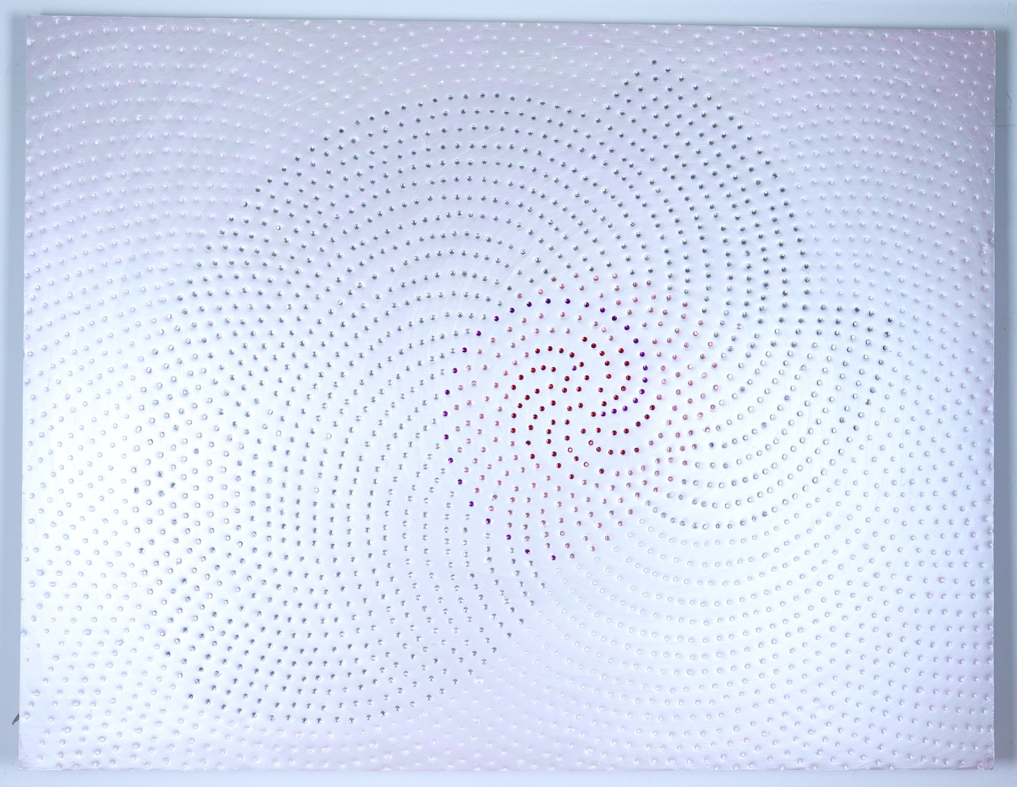 Foam core on wood frame, acrylic paint, irridescent paint, plastic gems