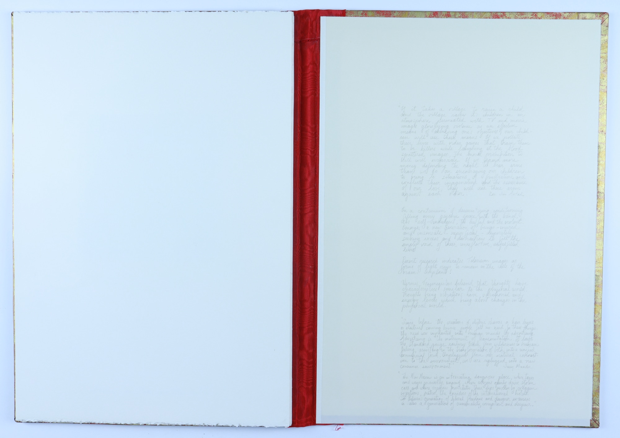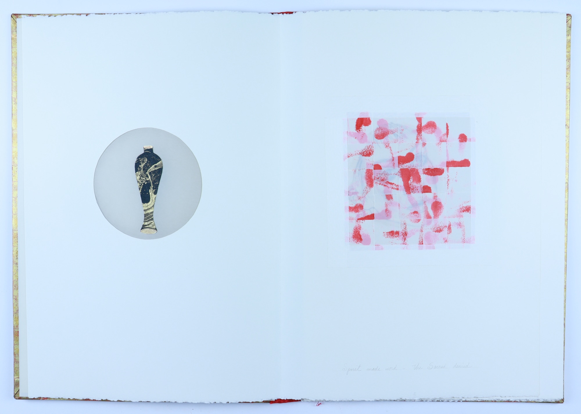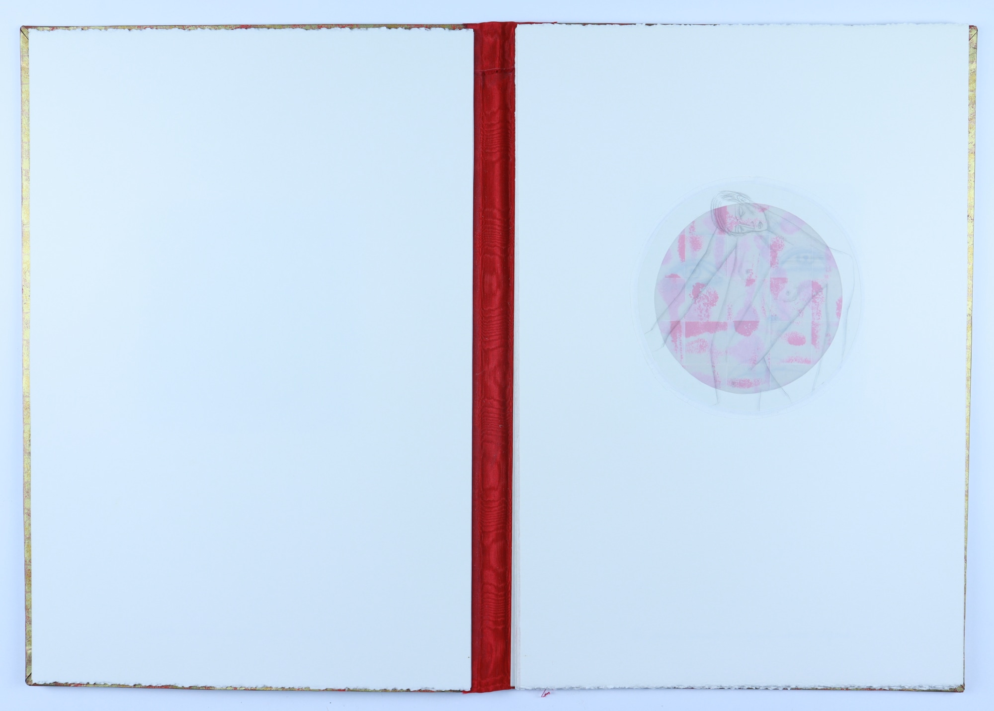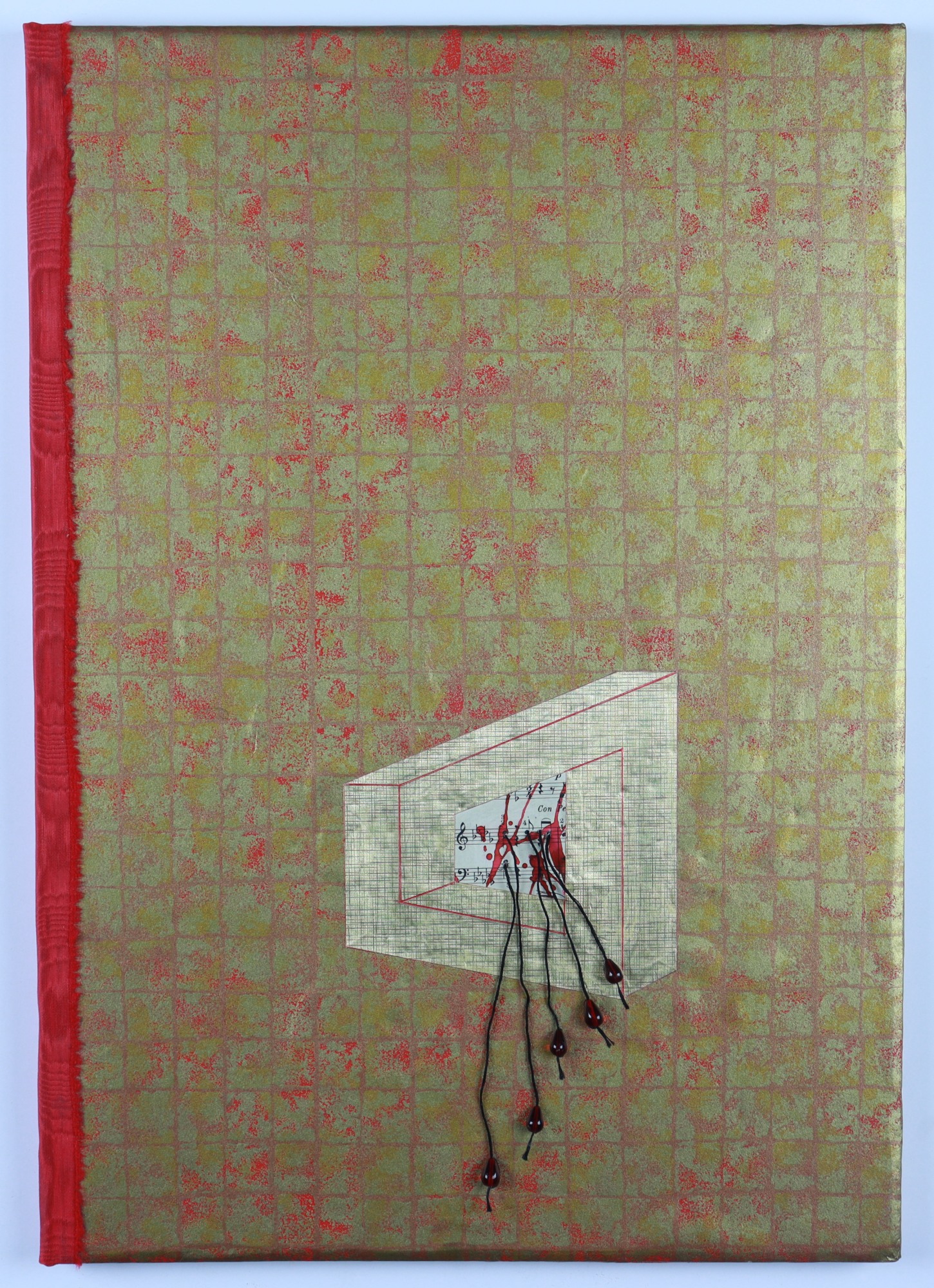 Ink, vellum, graphite pencil, archival paper, fabric, beads, thread, muscial score, foam core, japanese paper
