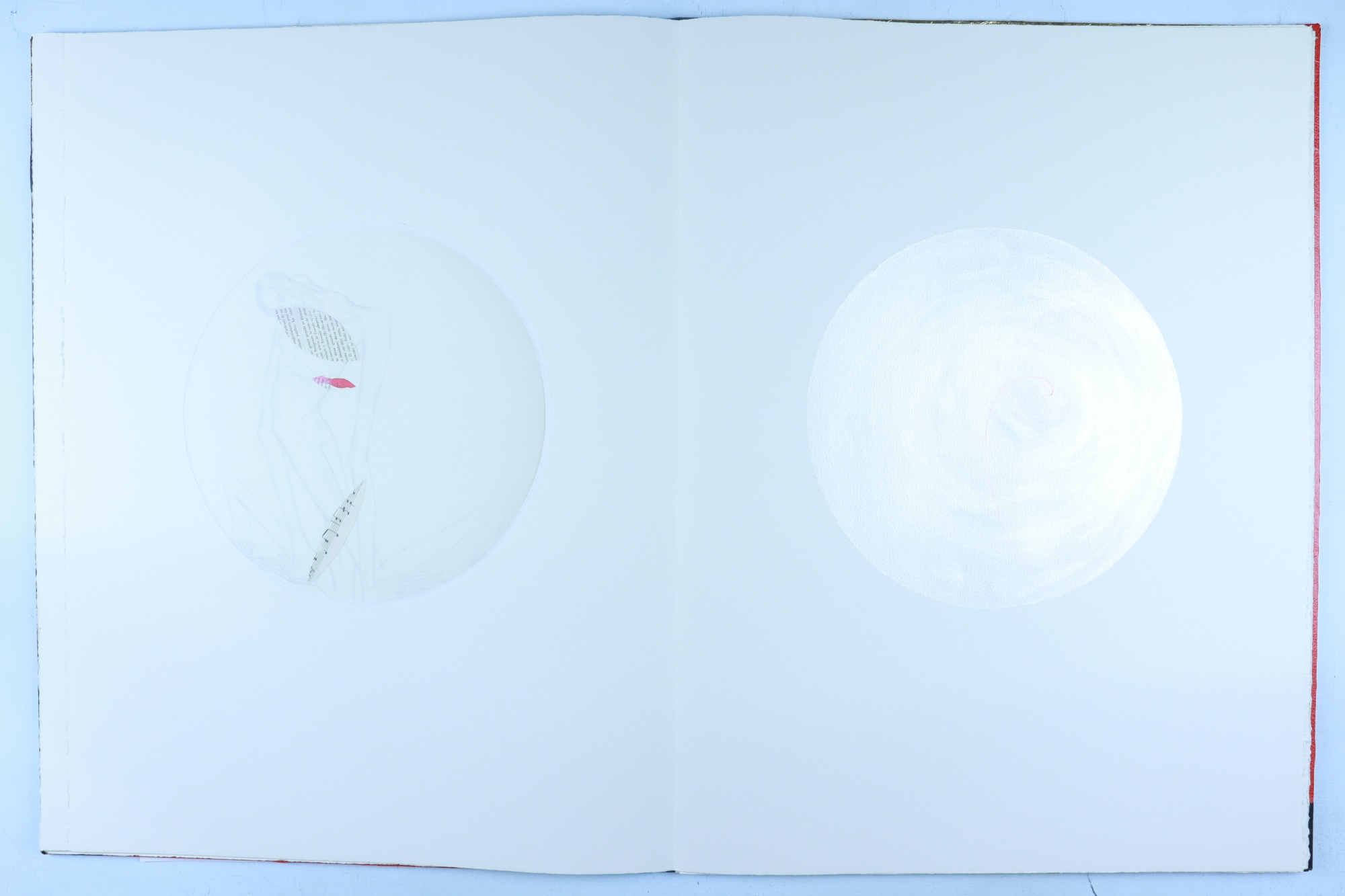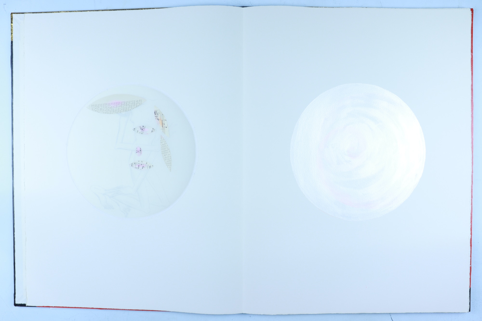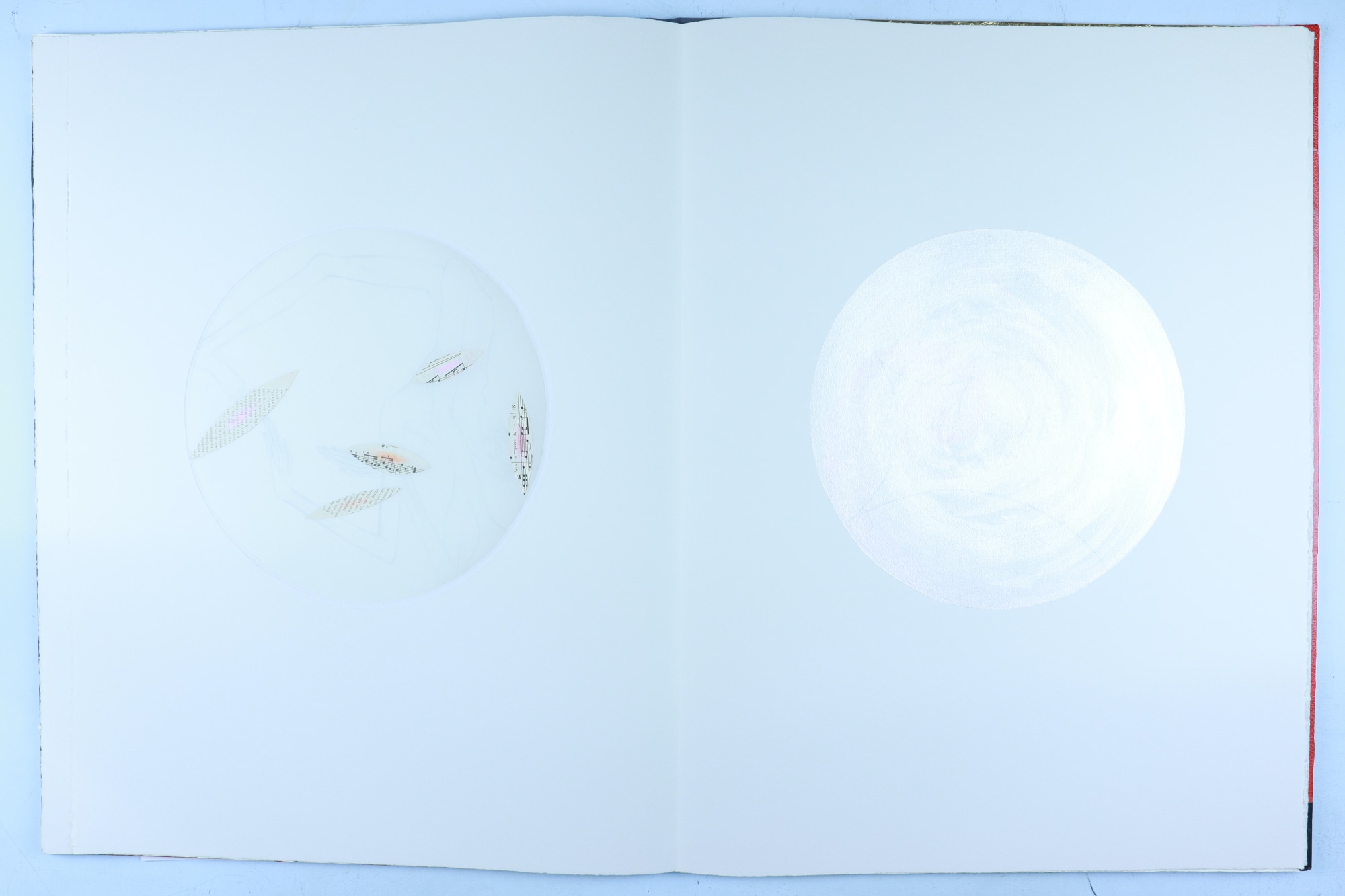 • Patterened paper, archival paper, vellum, foam core, iridescent acrylic paint, color pencil, graphite pencil, fabric, musical score, red ink