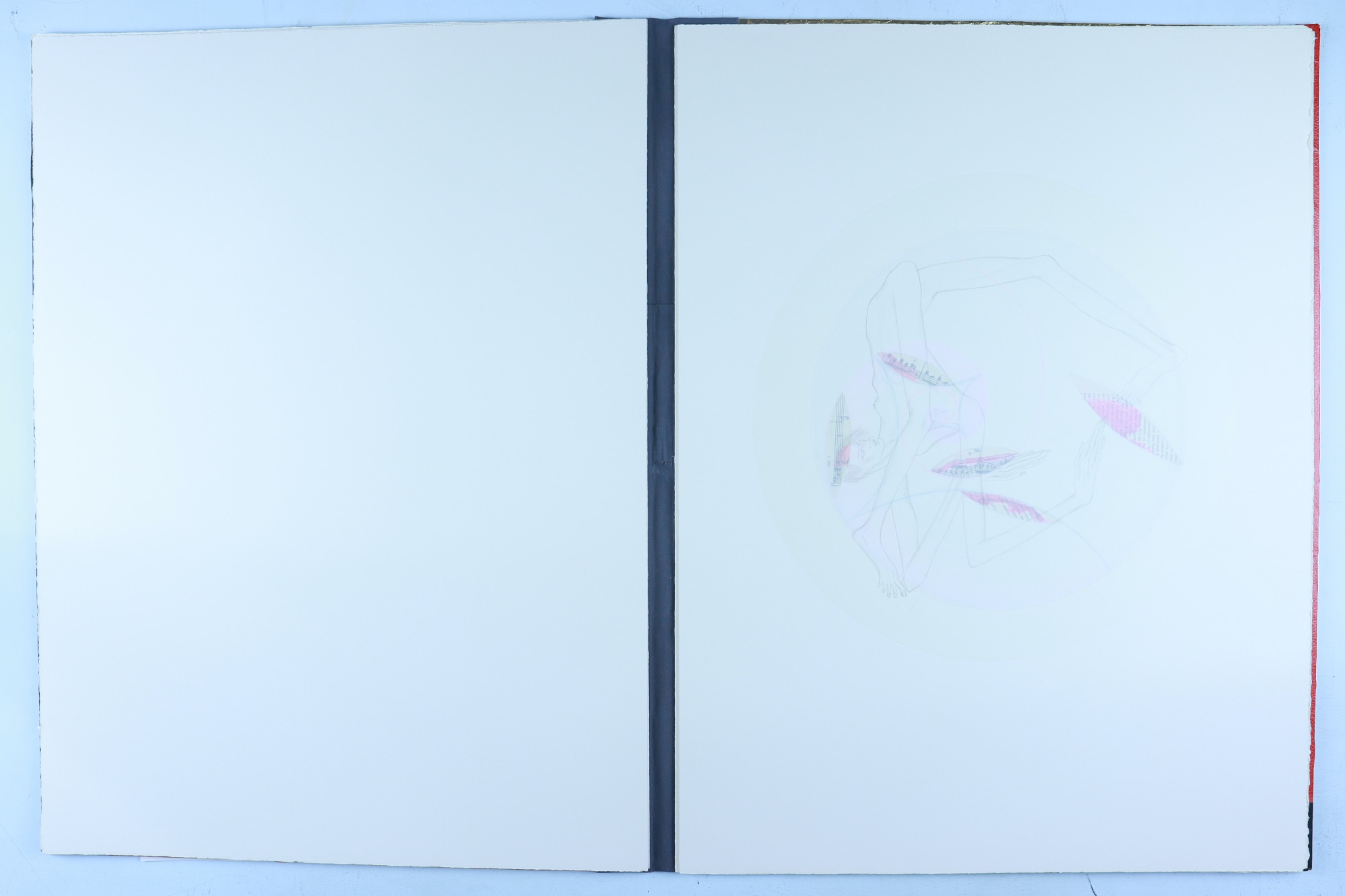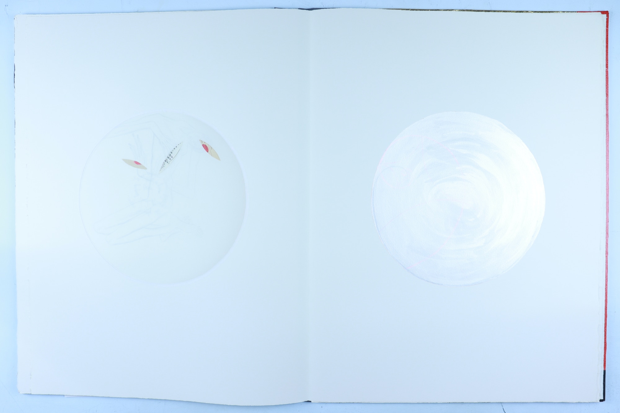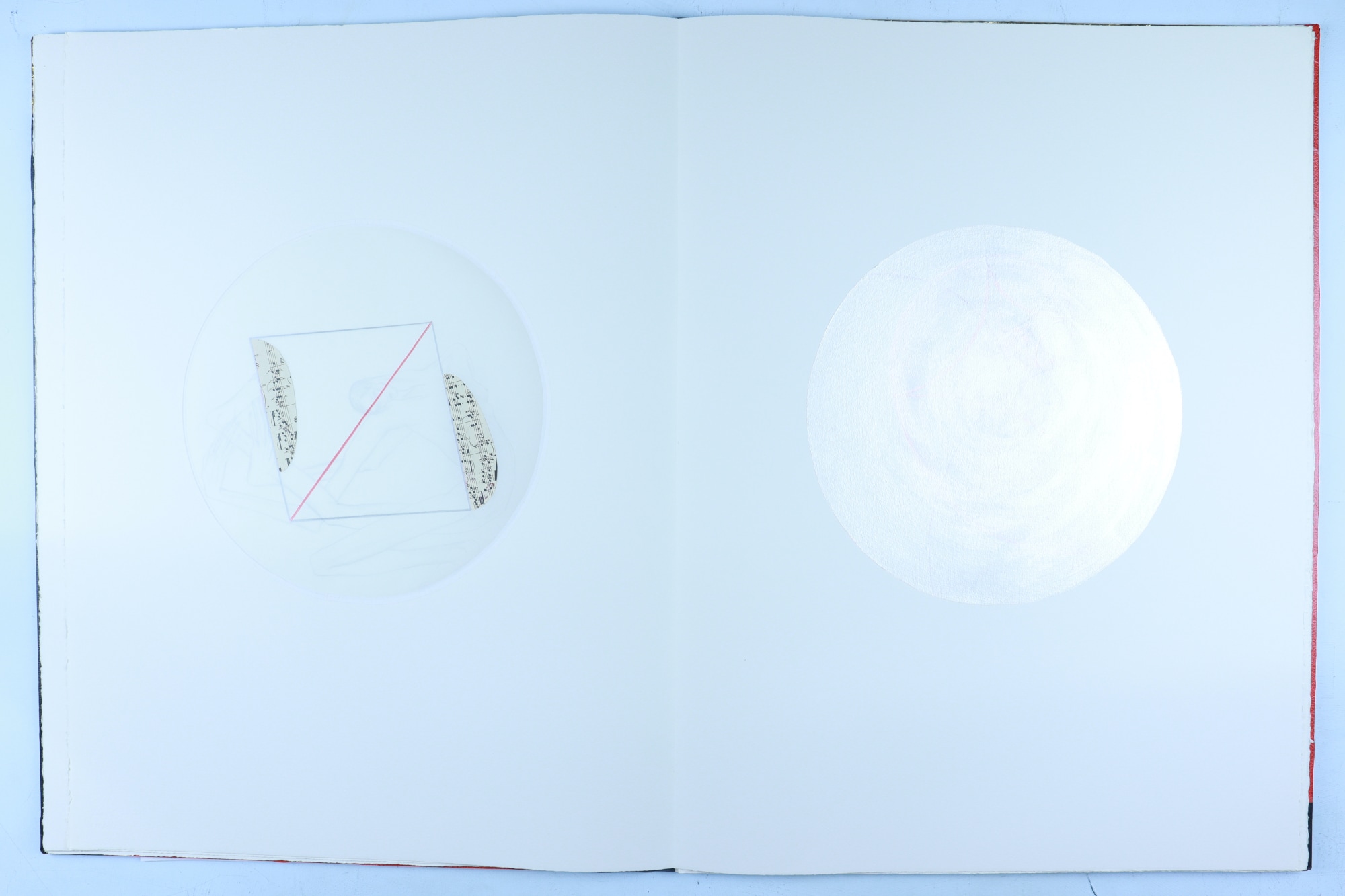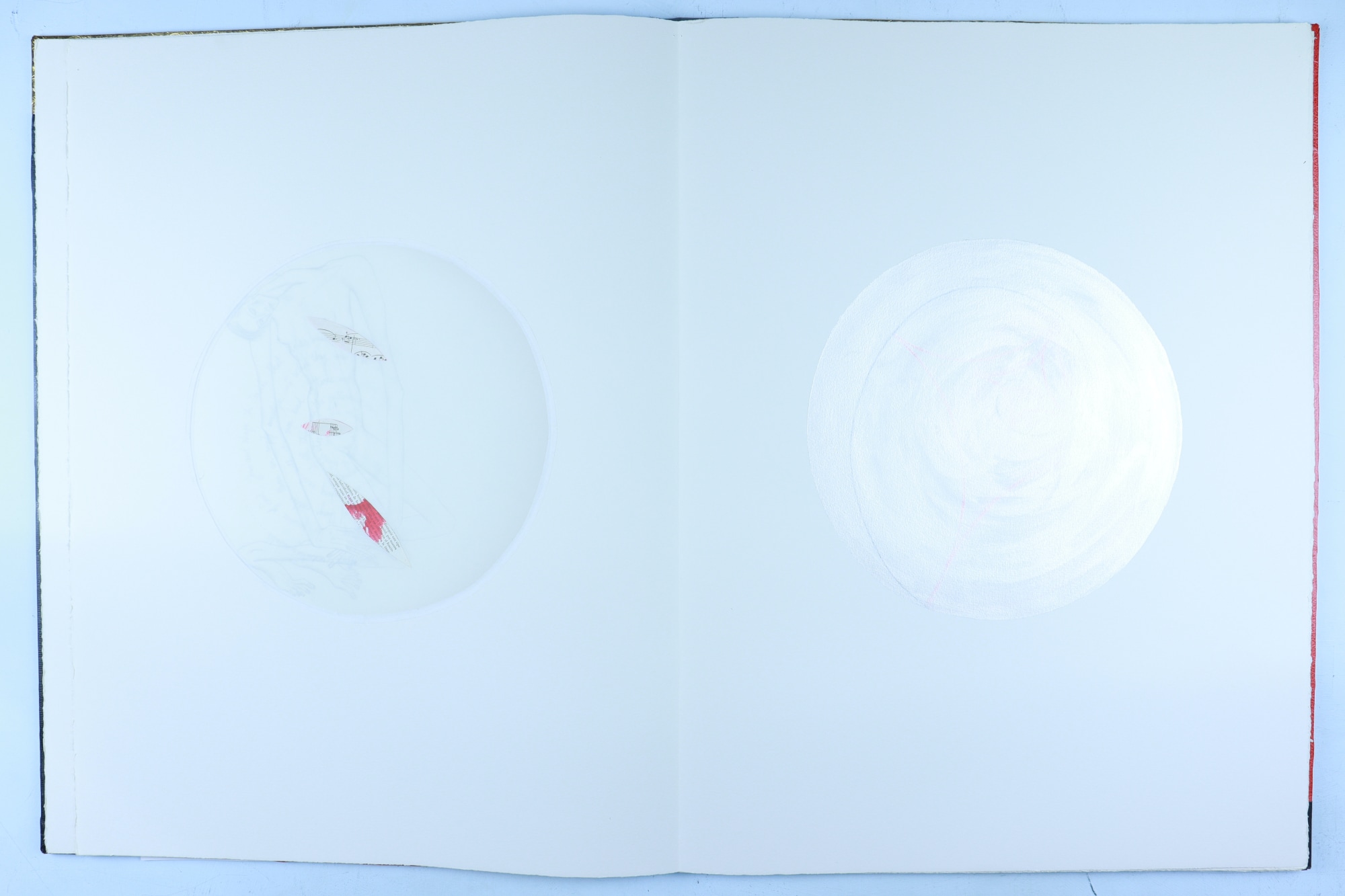 • Patterened paper, archival paper, vellum, foam core, iridescent acrylic paint, color pencil, graphite pencil, fabric, musical score, red ink