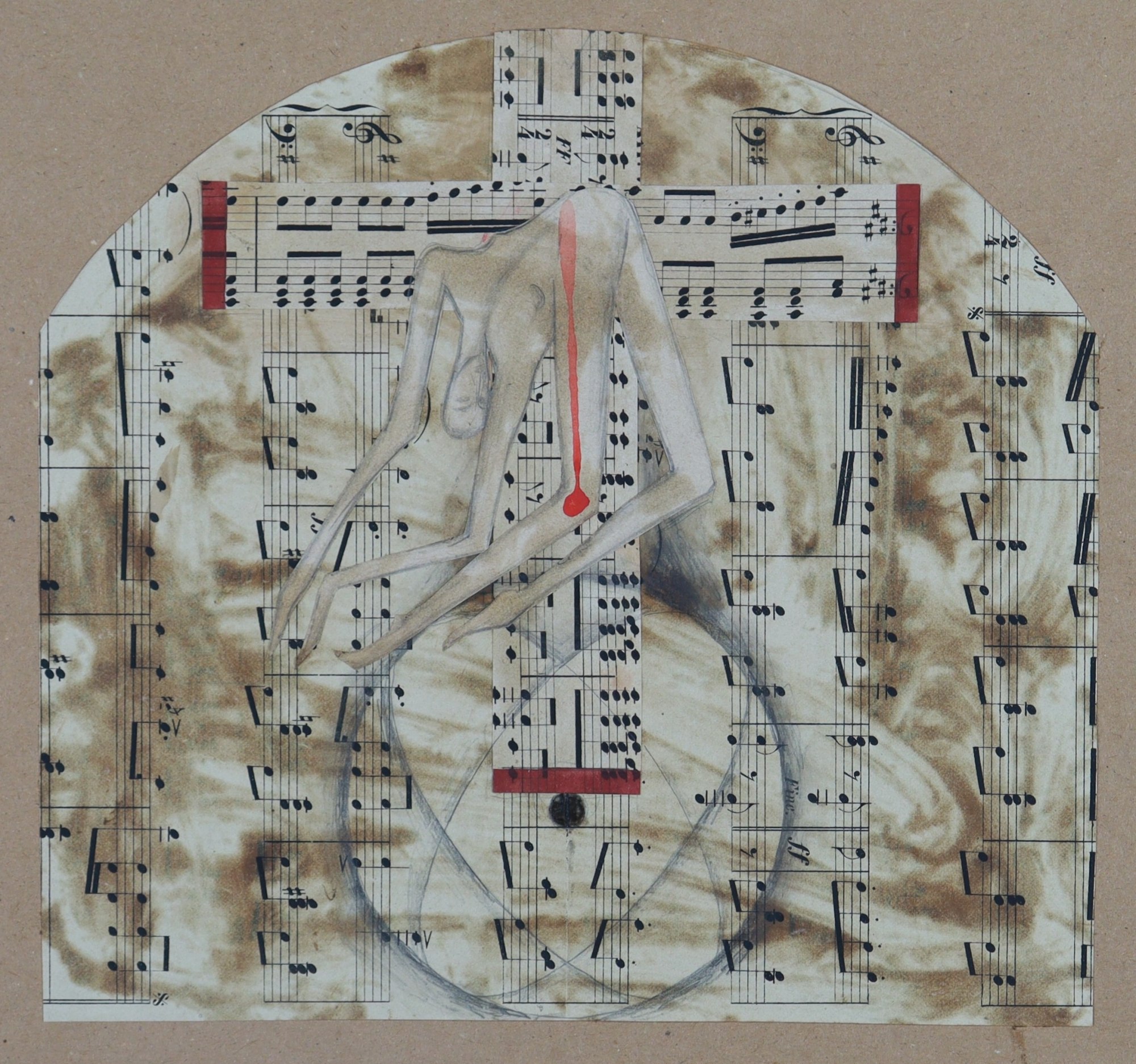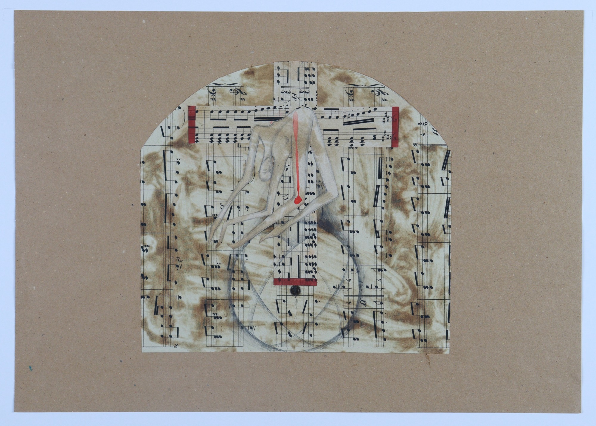 vintage musical score, red ink, graphite, color pencil, red paper