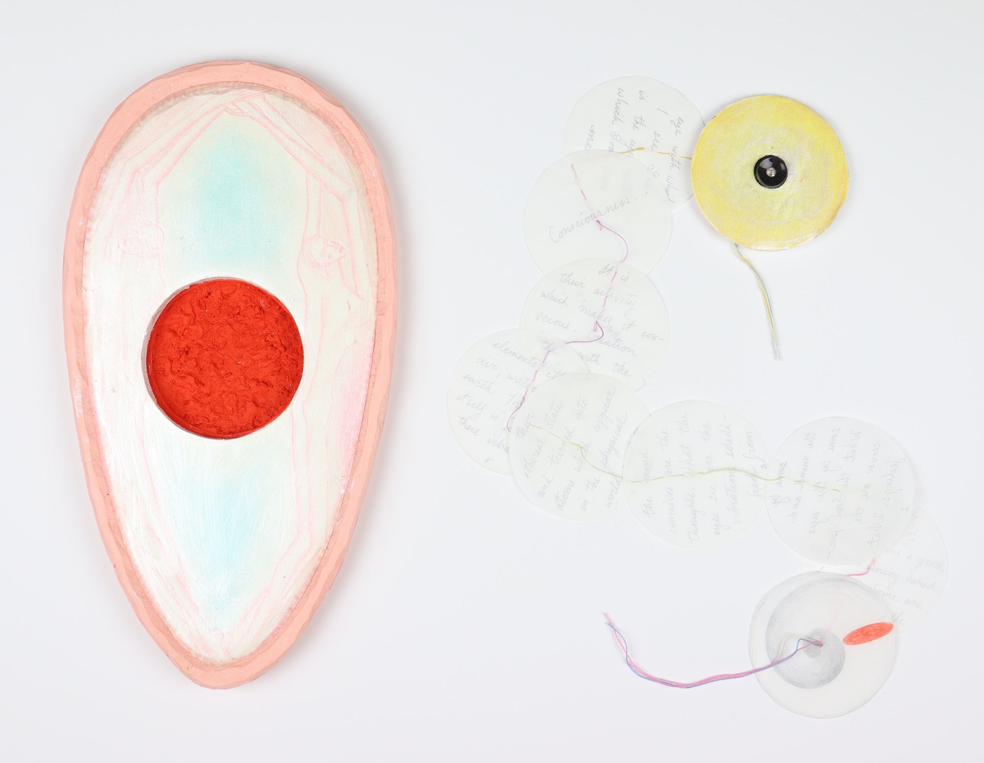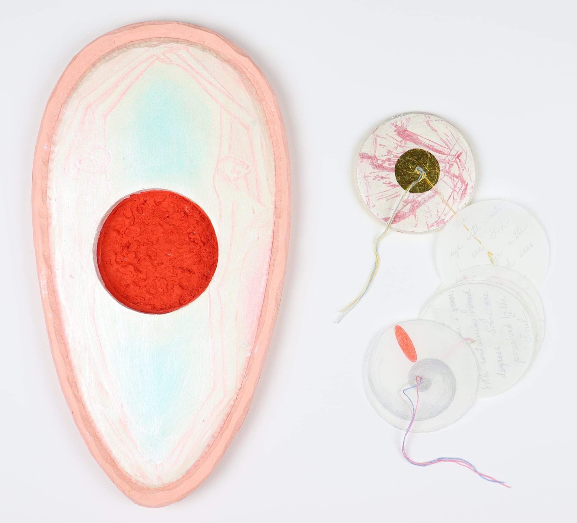 Hand carved and painted head shape with hidden circle alcove with threaded tracing paper discs inscribed with artist text. Can be displayed with text hidden in alcove or cascading down.