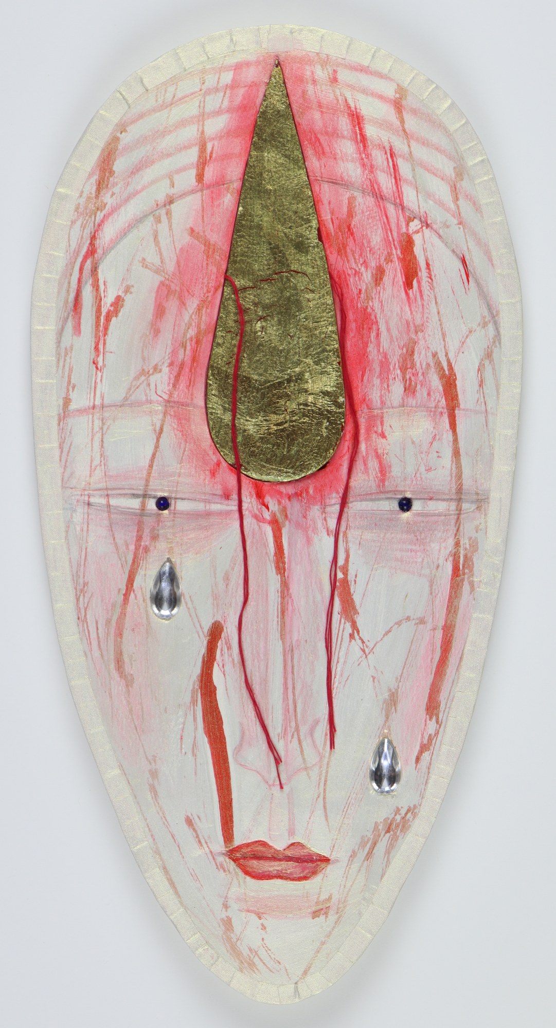Handcarved and painted face with hidden tear drop shaped alcove at the third eye hiding a string of hand-written artist text on tracing paper