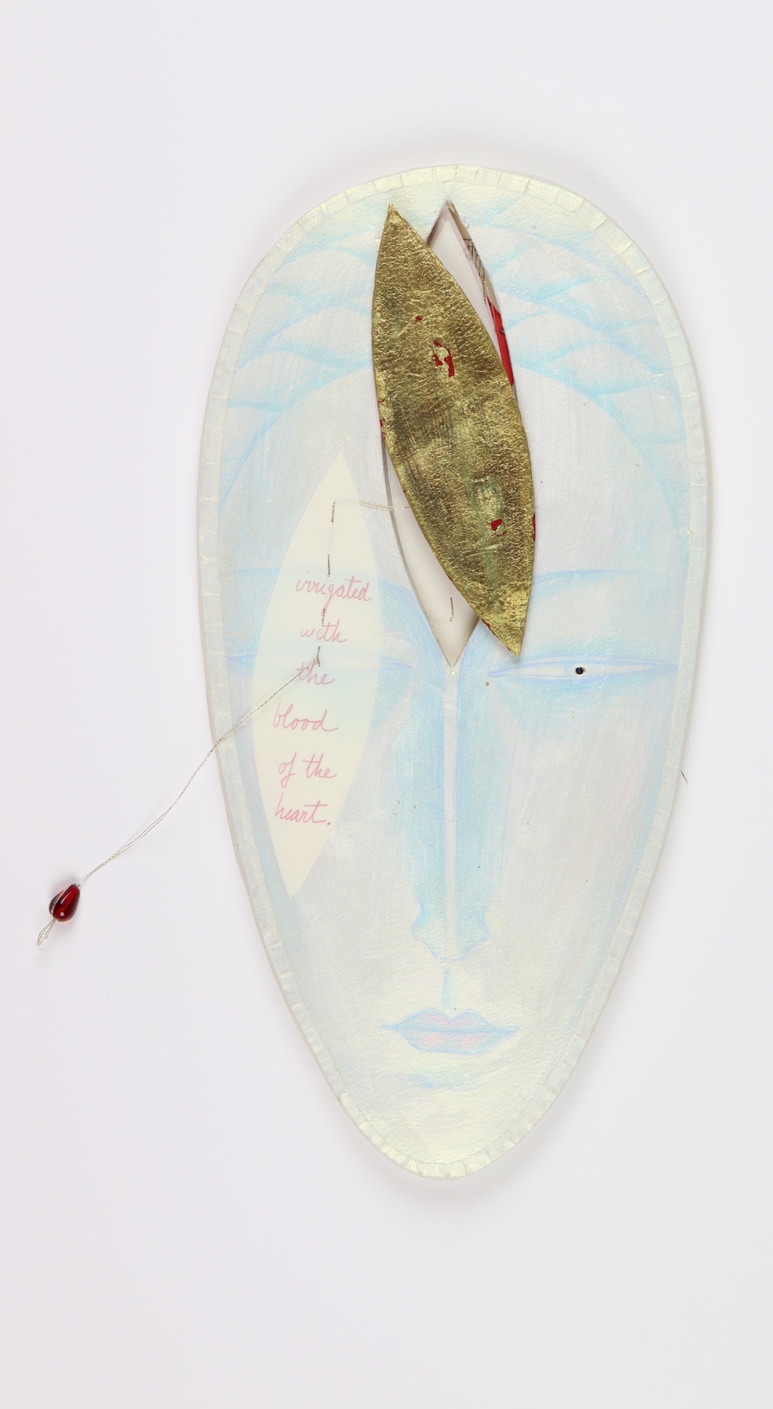 Handcarved and painted foam core face with hidden string of tracing paper pieces inscribed with artist's text and musings. These can all be hidden in a third eye alcove on the face. Display open or closed