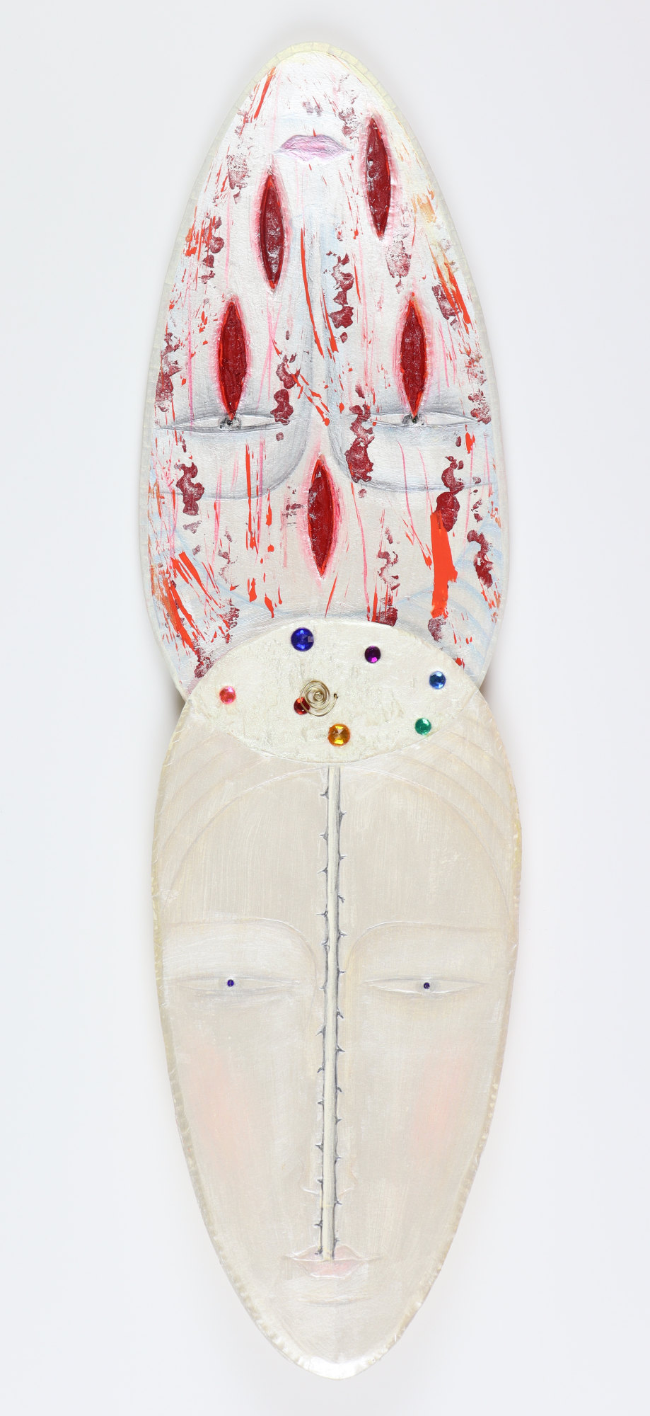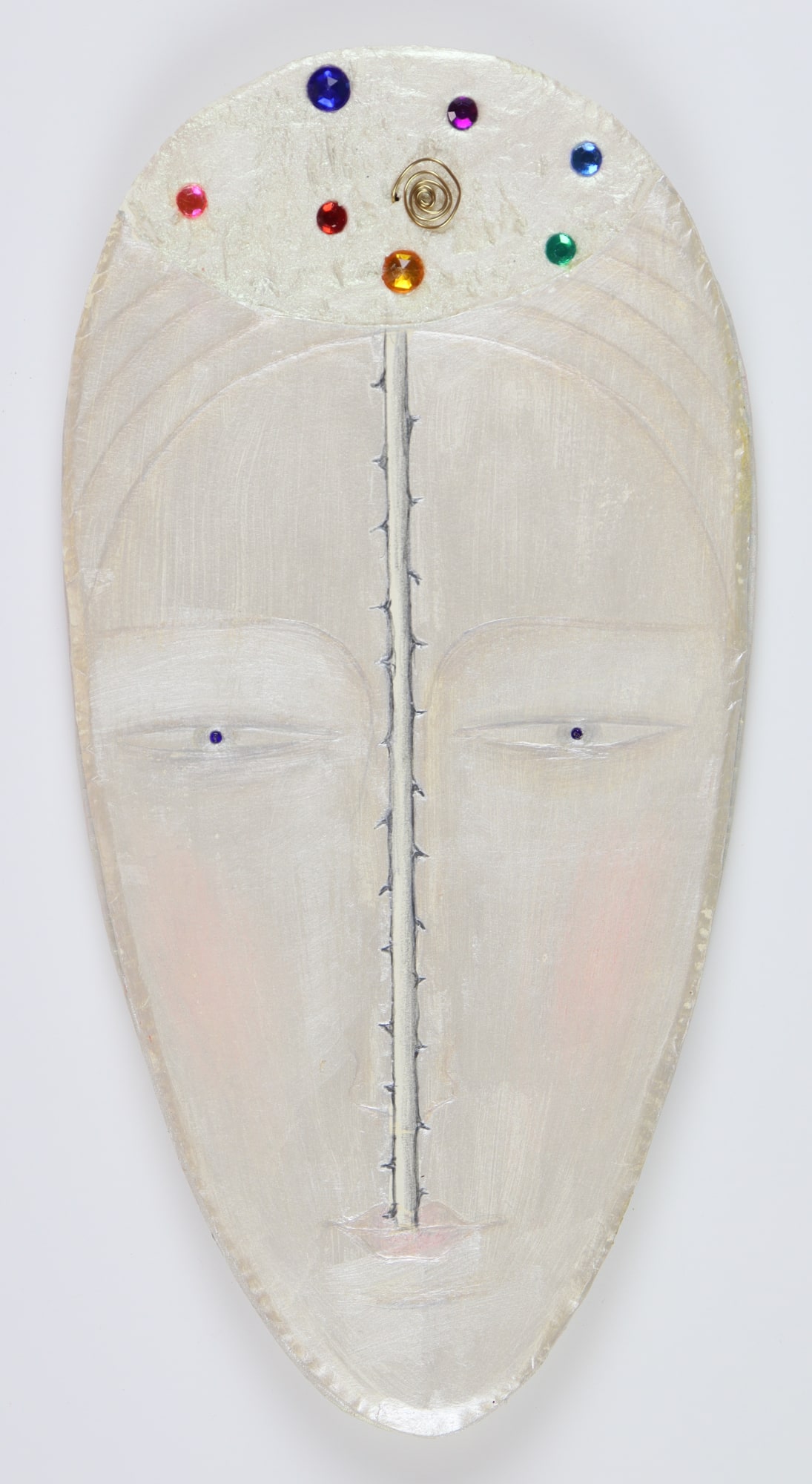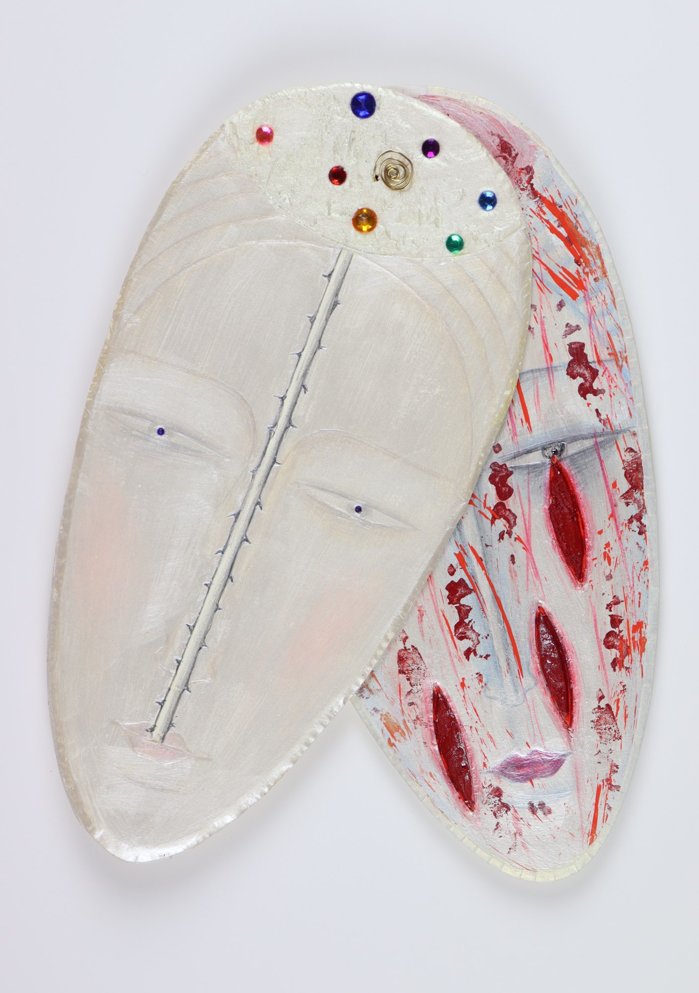 Handcarved and painted foam core face with inlaid gems wired together to another hand carved and painted face beneath. They swivel open and can be displayed either open or closed