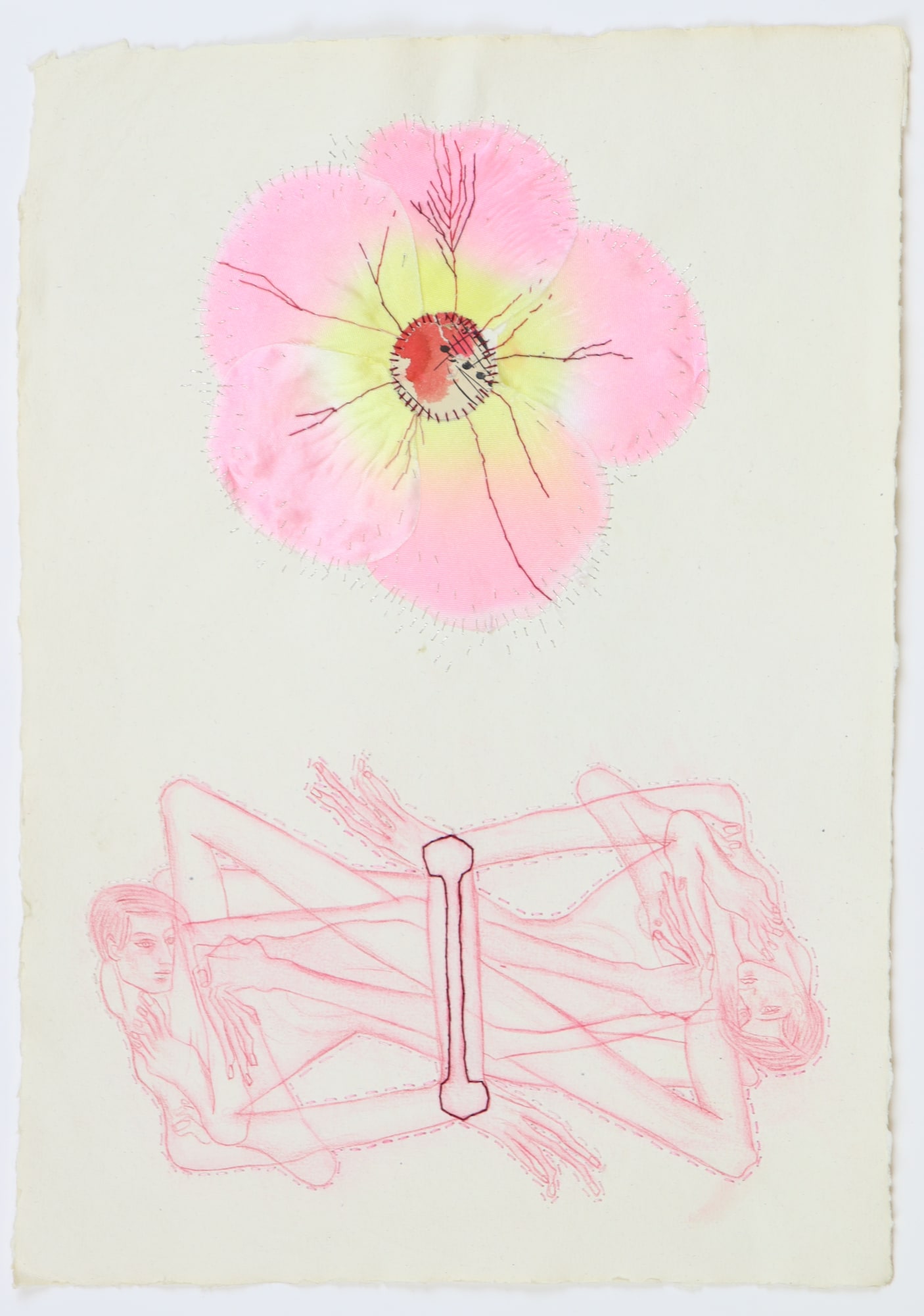 Color pencil drawing on rag paper, with embroidery and fabric flower