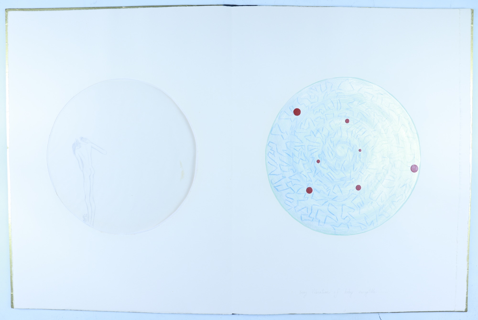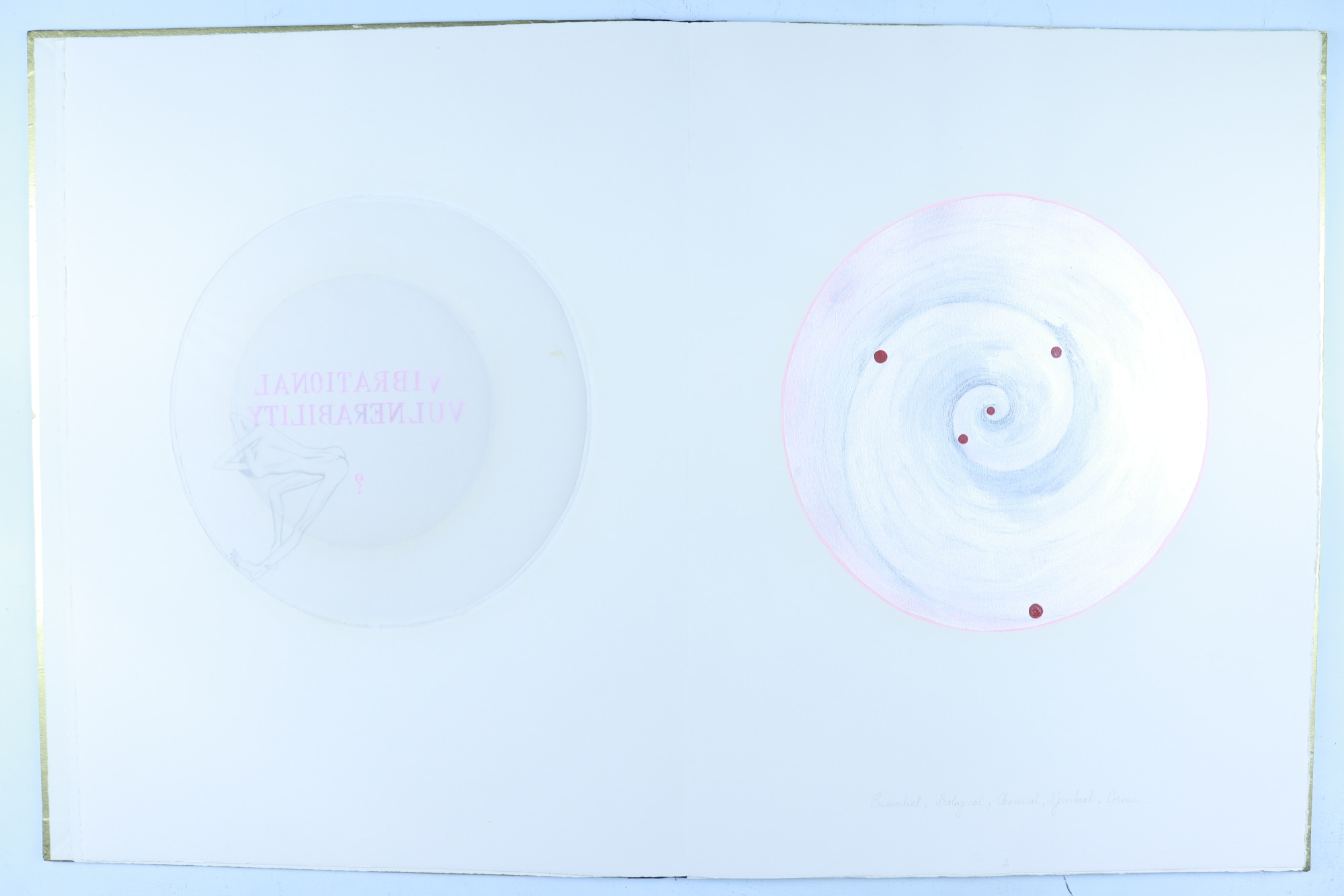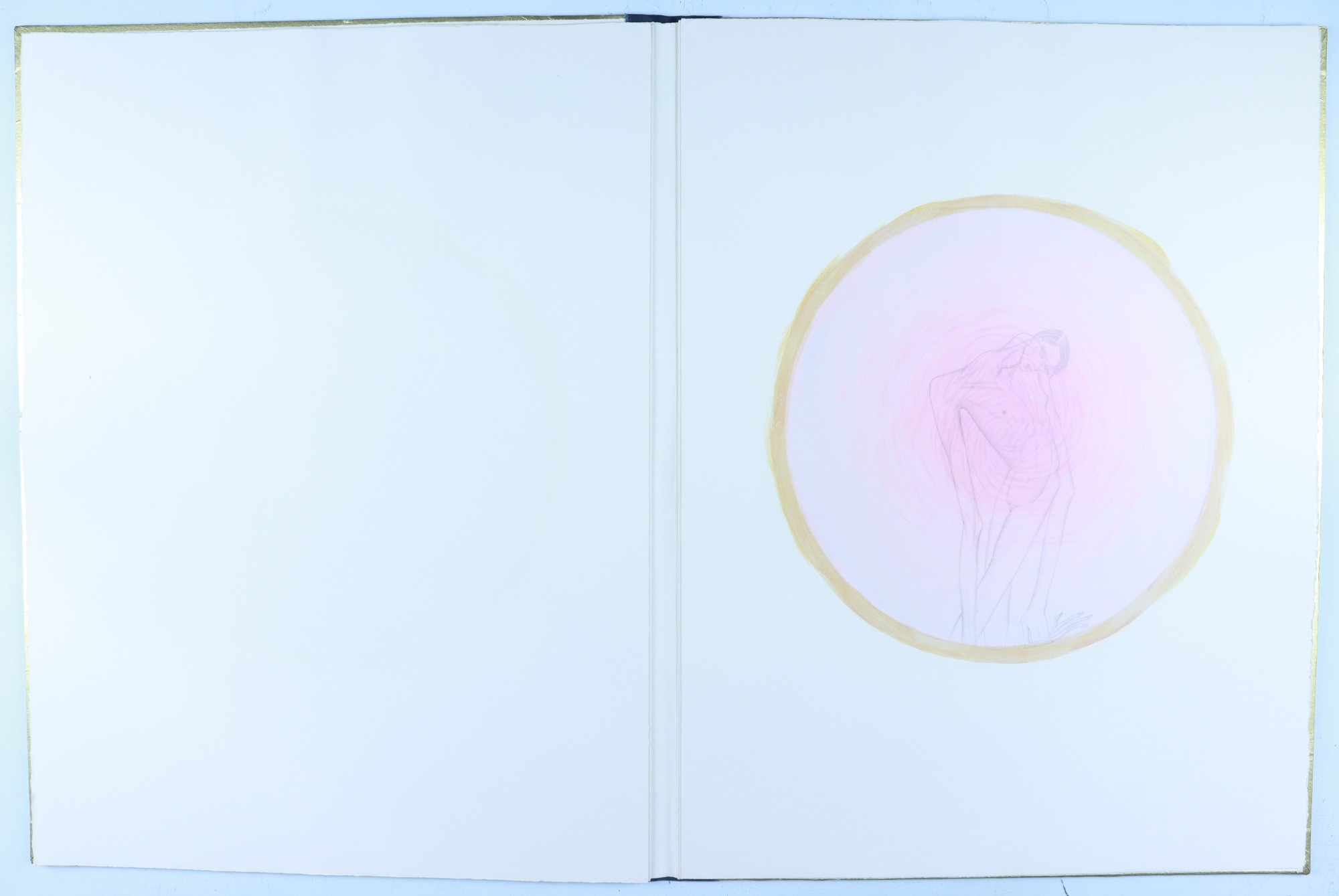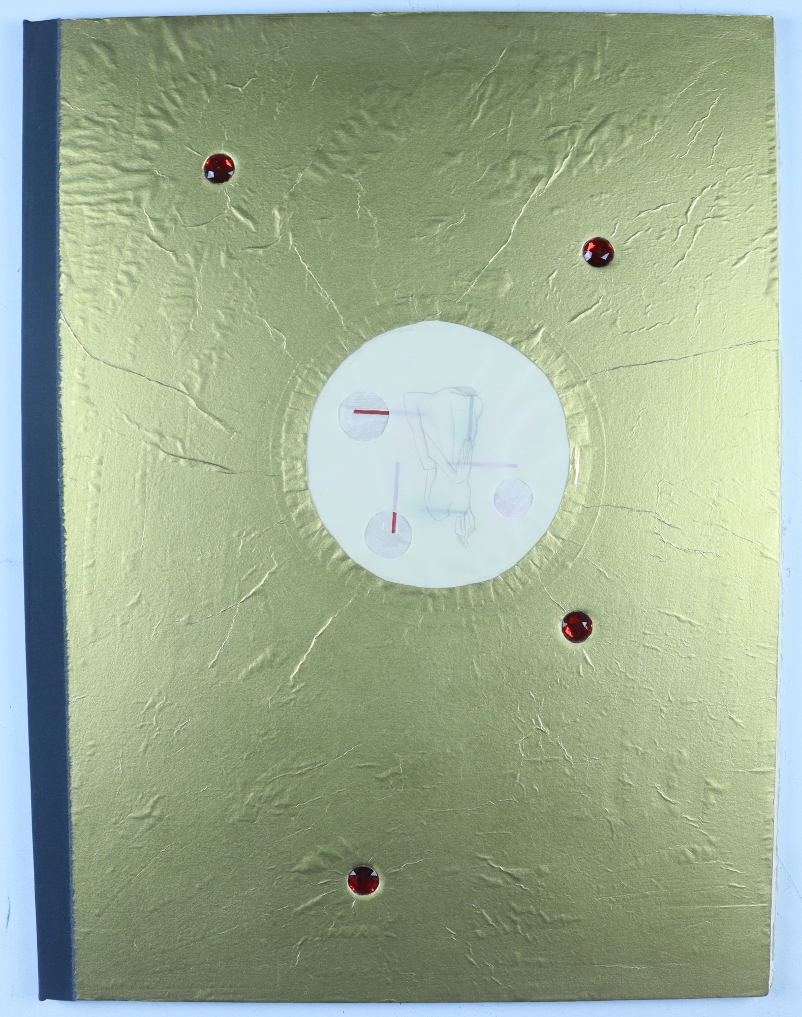 Vellum, archival paper, foam core, gold paper, plastic gem stones, iridescent paint, color pencil, graphite pencil, fabric