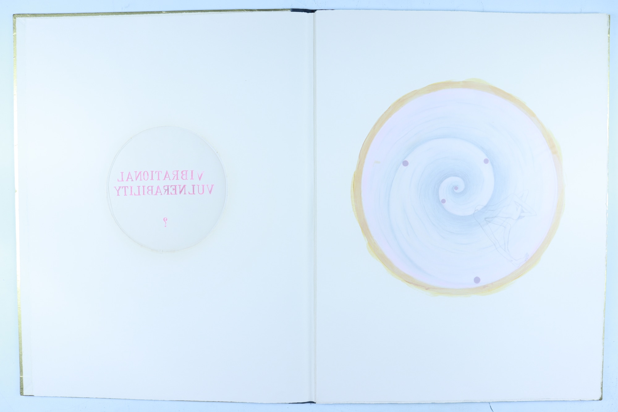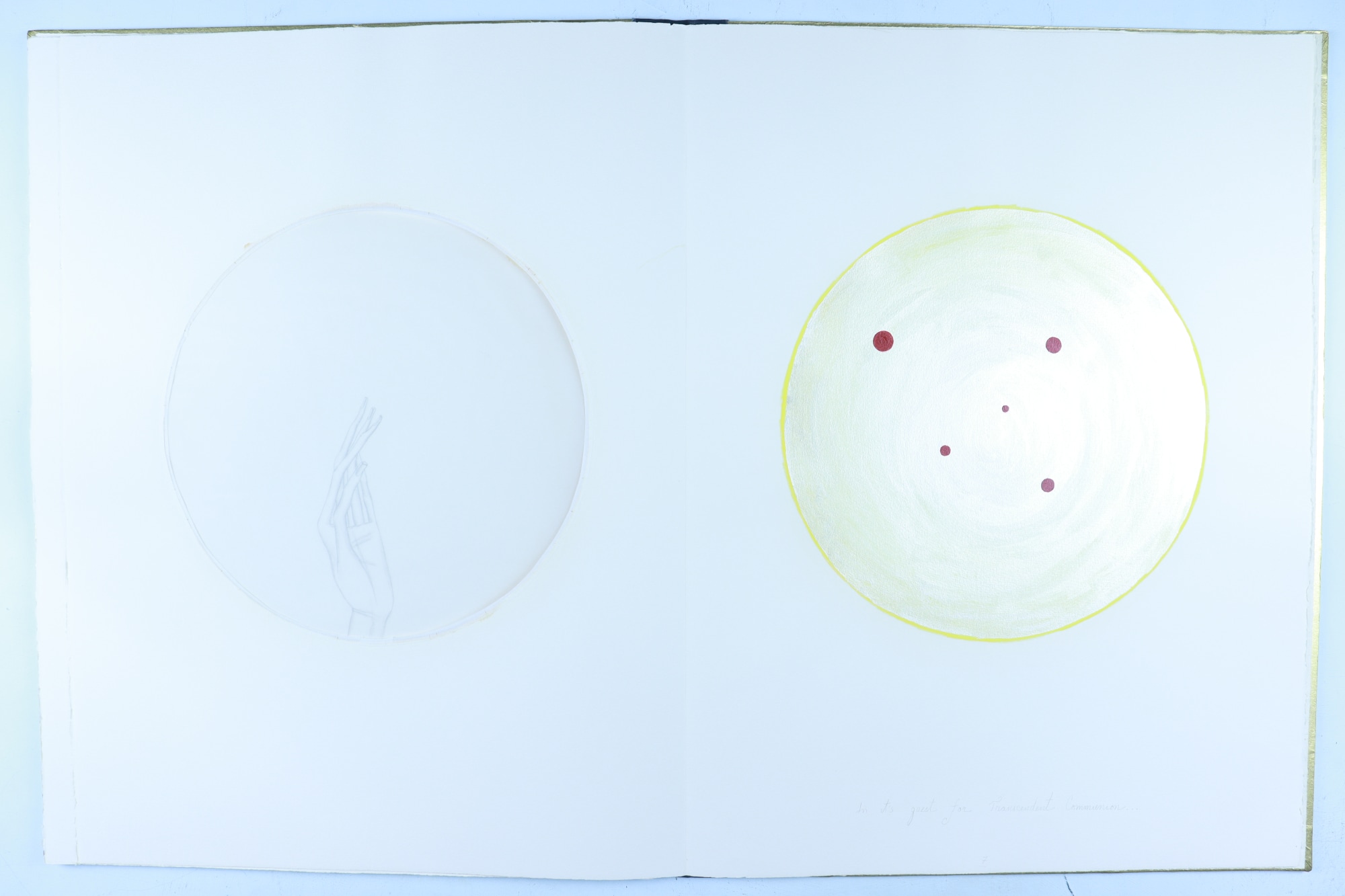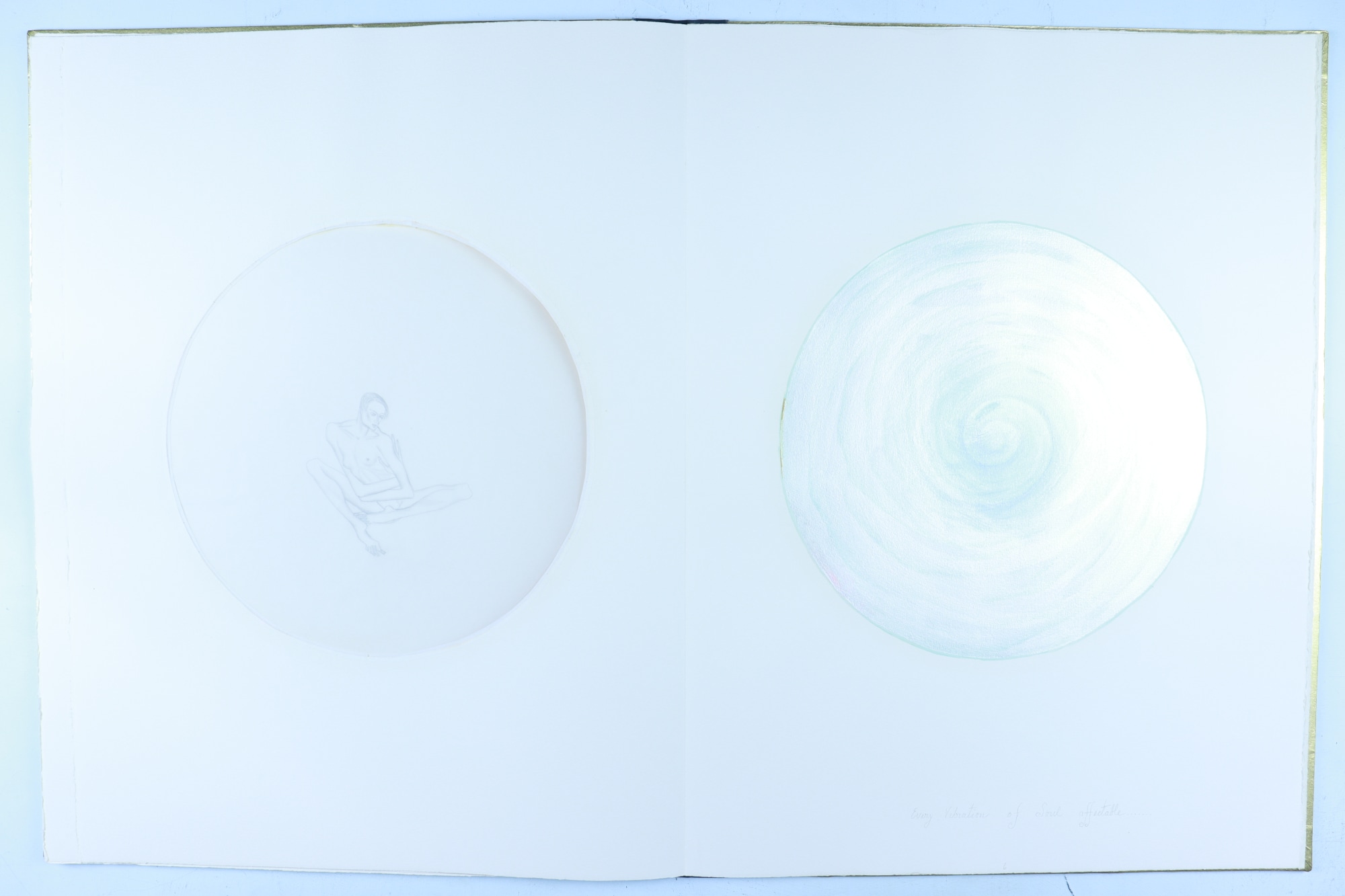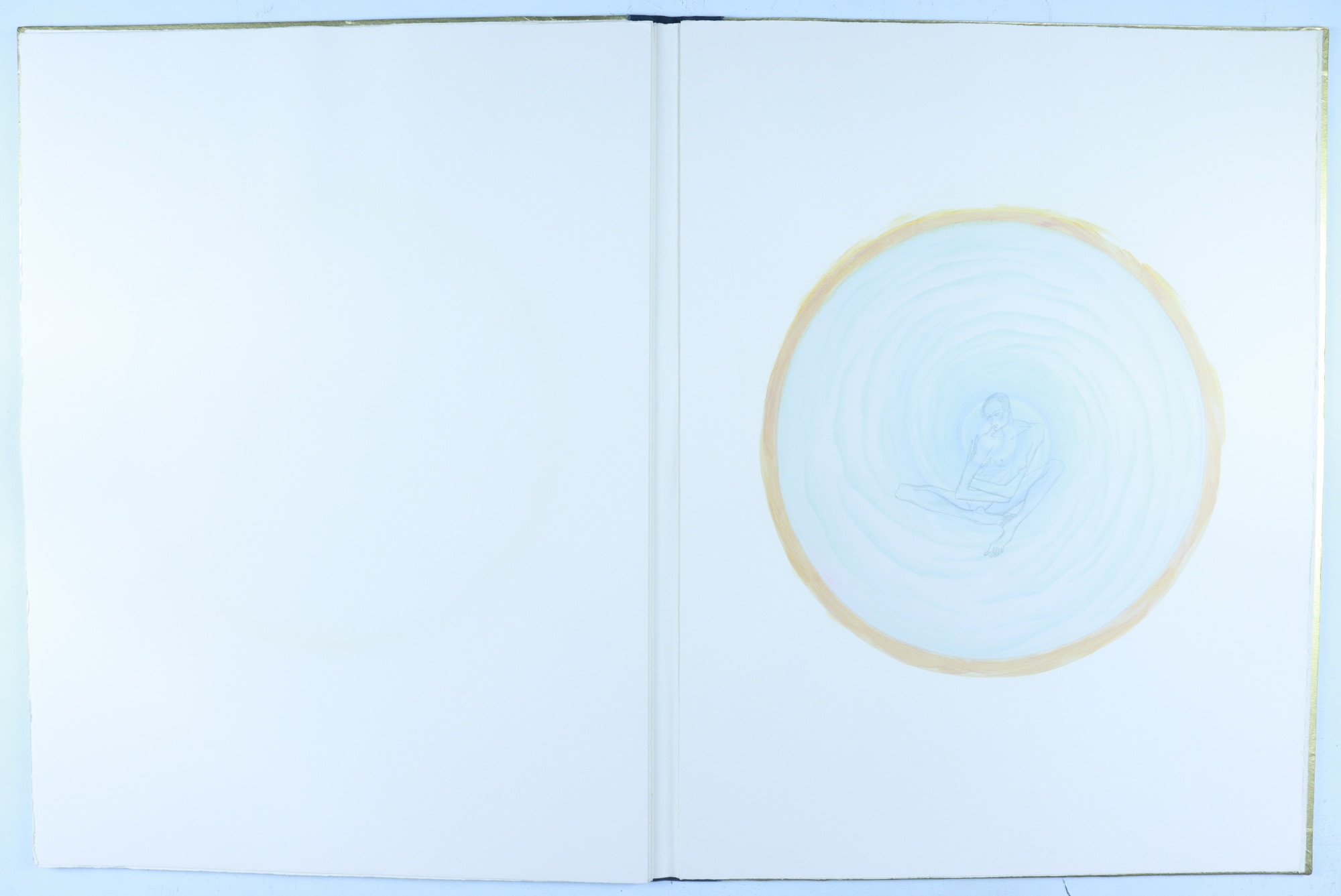 Vellum, archival paper, foam core, gold paper, plastic gem stones, iridescent paint, color pencil, graphite pencil, fabric