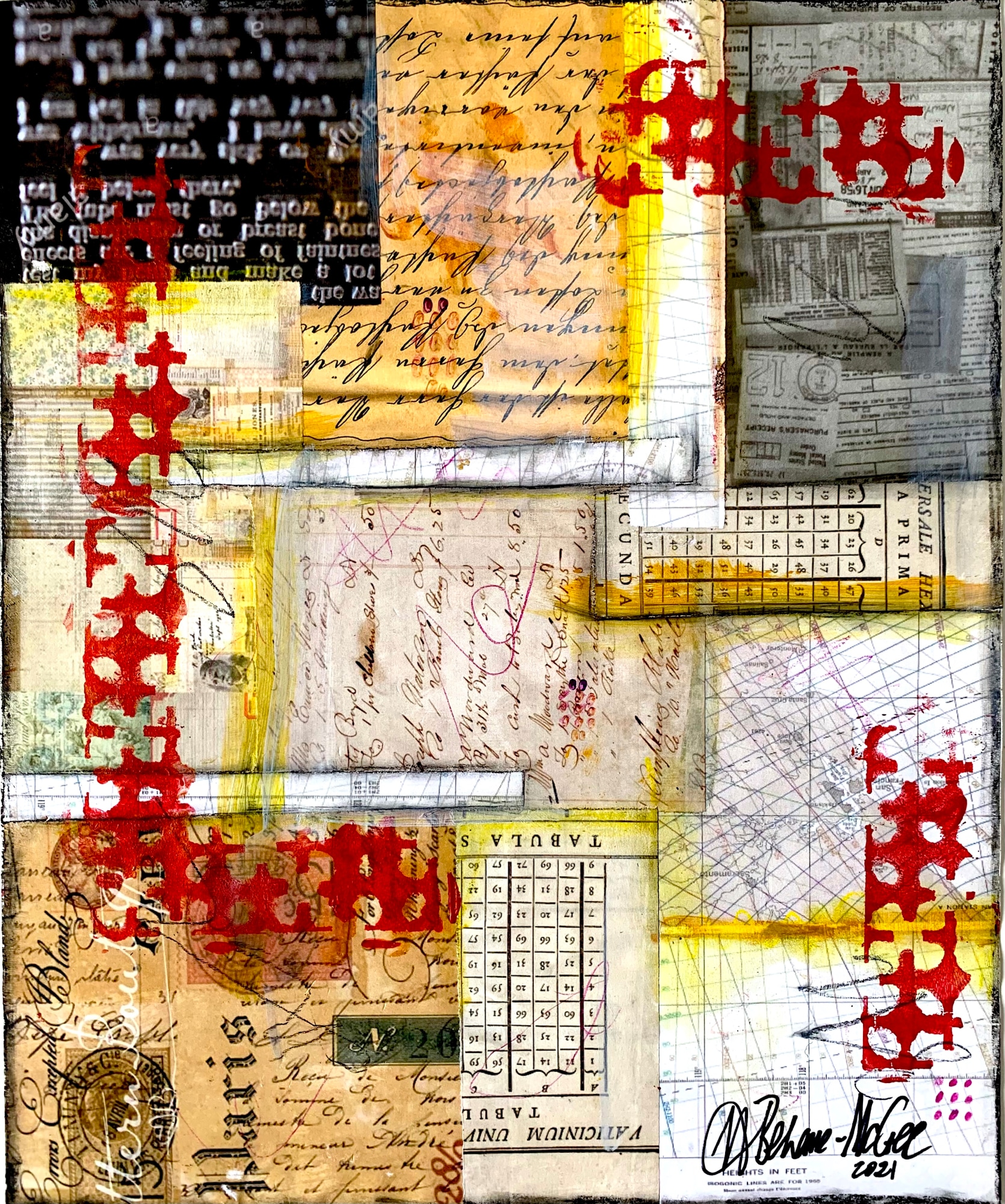 Original collage artwork using acrylic with printed tissue, collage paper and stenciling printed on paper.