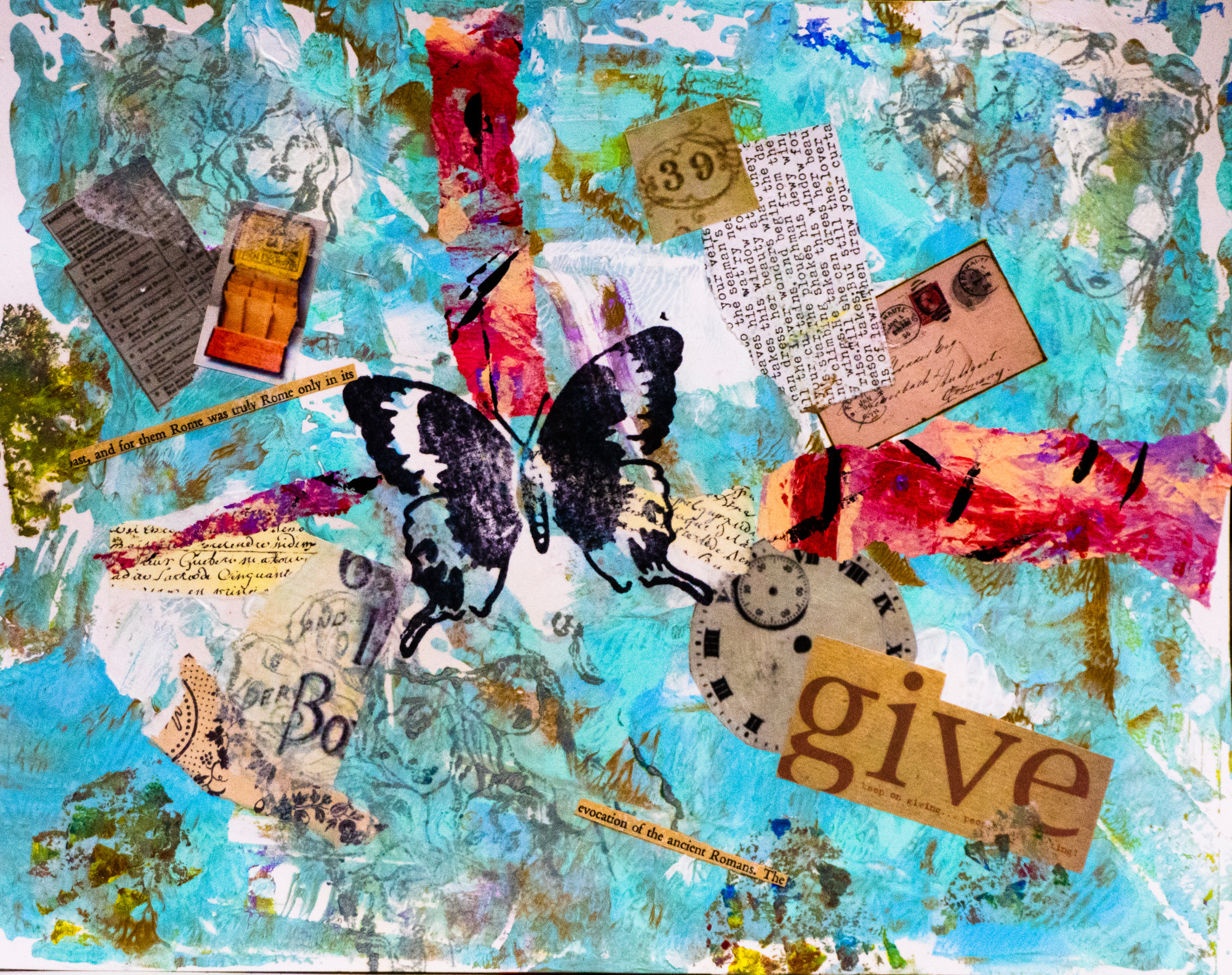 - Subject Matter: Abstract, collage, acrylic, butterfly, stencil, collage paper, stamping, printed tissue