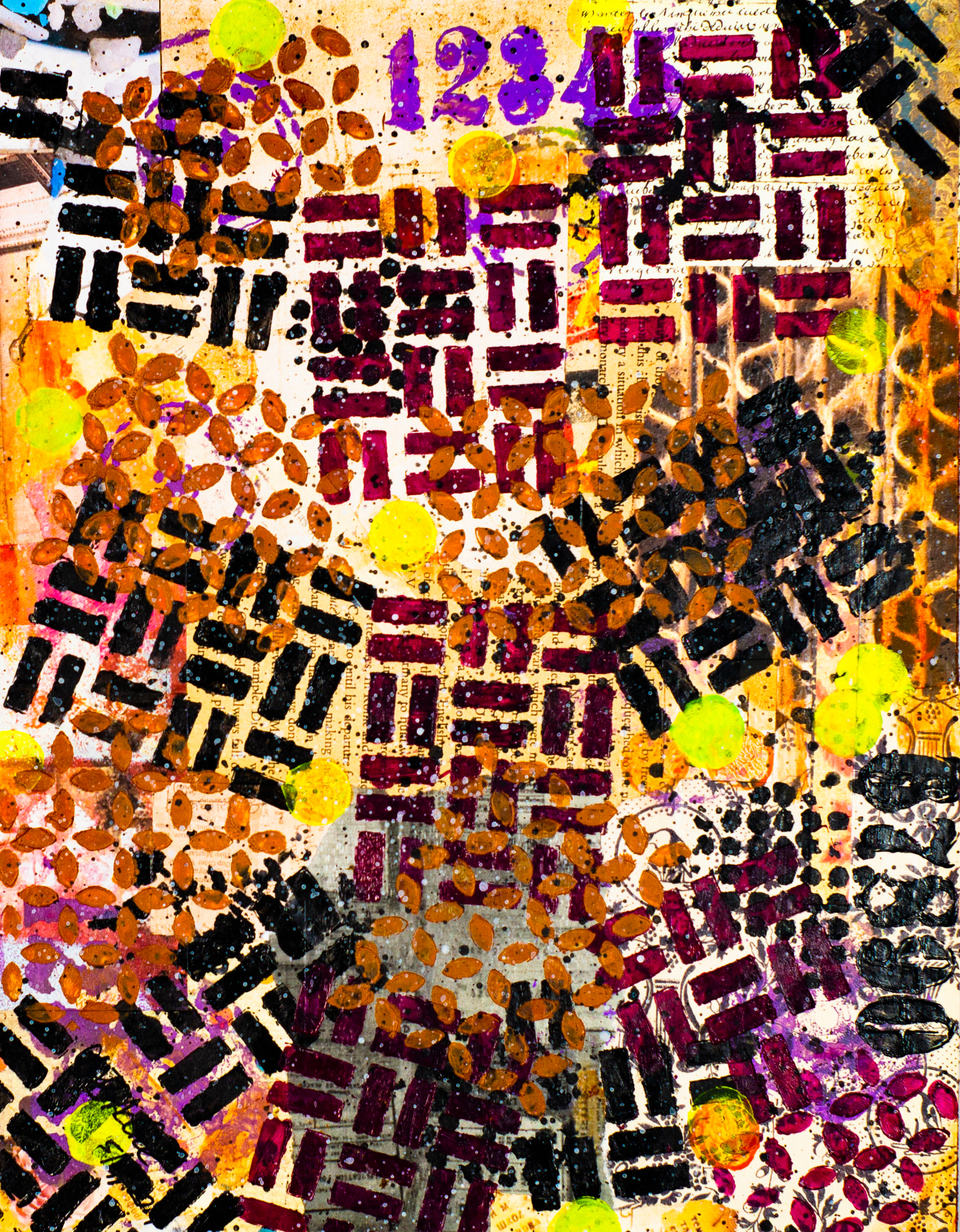 - Subject Matter: Abstract acrylic, grids, stencil, collage paper, stamping